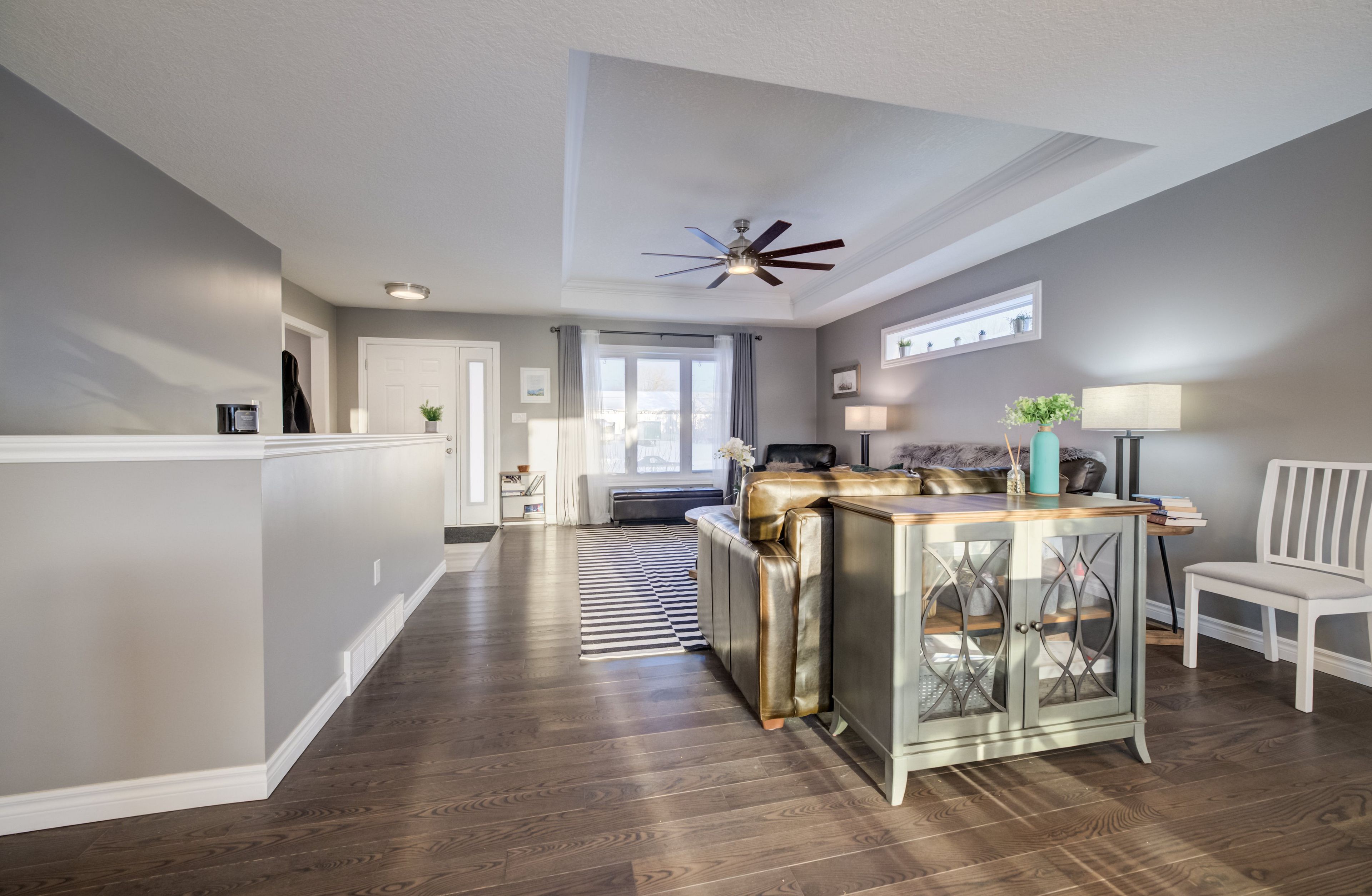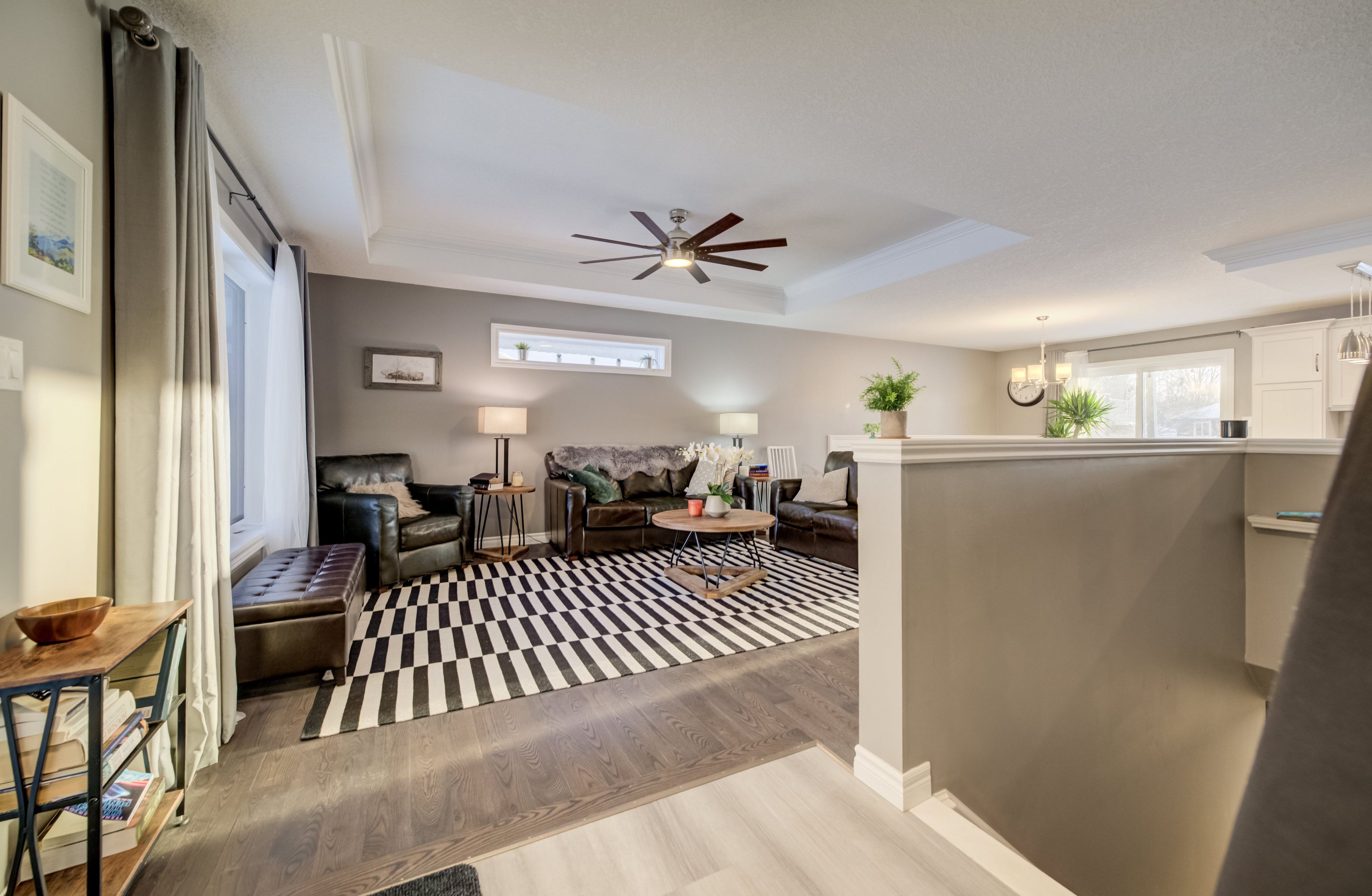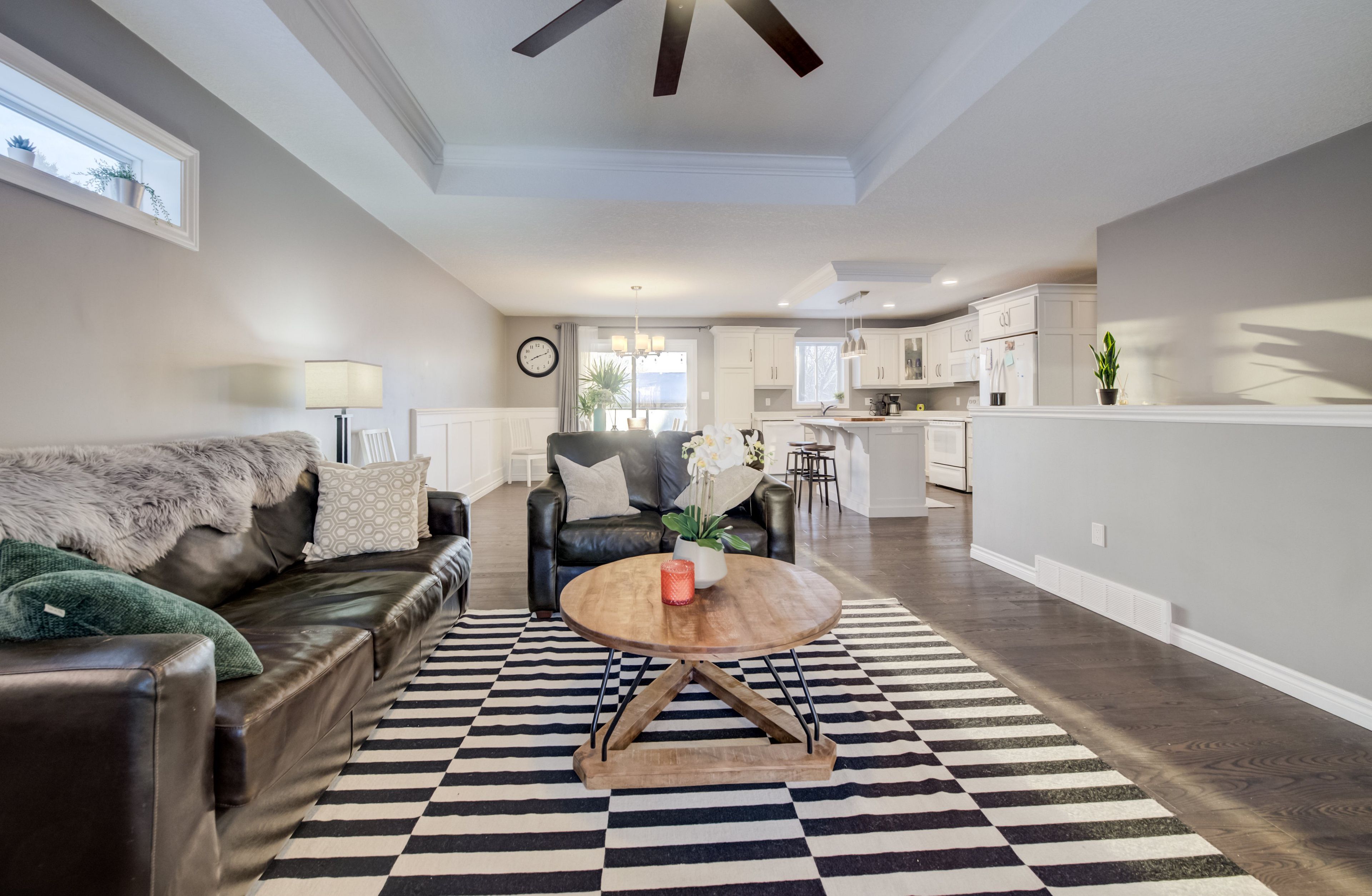 • Custom kitchen and bright living room with tray ceiling.