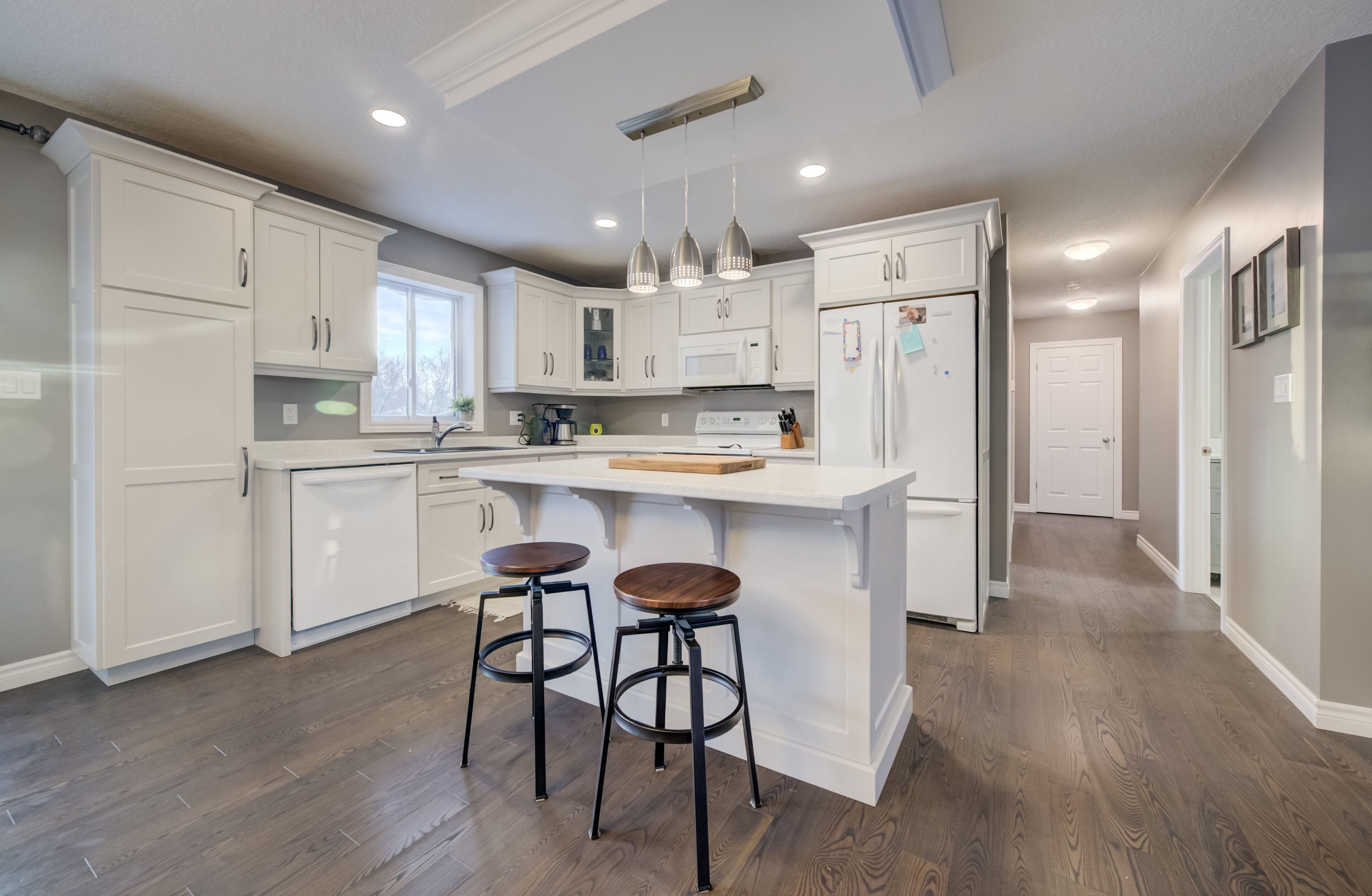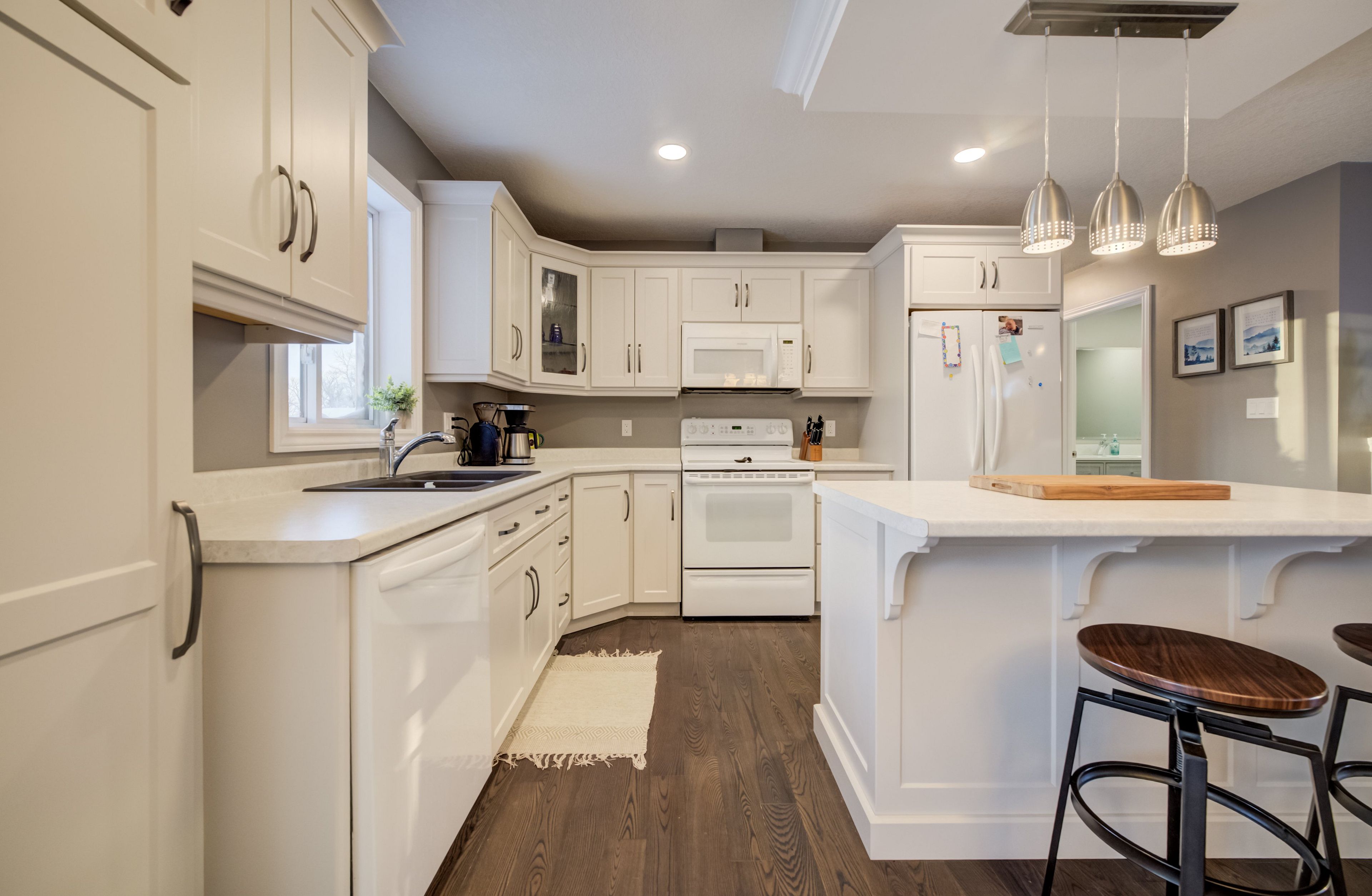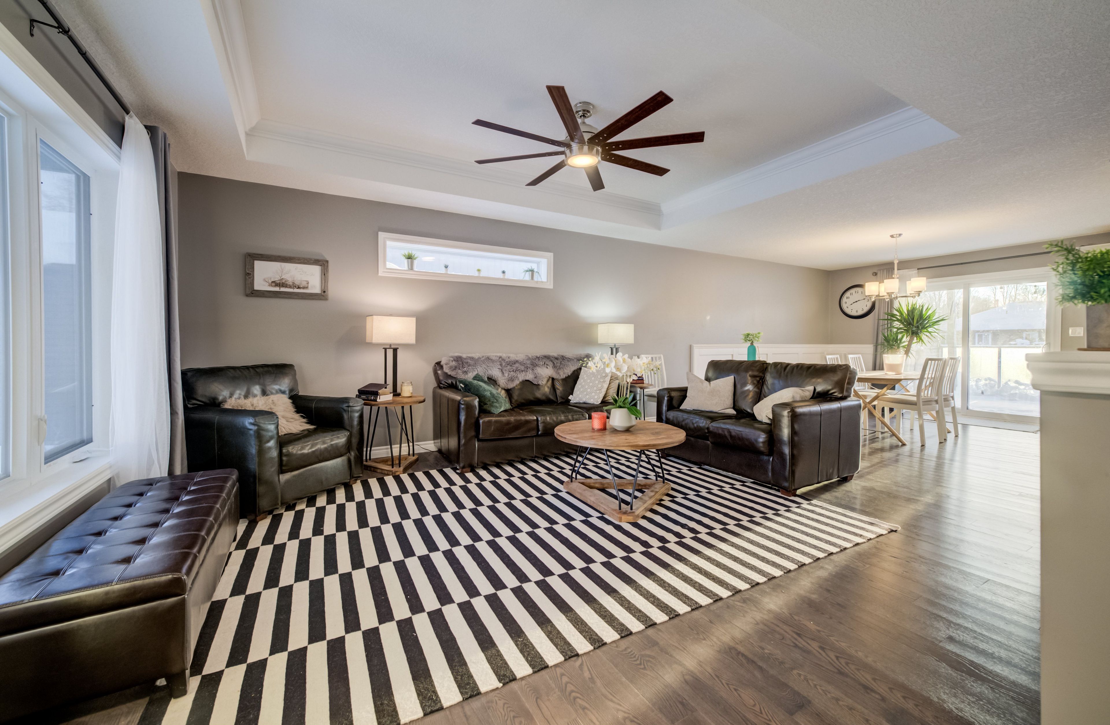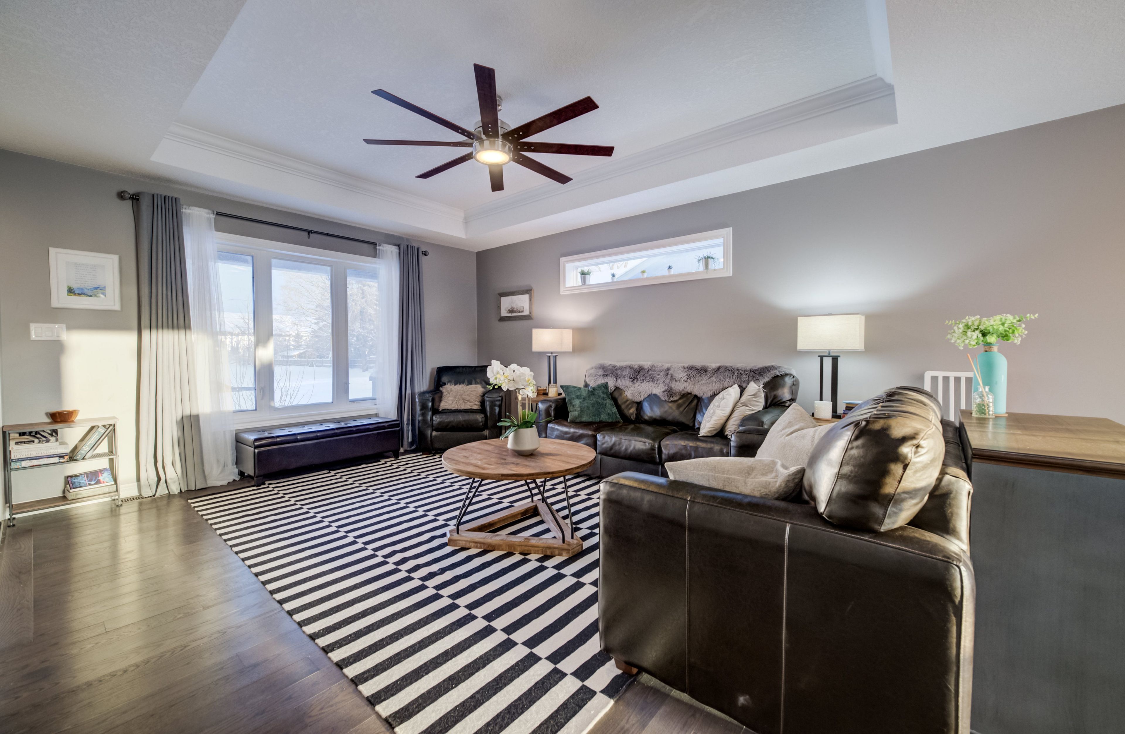 • Custom kitchen and bright living room with tray ceiling.