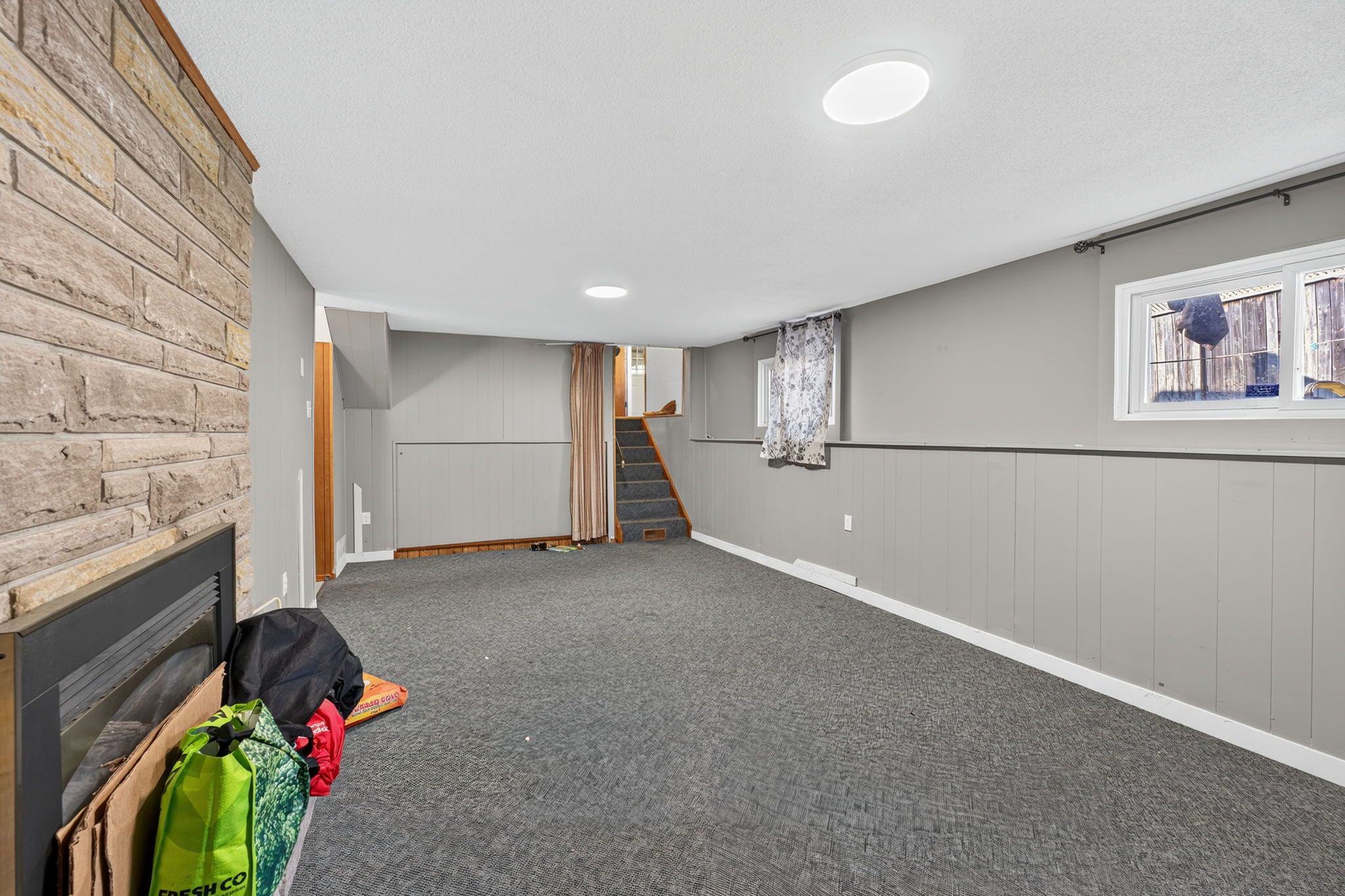 • Spacious recreation room featuring a cozy gas fireplace for relaxation.