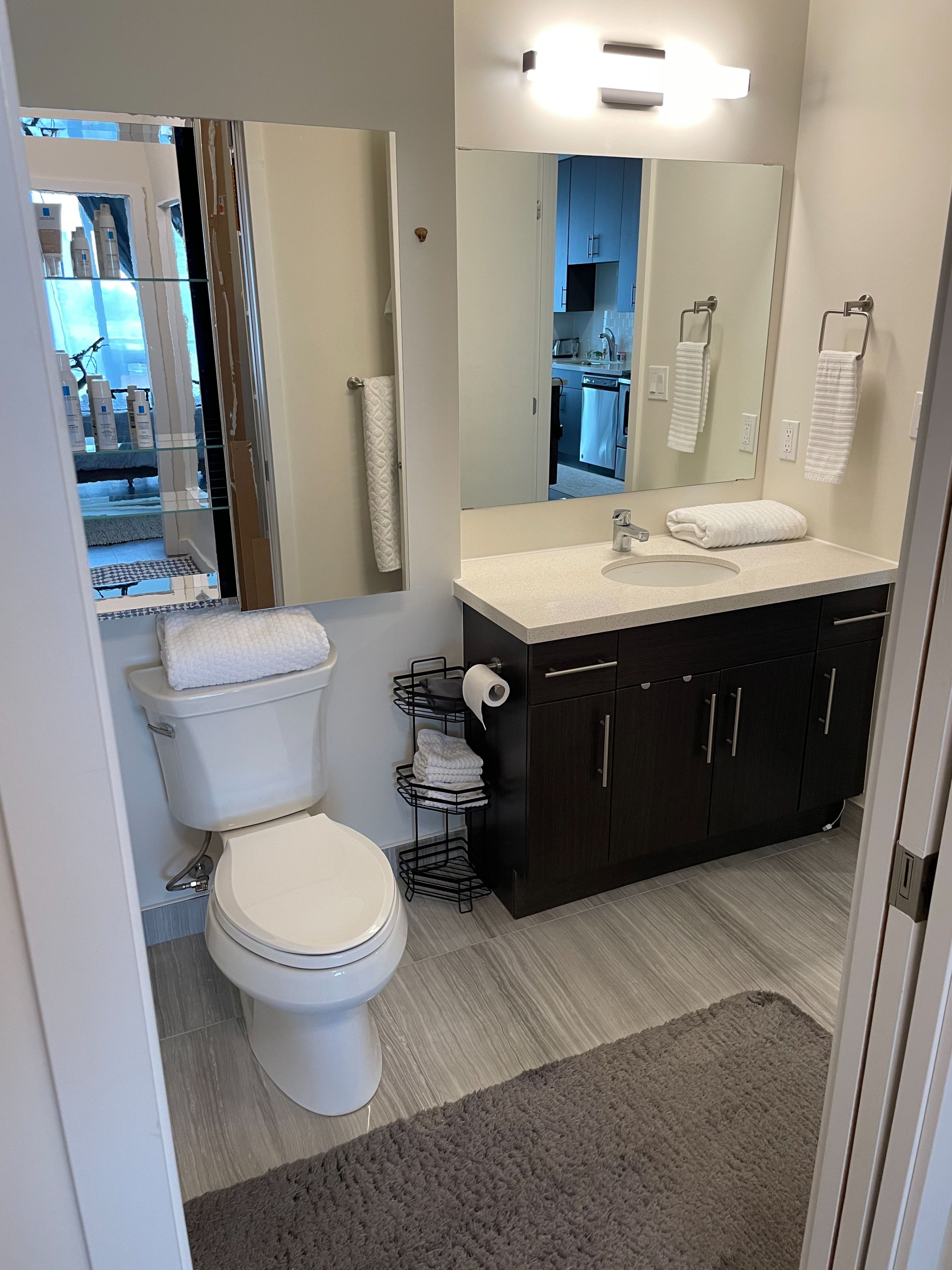 • Modern kitchen features quartz countertops and stainless-steel appliances.