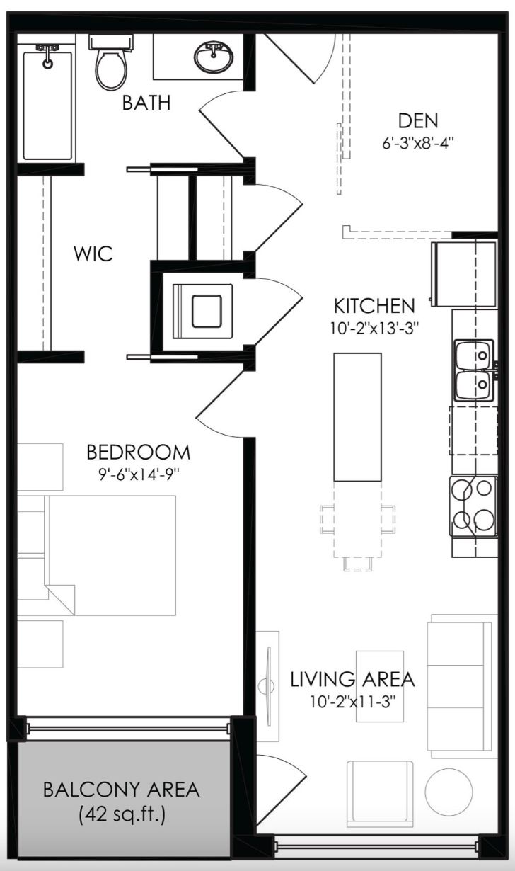 • Stylish 1 bedroom with high ceilings and spacious double-sided closet.