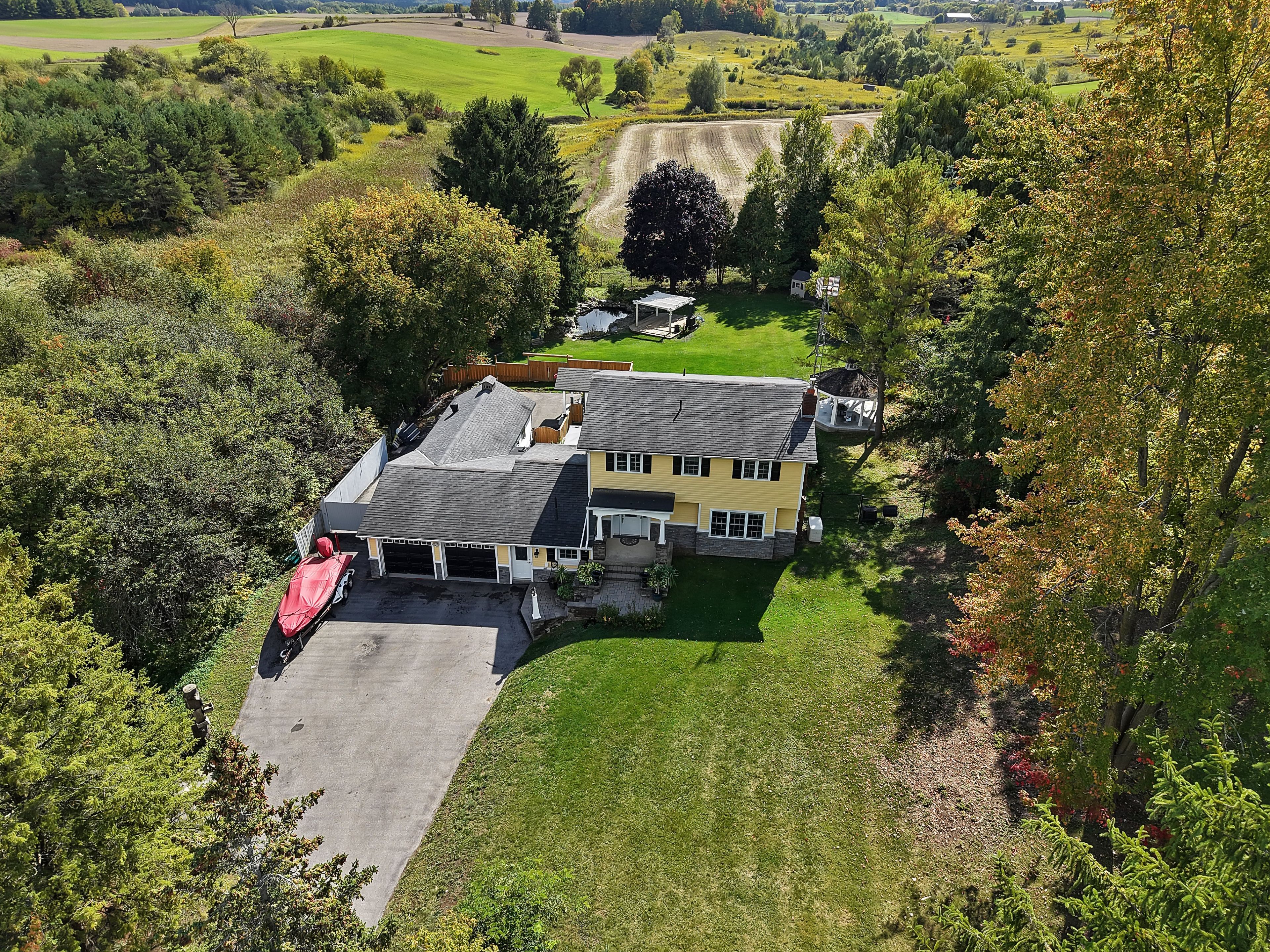This is not just a house its a lifestyle. Tucked away on nearly an acre of scenic countryside, this remarkable residence blends timeless craftsmanship with modern comfort. Every corner showcases an unmatched level of care, from the finely detailed millwork and elegant wainscoting to the chef-inspired kitchen designed for both function and flair. Sunlit windows frame serene views you'll cherish day after day. The luxurious primary suite offers a peaceful haven with its own lounge or office area, perfectly positioned to capture sweeping southerly vistas. Designed for relaxation and entertaining, the home features a sparkling swimming pond, a sprawling multi-level deck with automated awning, and thoughtfully landscaped outdoor spaces that invite year-round enjoyment. Car lovers will be captivated by the heated, insulated 3-car garage complete with a hoist and rear bay door all accessible by a private laneway with gated parking. Additional upgrades such as a newly renovated main bath, standby generator, and custom built-ins around the cozy fireplace elevate both style and practicality. If needed can easily be converted back to a 4 bedroom. Surrounded by nature yet close to the bruce trail, woodington lake golf course, and the charming town of tottenham, this one-of-a-kind property offers the perfect balance of tranquility and convenience. A rare opportunity to own a residence where quality, character, and comfort come together.