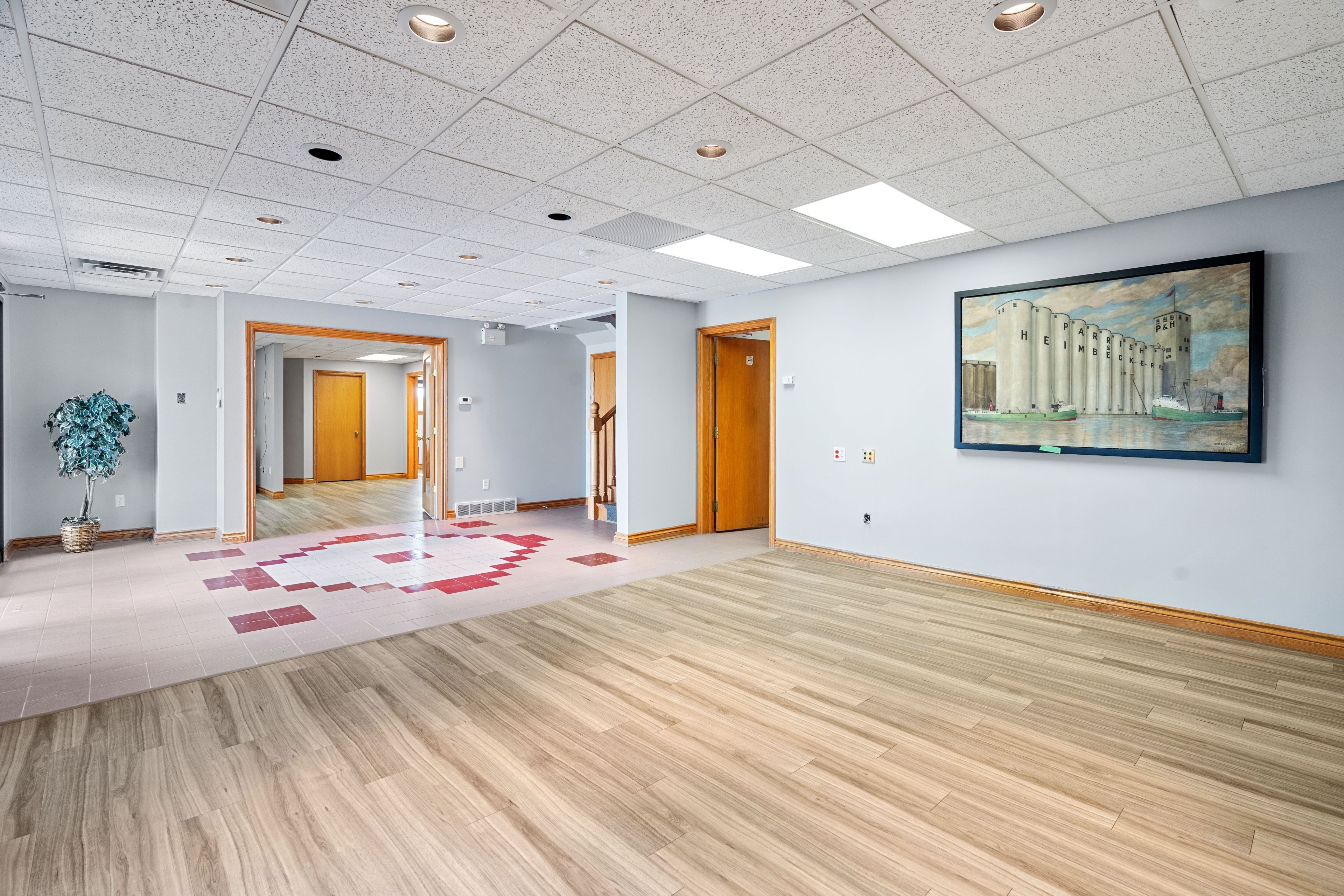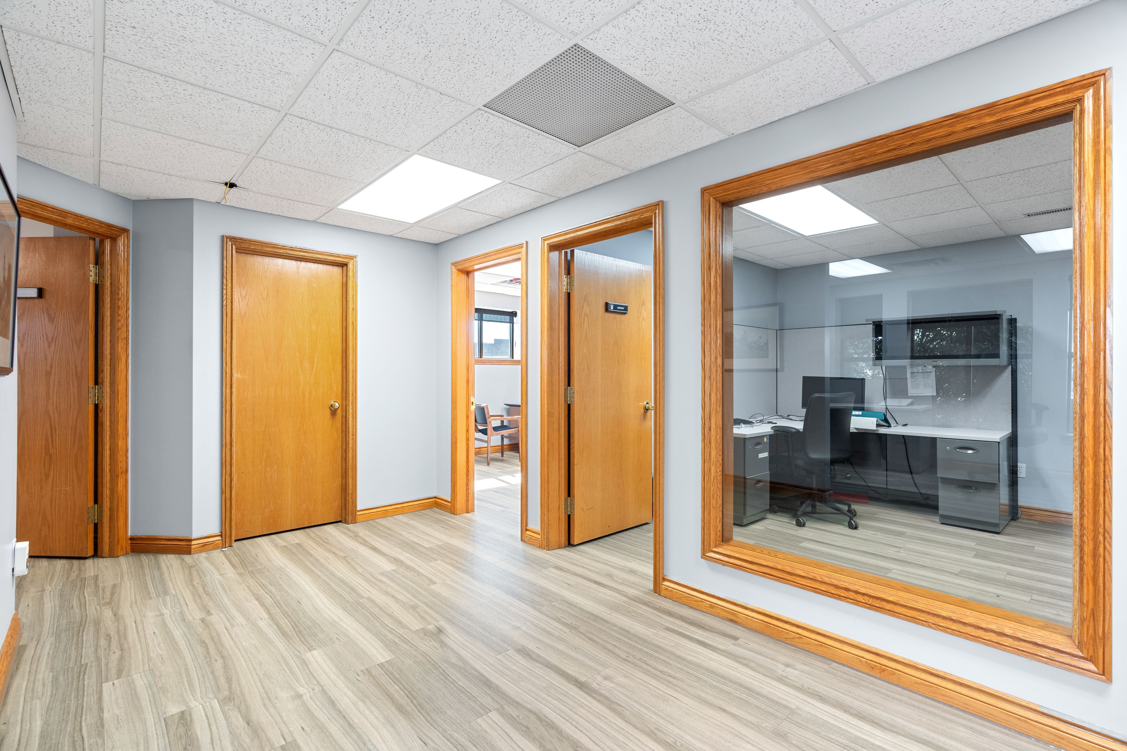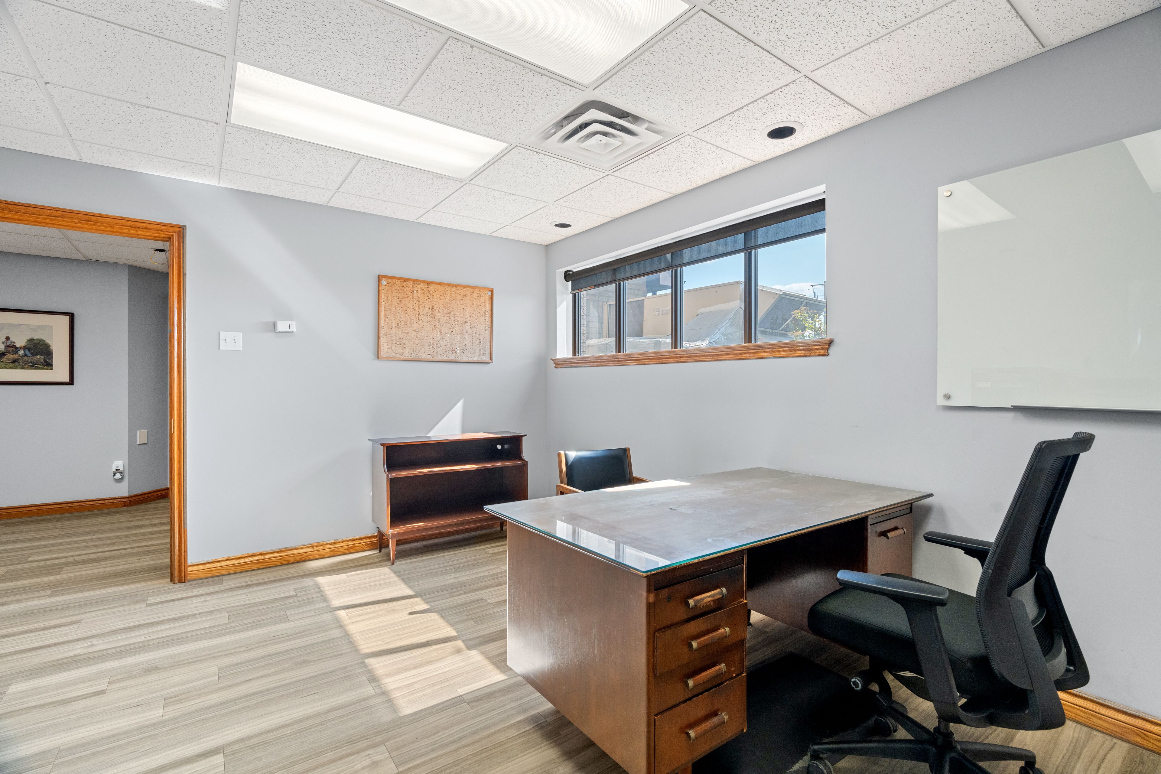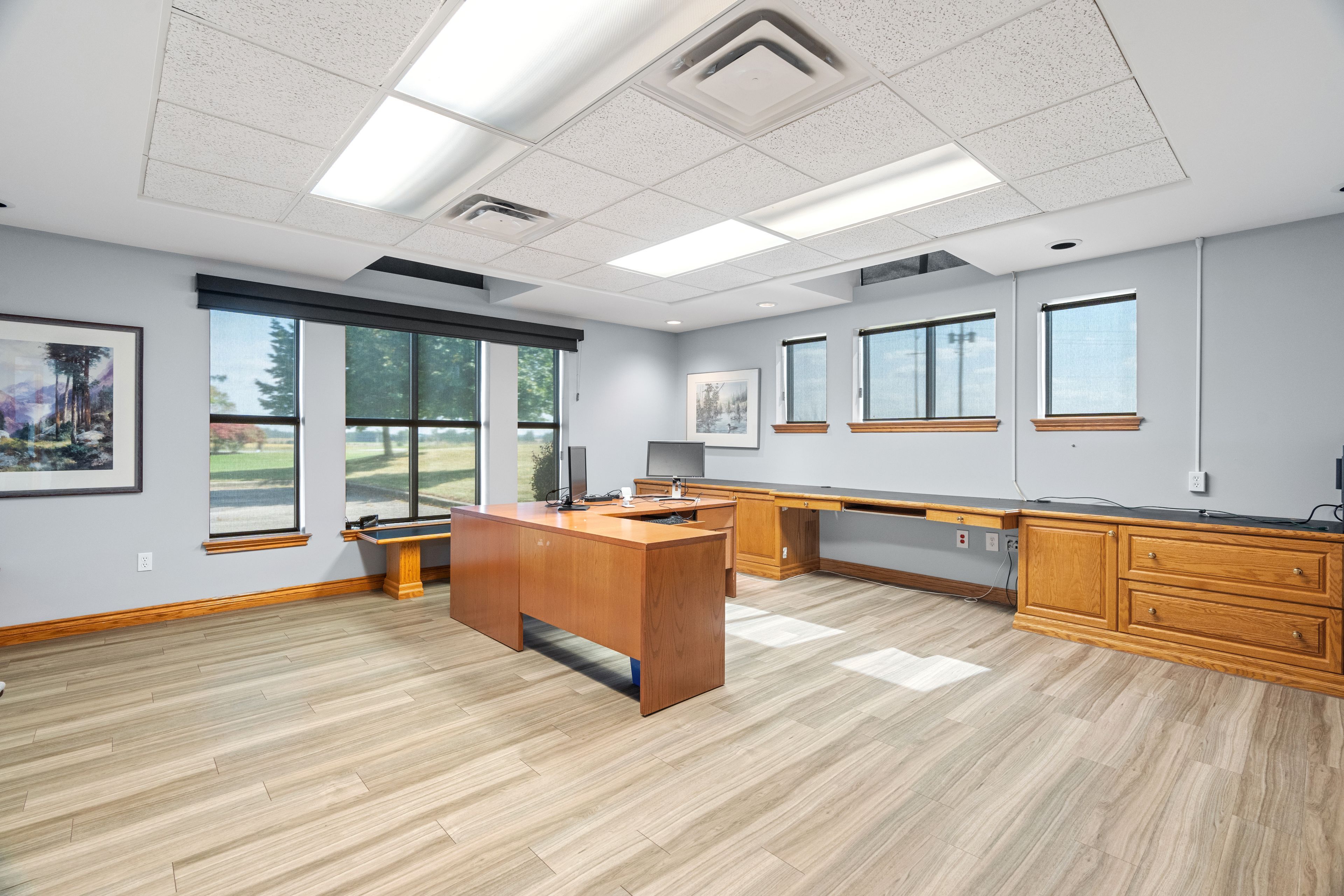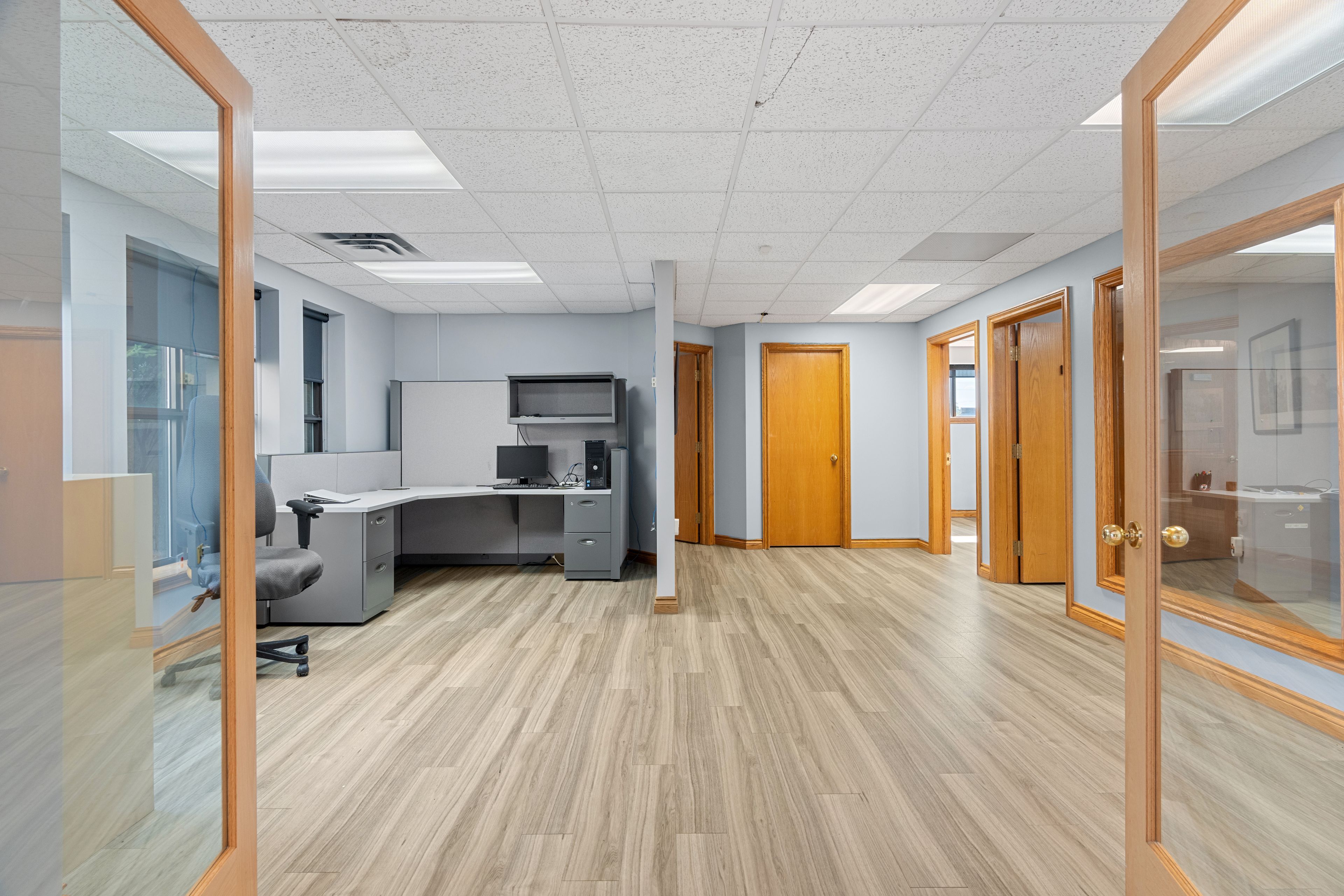 • Multiple private offices and a spacious boardroom with custom cabinetry.