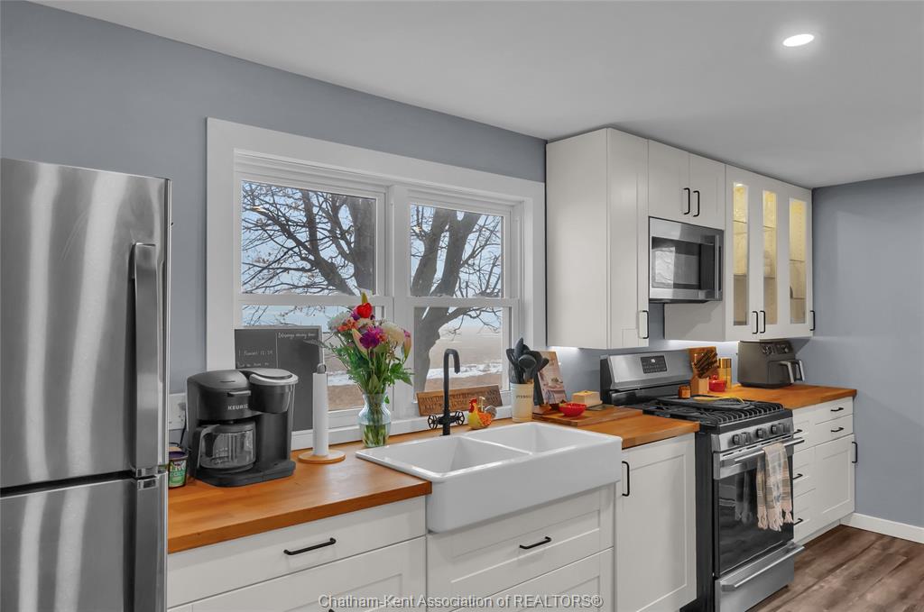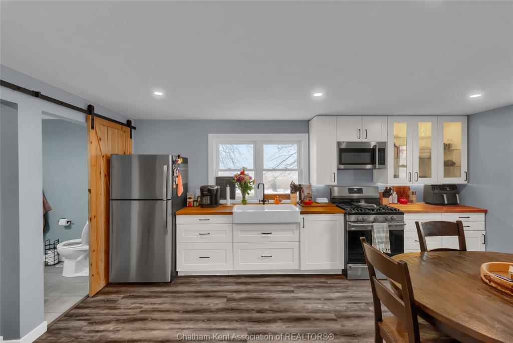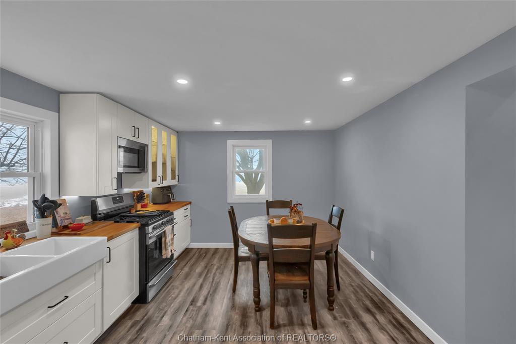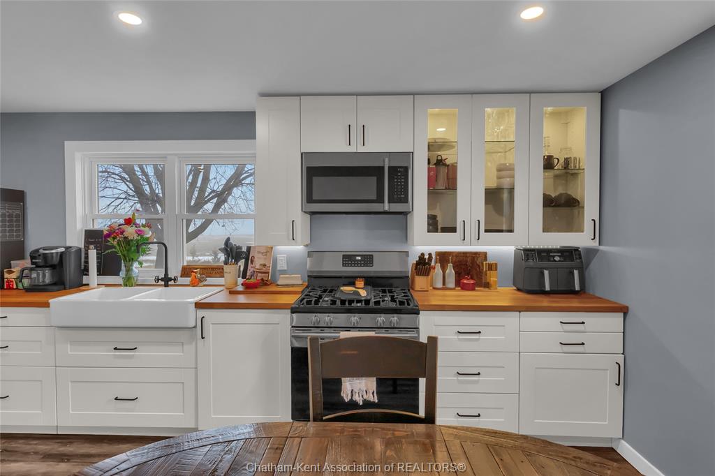 • Spacious eat-in kitchen featuring a farmhouse apron sink.
