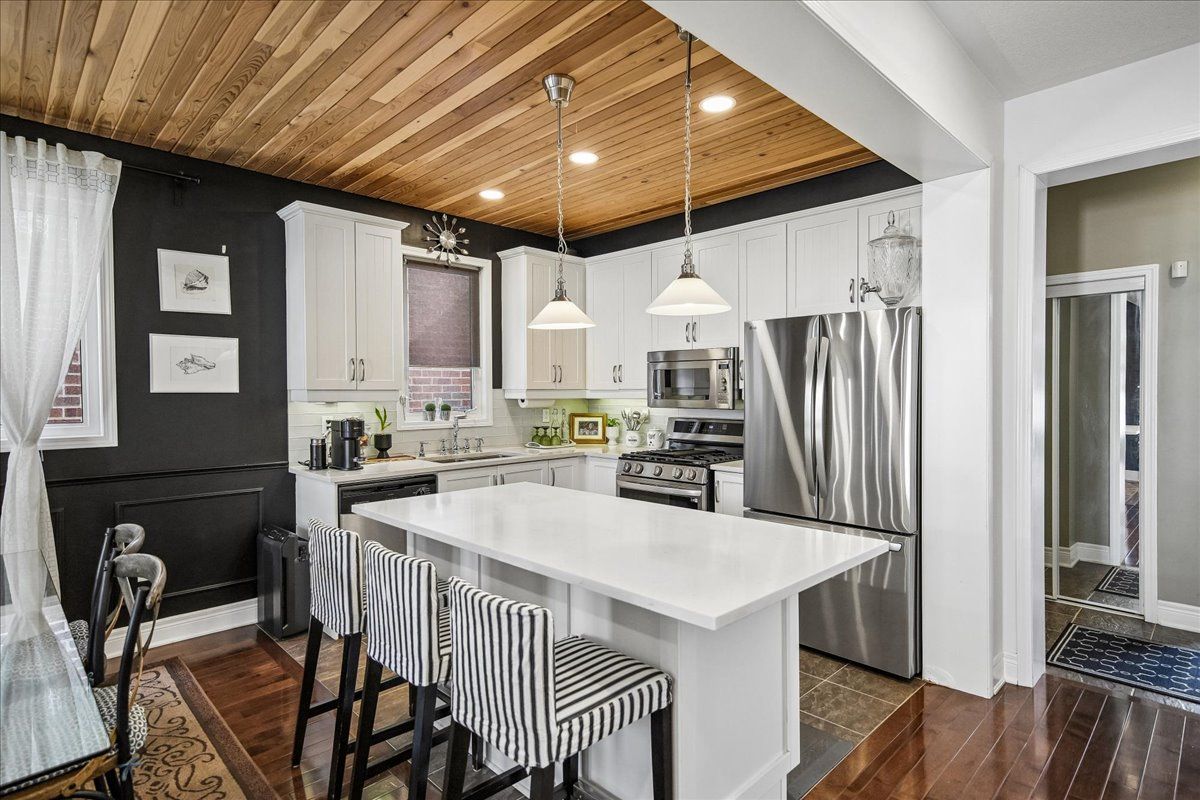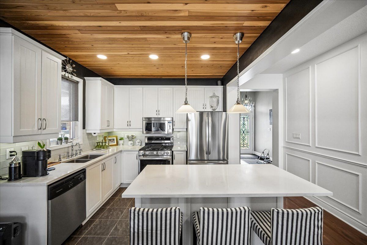 • Stunning kitchen with white cabinetry and stainless steel appliances.