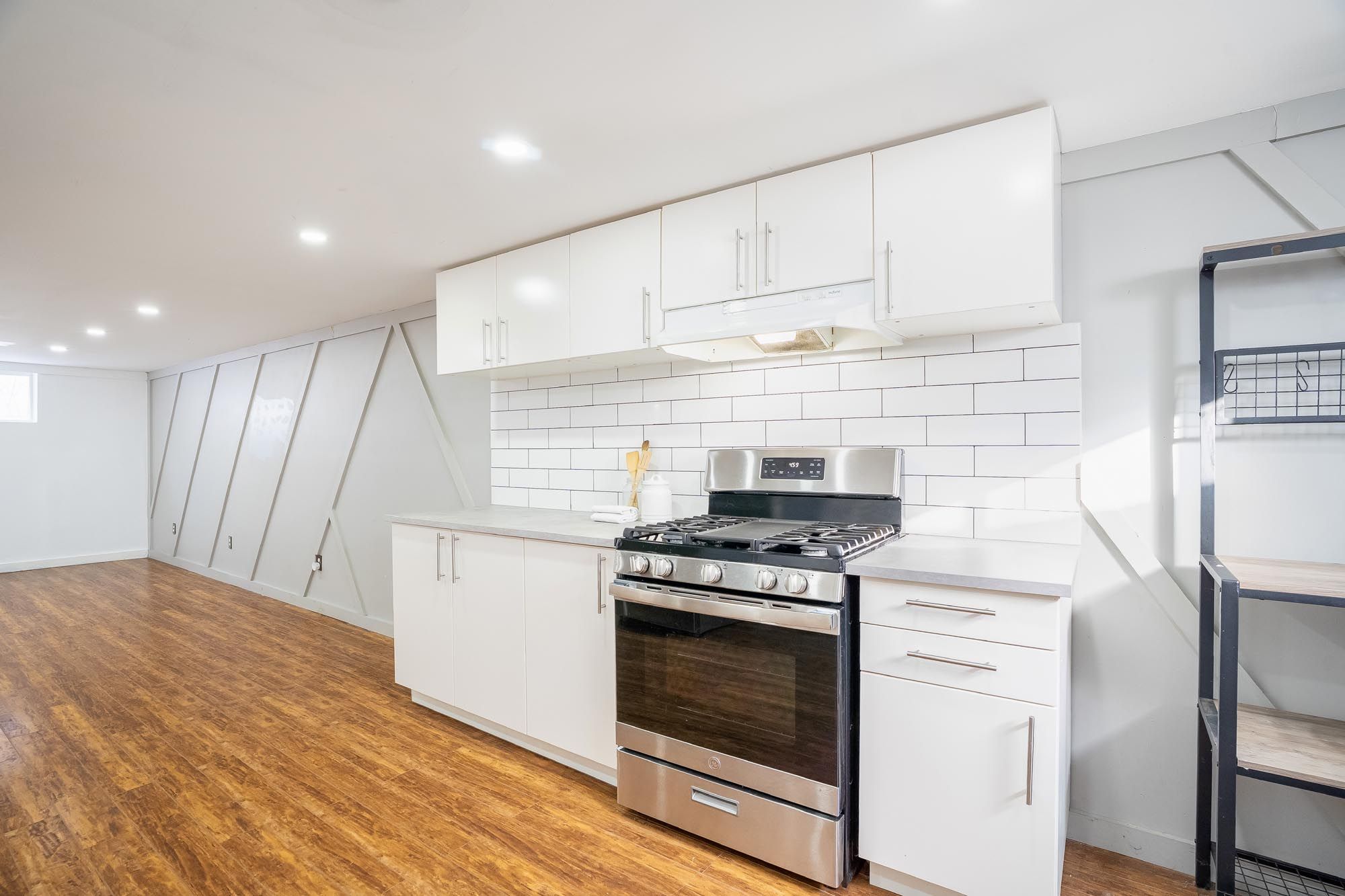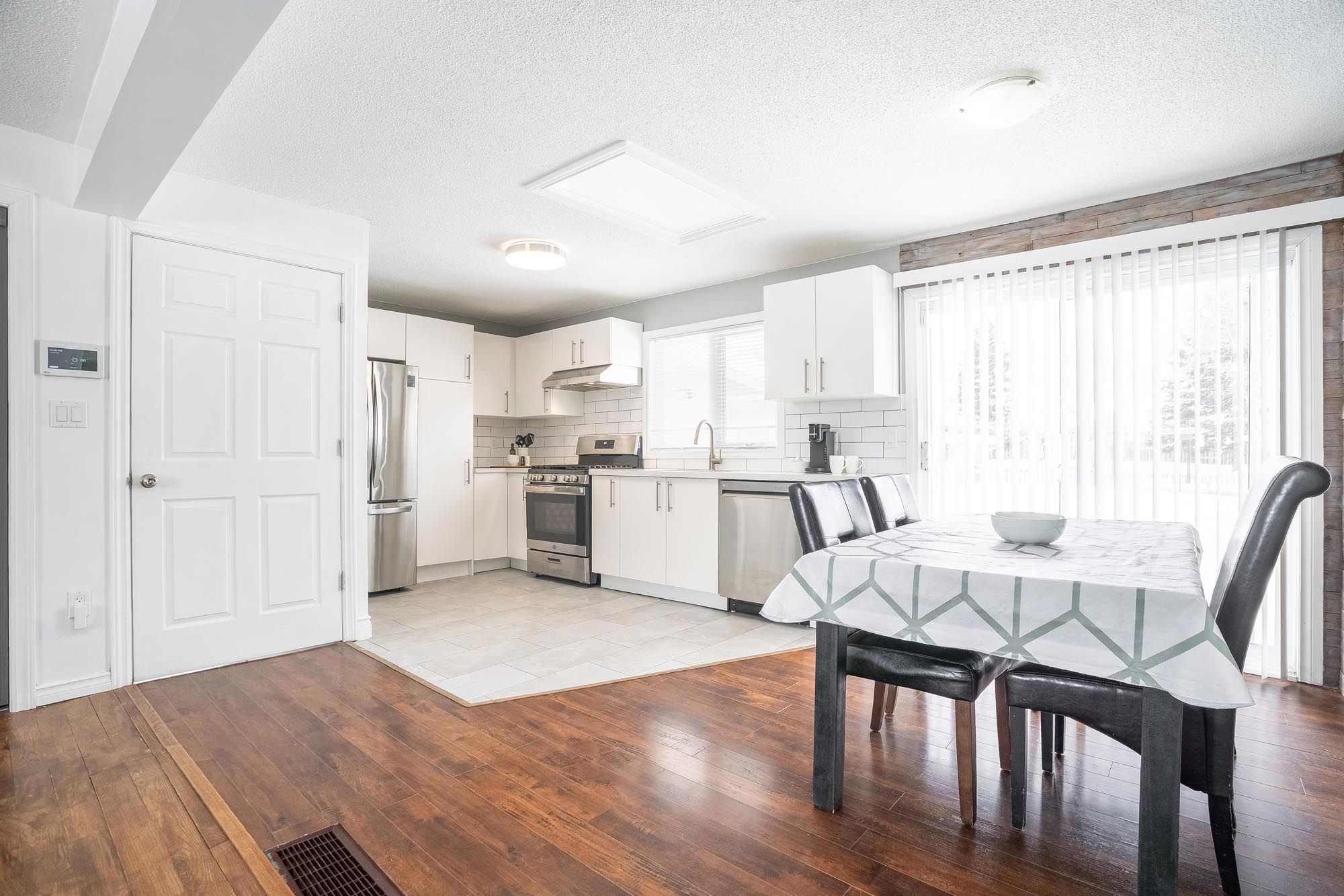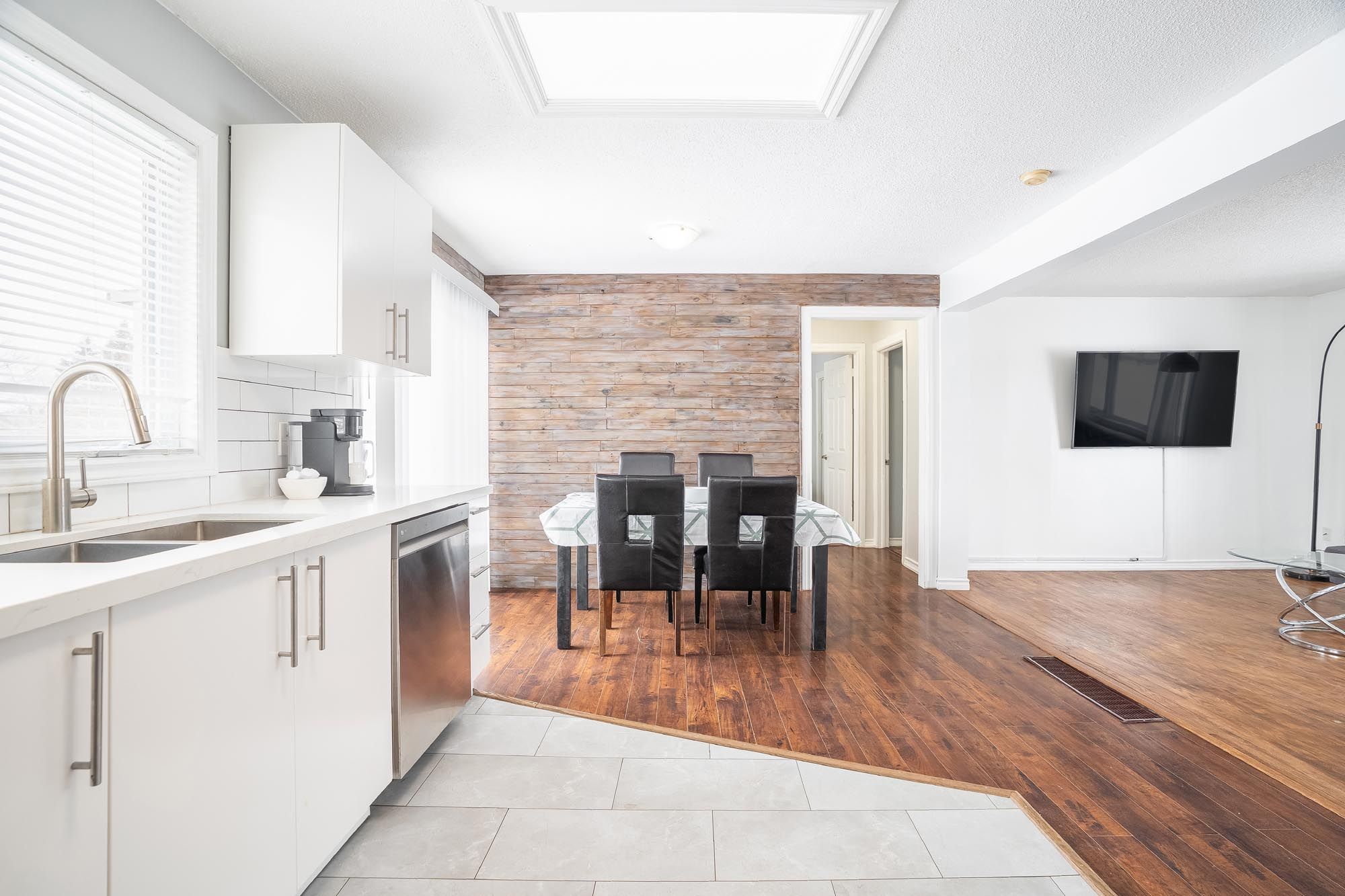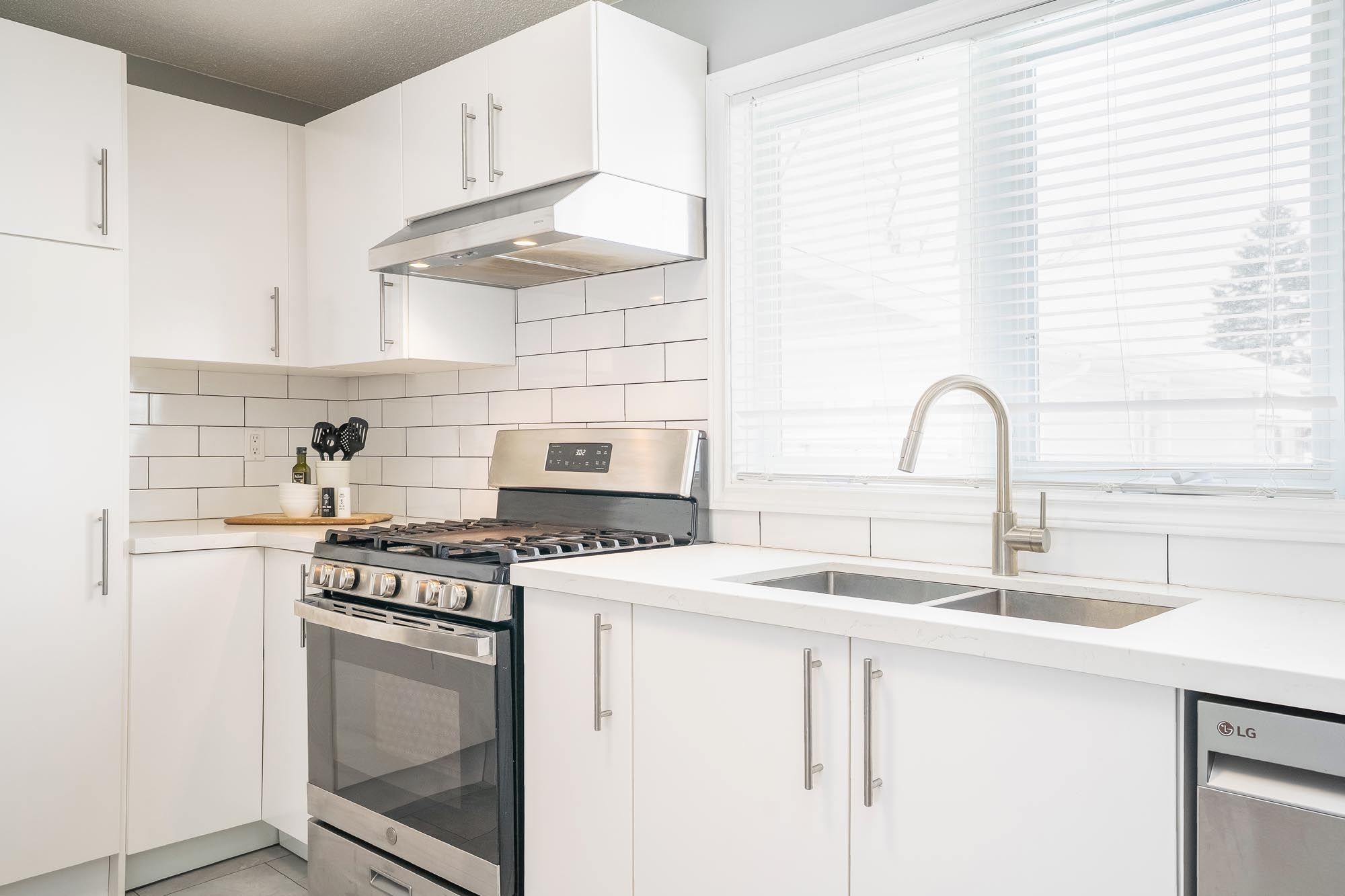 • Updated kitchen with quartz countertops opens to a large deck and backyard.