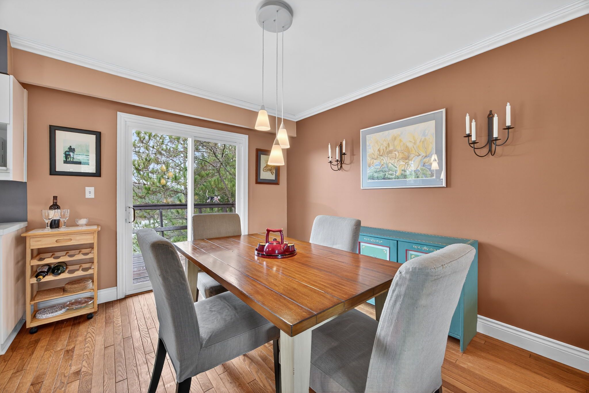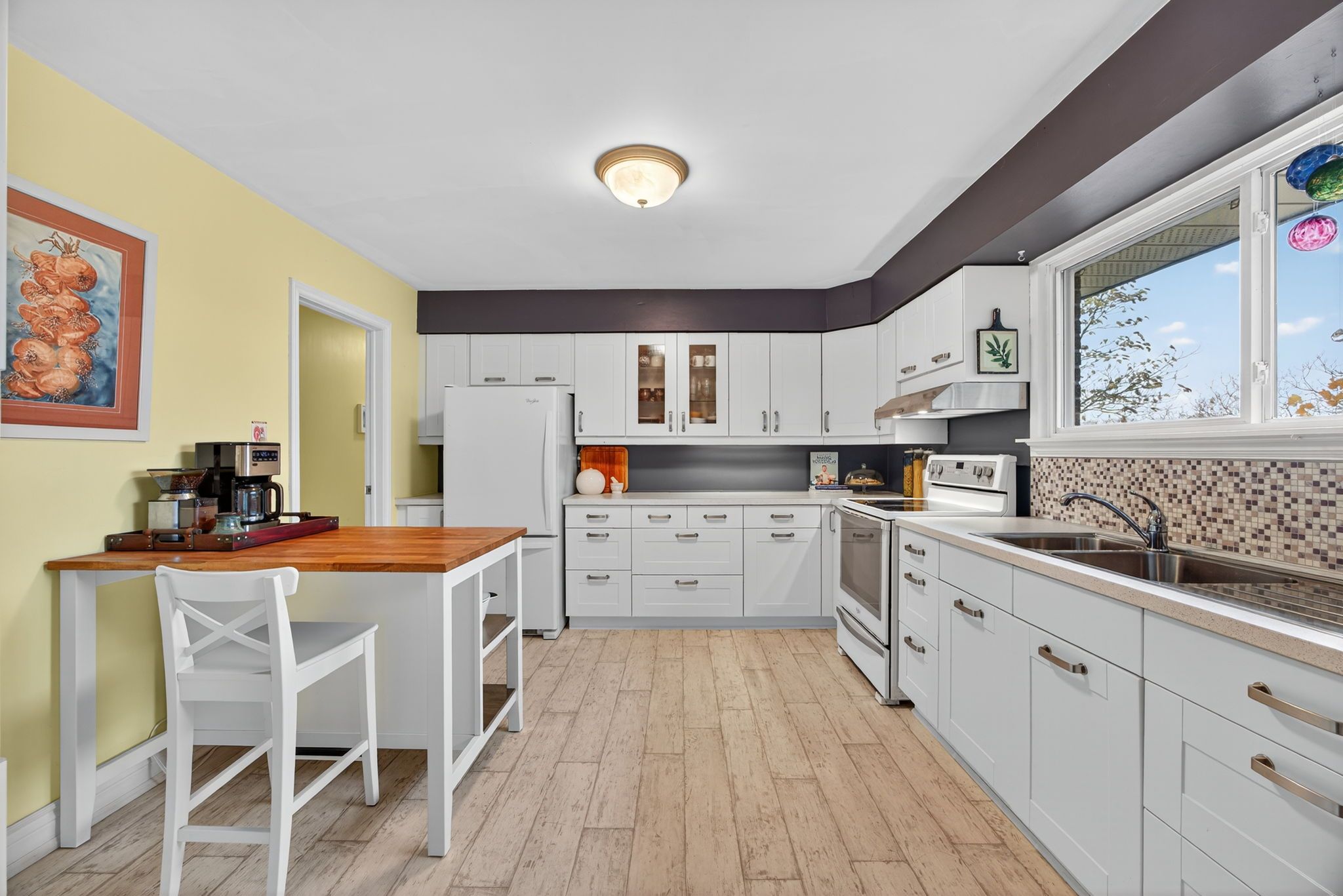• Bright IKEA kitchen with dining area and deck access.