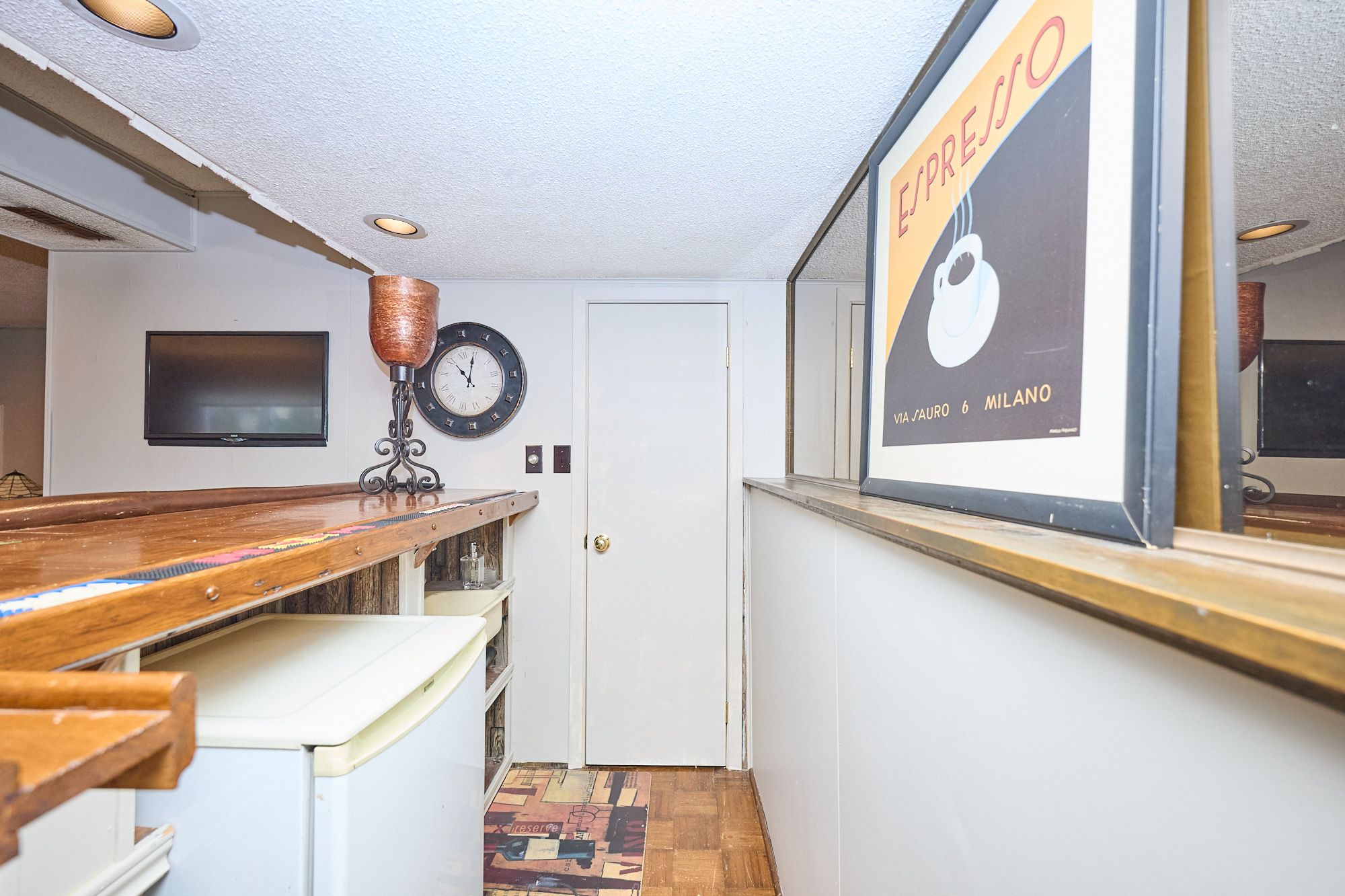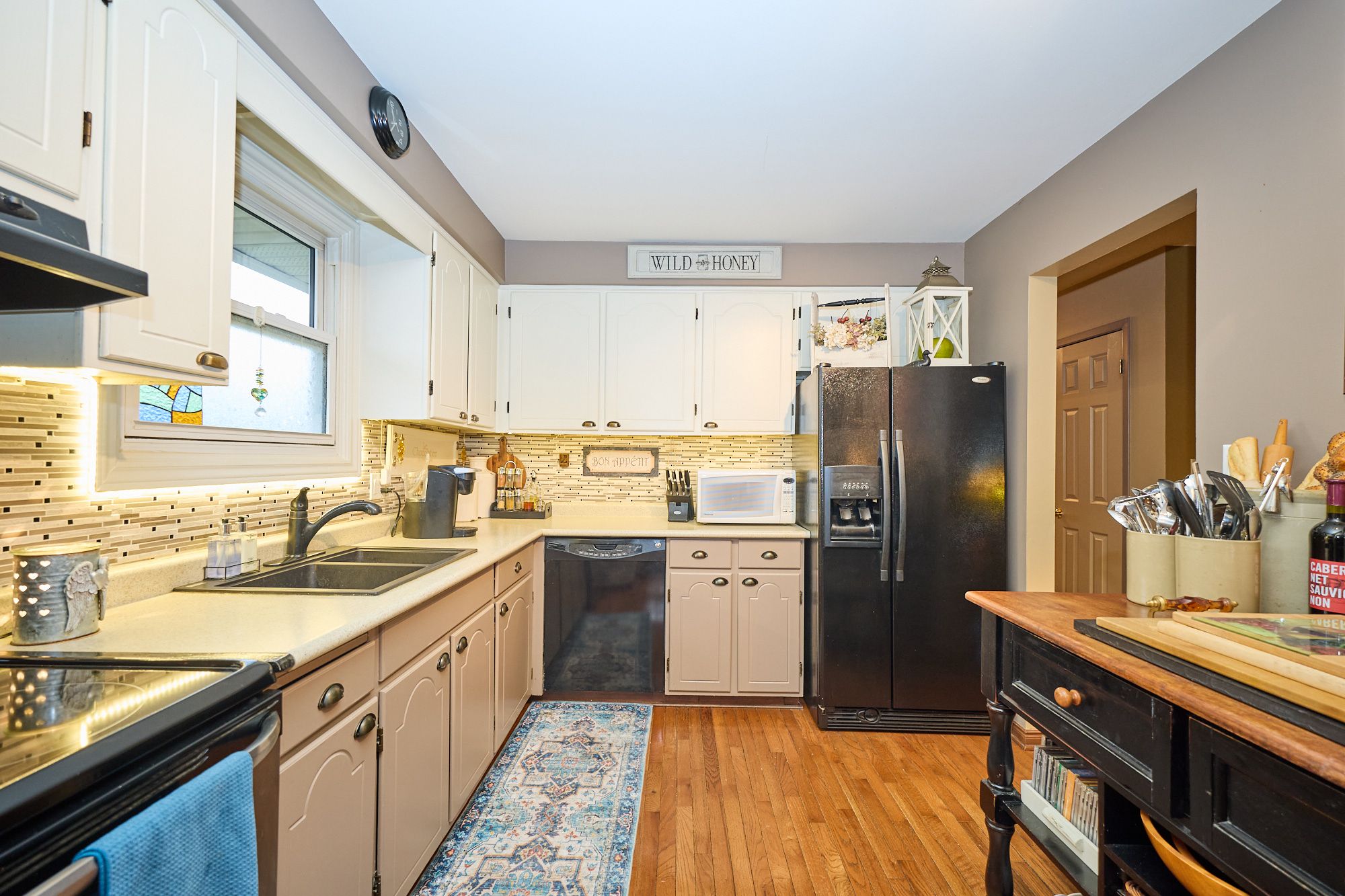 • Bright main level with functional layout, featuring living, dining, and kitchen areas.