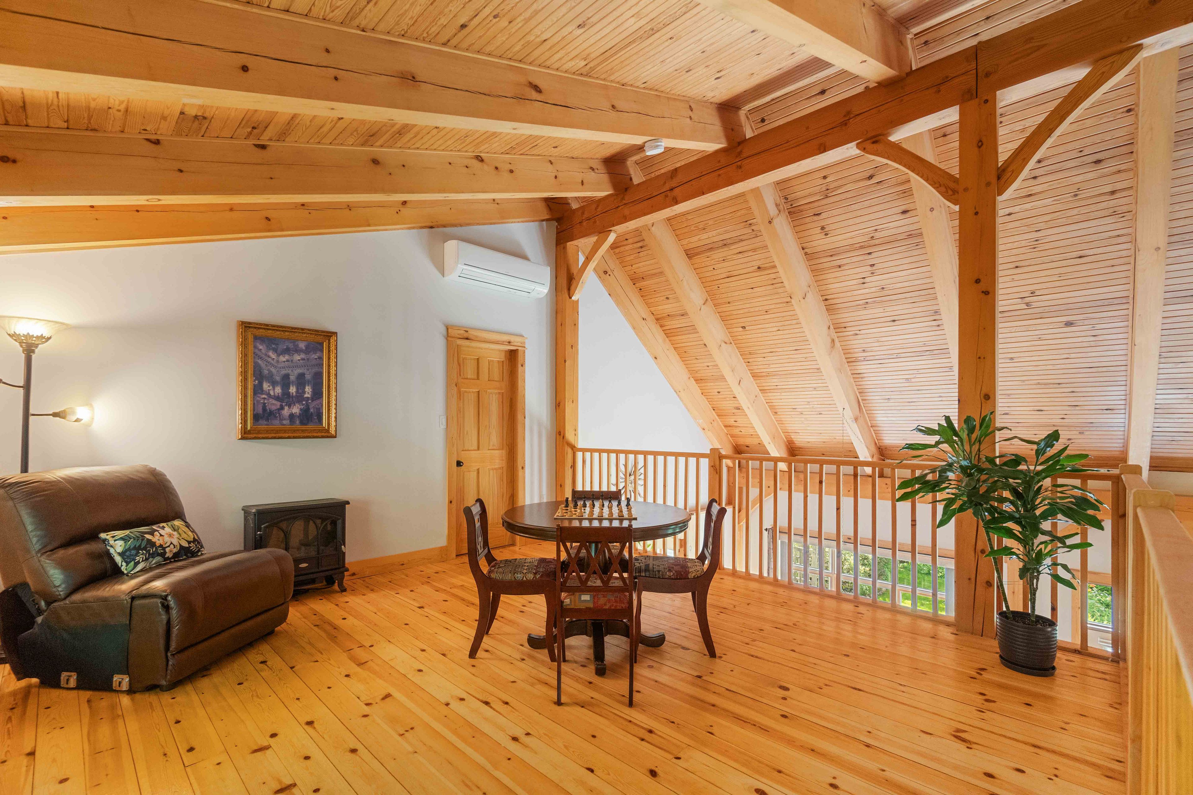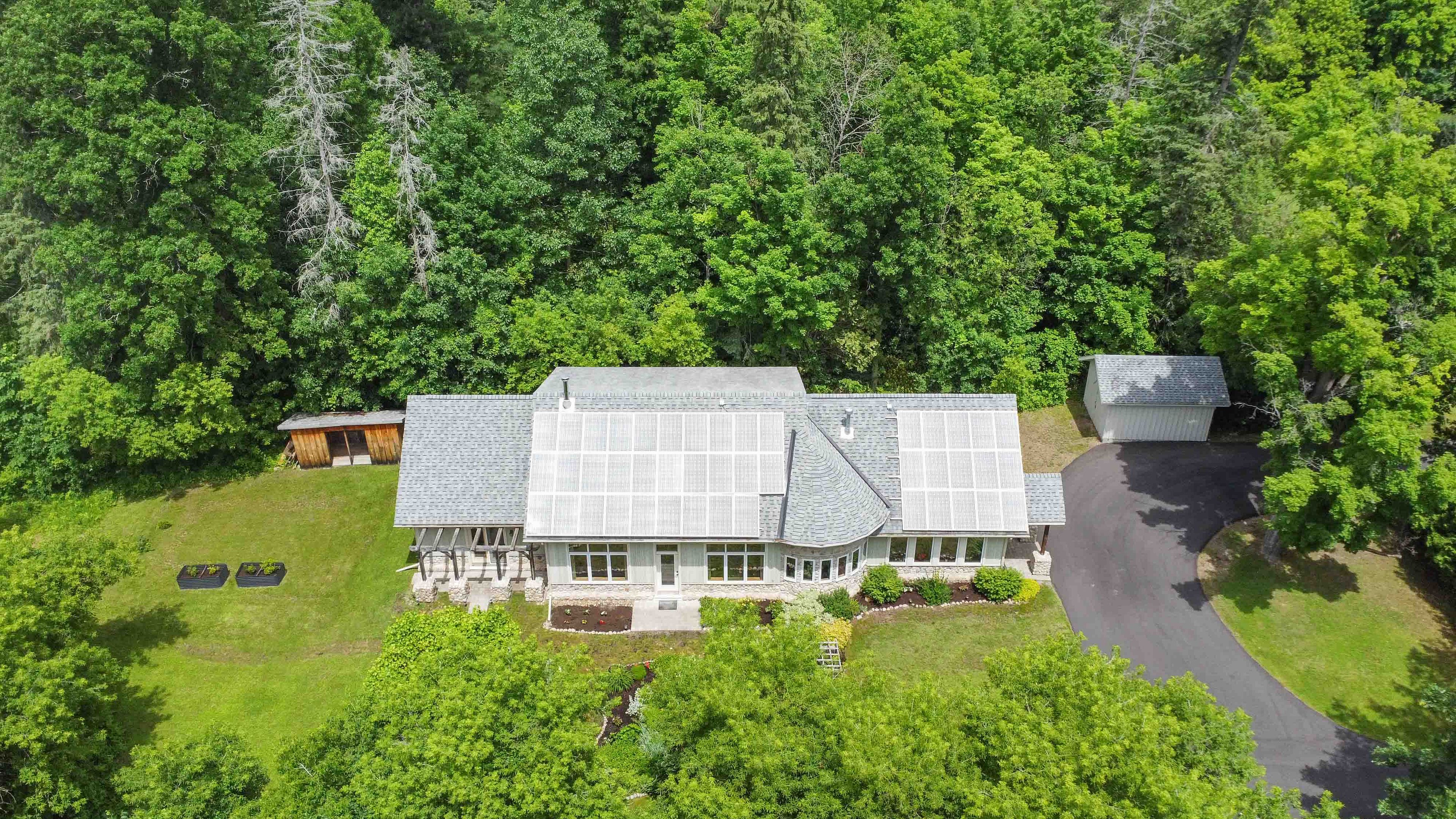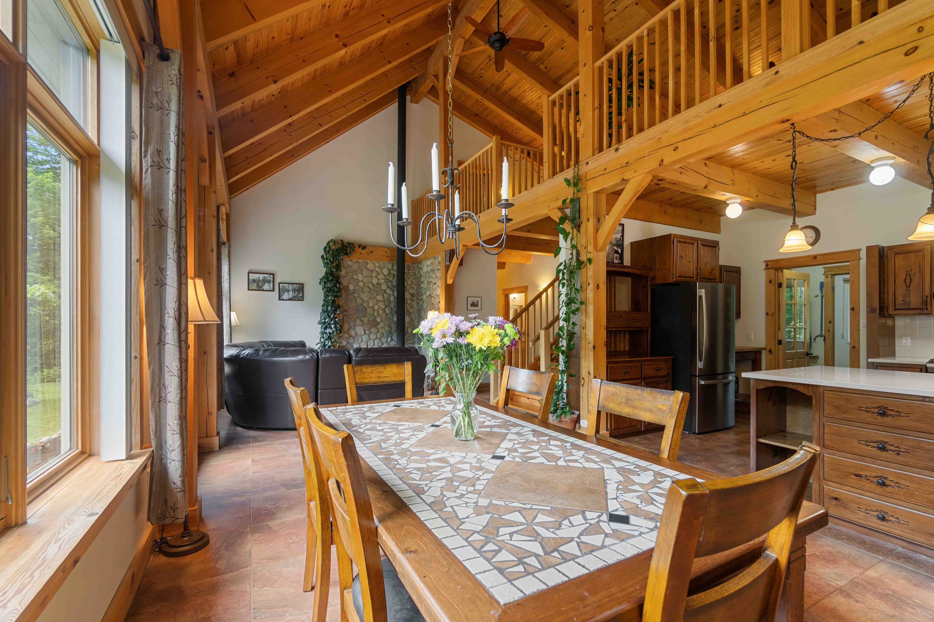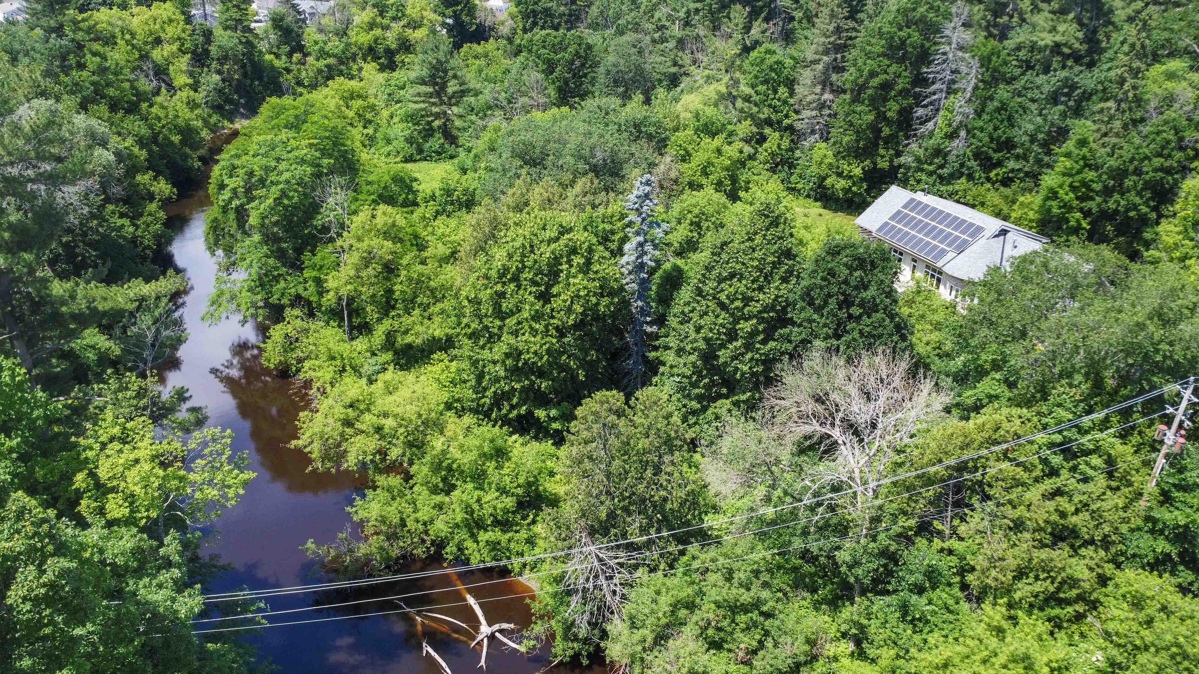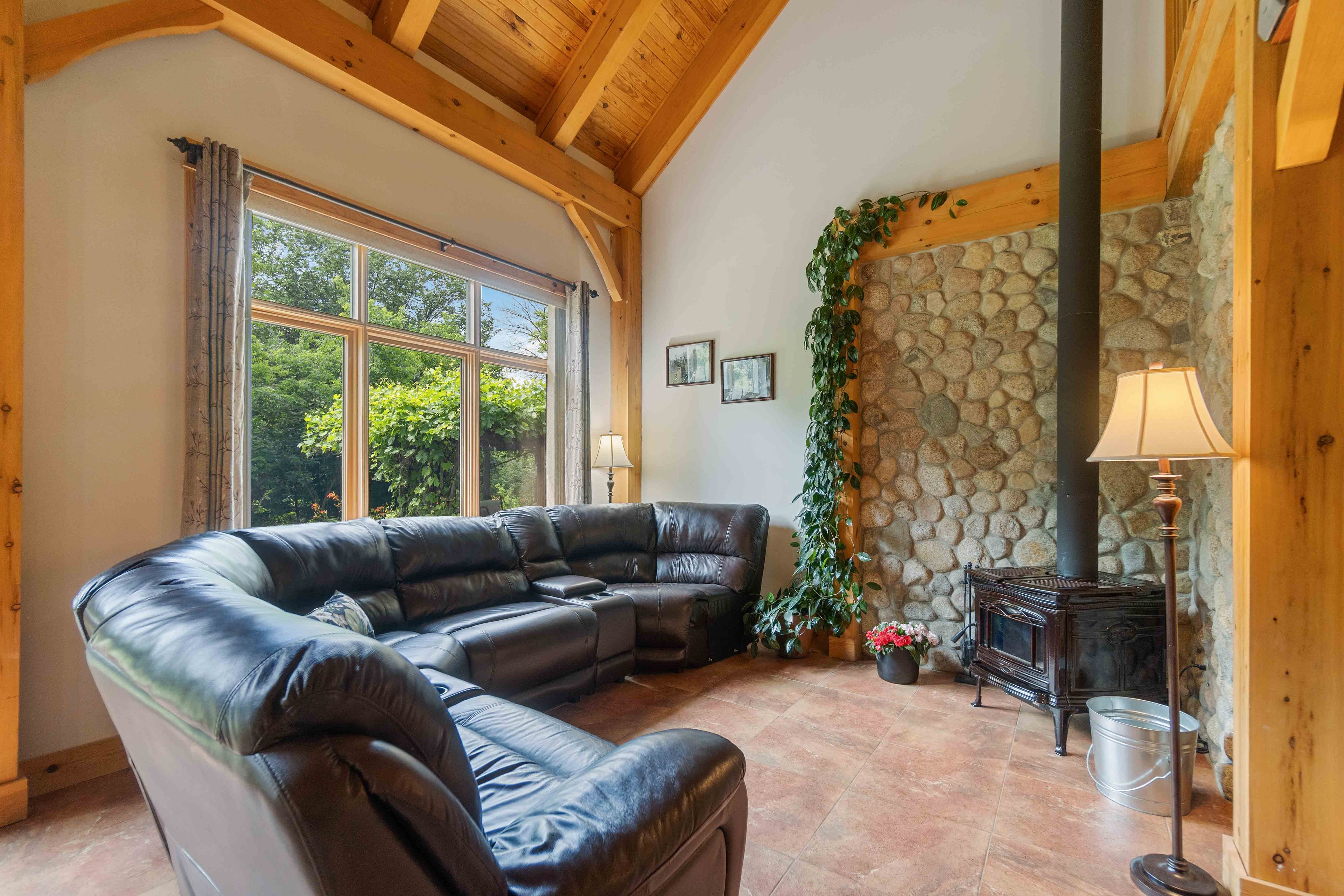 Discover your urban oasis! This custom-designed, ecologically sustainable post-and-beam home sits on a serene peninsula in pembroke, with 2. 8 acres of lush forest. Enjoy privacy and natural beauty while having all amenities at your doorstep. The open-concept main level boasts 23-ft ceilings and features a newly renovated kitchen with custom pine cupboards, quartz countertops, and modern appliances. Relax in the curved sitting area with a gas fireplace or by the wood stove in the living room. The main level includes an office, two full bathrooms, and three bedrooms, including the primary suite with a walk-in closet and sliding doors leading to a patio with river views. The upper level offers bonus rooms, a large storage area, and a fourth bedroom overlooking the garden. Updates include paved driveway with a gate 2023, new washer & dryer 2022, infrared sauna 2023, new owned hot water heater 2025. Additional features include two outdoor sheds, a hot tub, and solar panels providing passive income. Book your showing today!