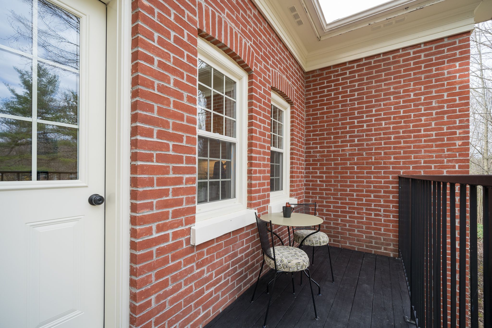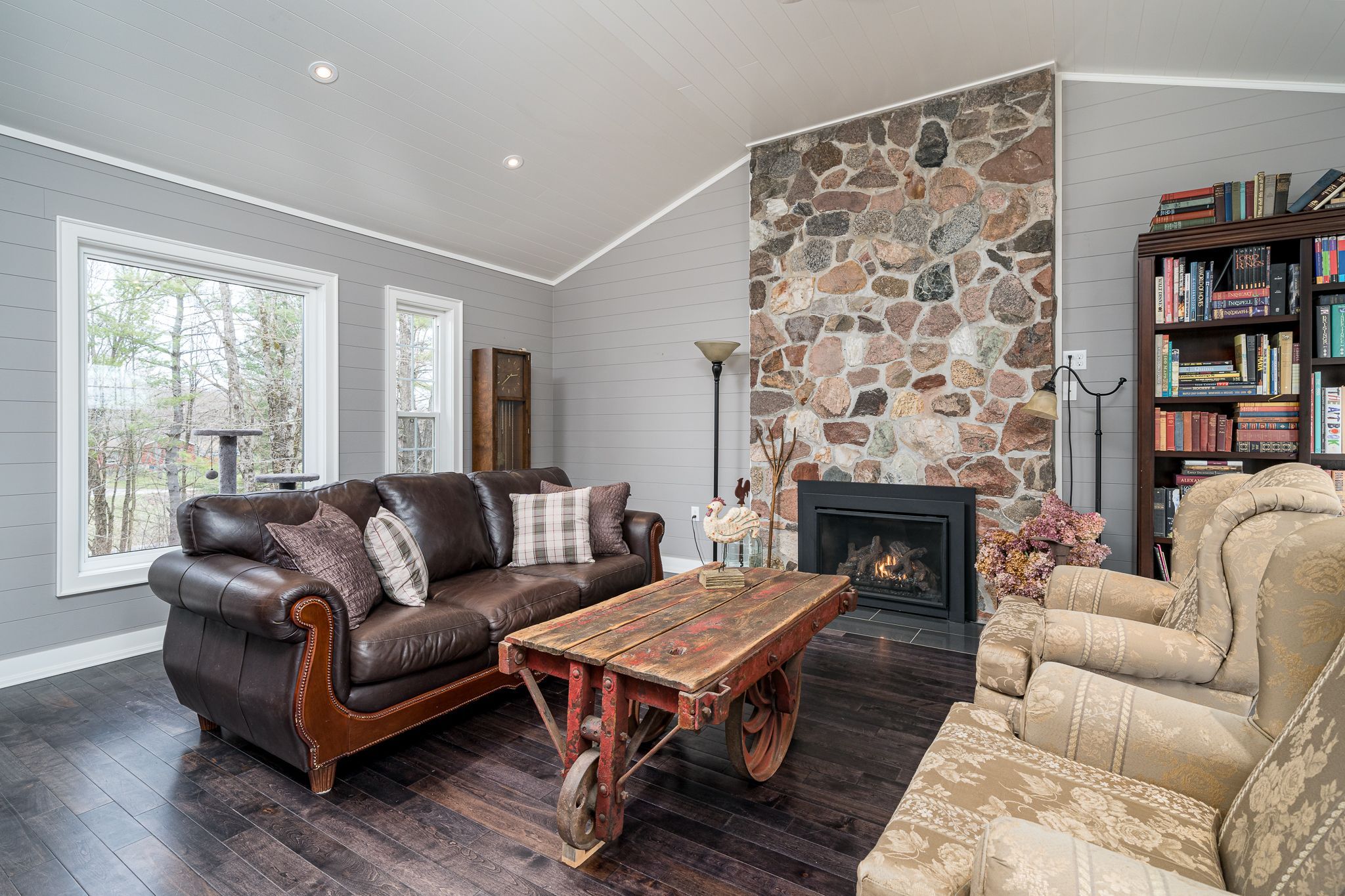 • Beautiful living room with stone fireplace and sun-drenched deck.