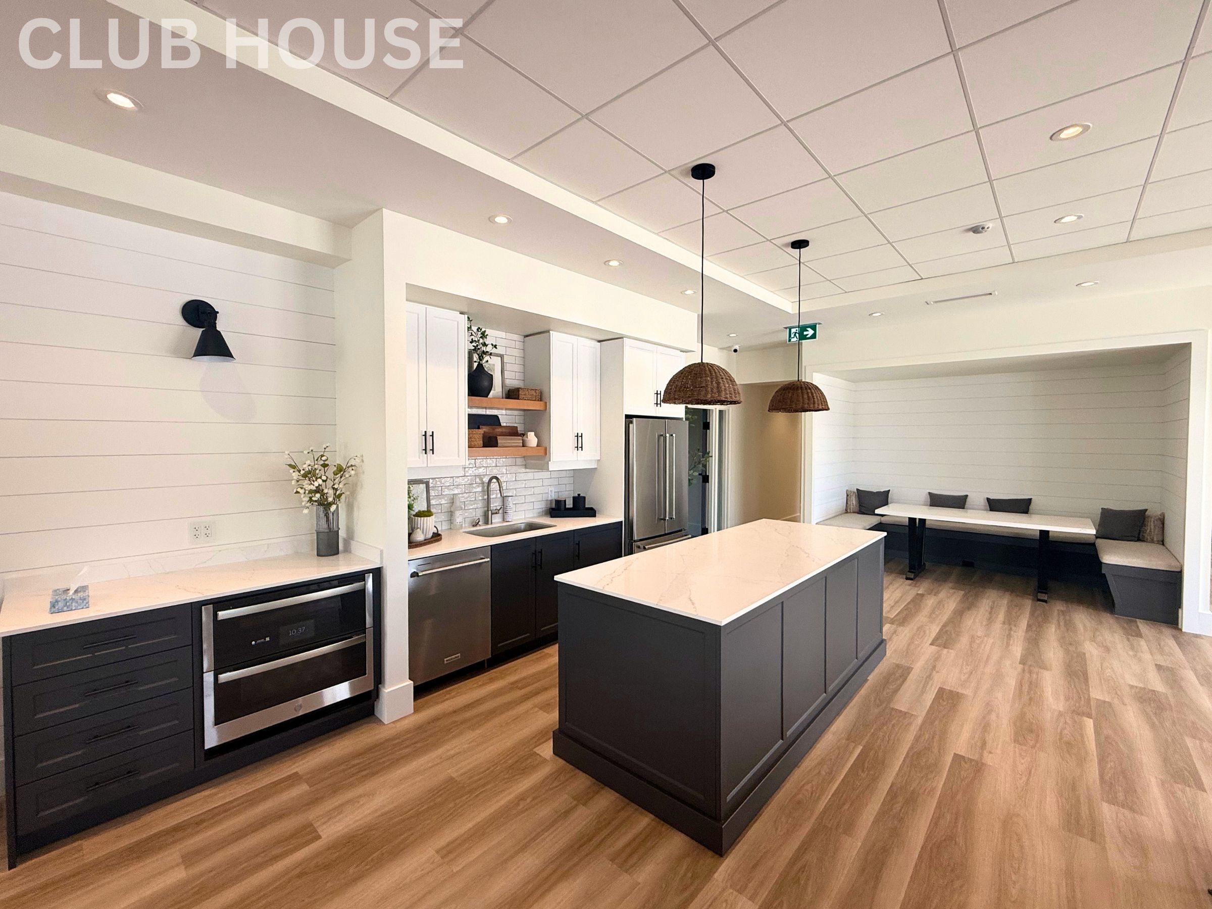 • Many windows provide natural light and a cozy ambiance with an electric fireplace.