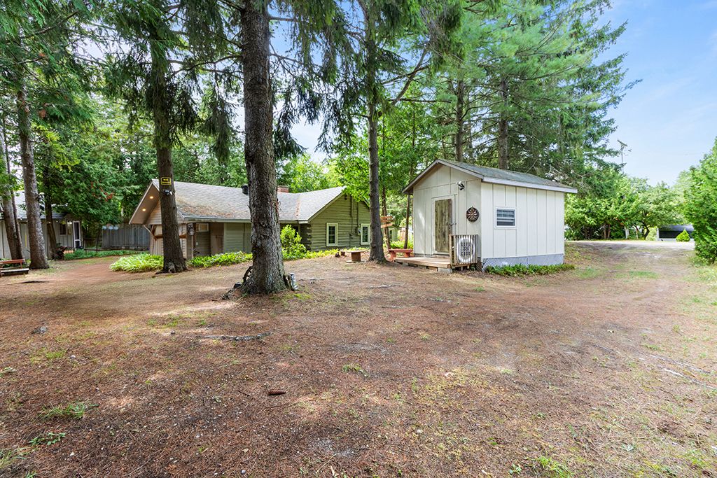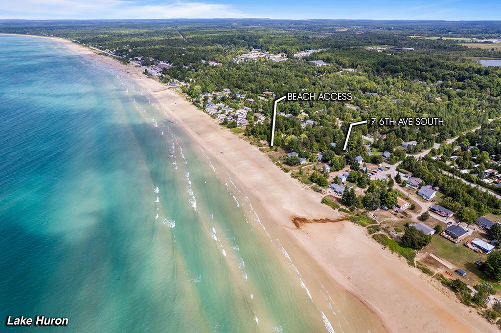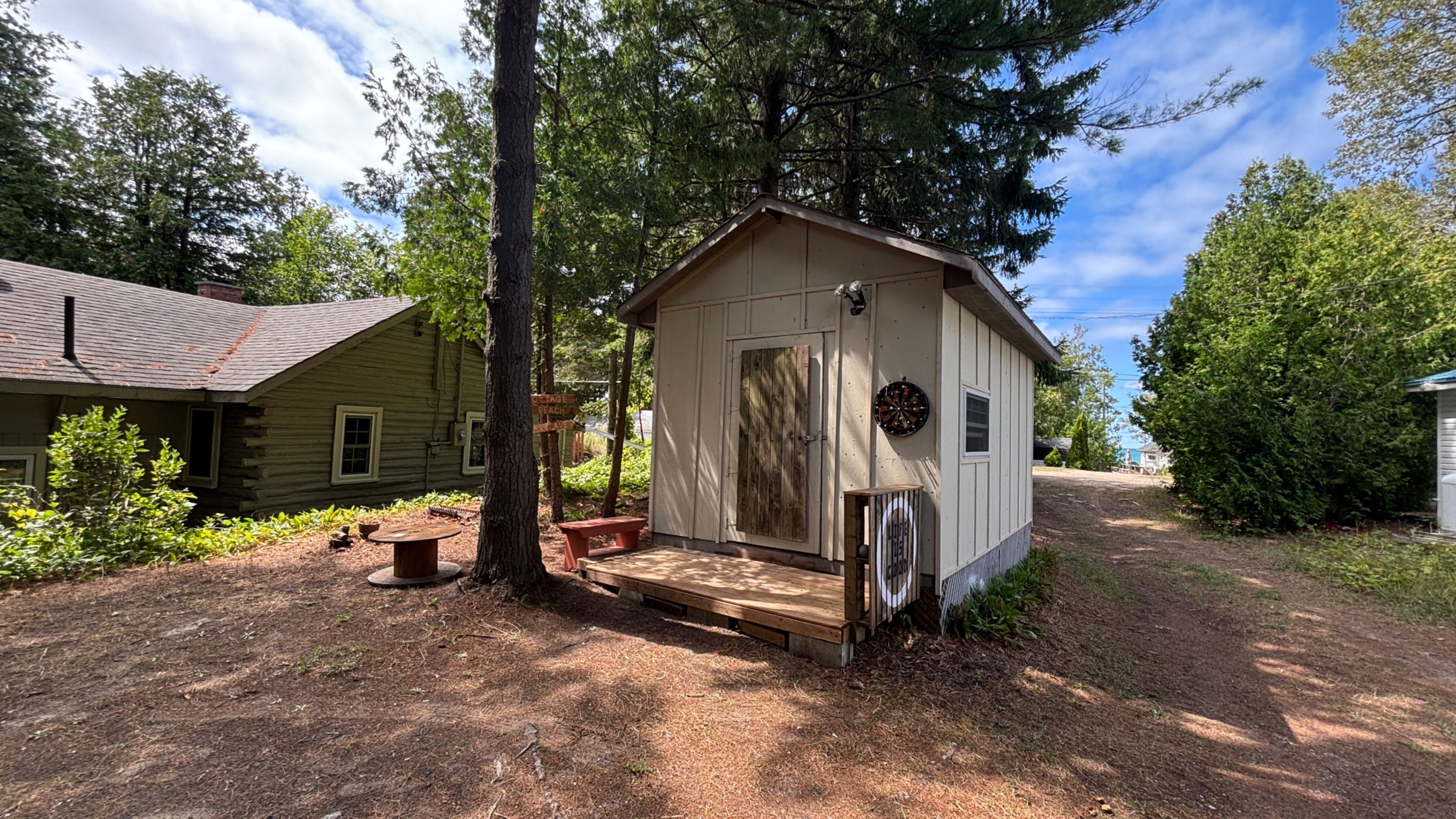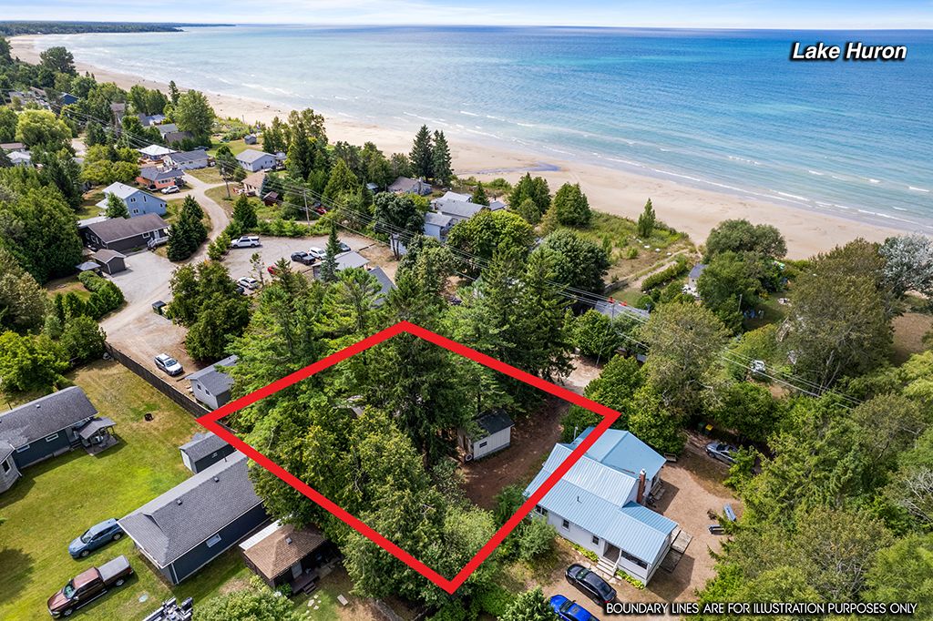 Just a short stroll from the soft sandy shores of lake huron, this charming cottage combines rustic character with modern updates. Set on a mature 115' x 95' lot with a partial water view, it offers a true lakeside retreat with endless possibilities. Inside, the cottage features a bright, inviting layout with vaulted ceilings, a renovated kitchen, an updated three-piece bathroom, a cozy living room, and two comfortable bedrooms. An upper loft provides excellent storage space, keeping the main living areas open and uncluttered. Outside, three separate sheds add to the property's appeal, each with potential for a variety of uses such as a gym, home office, playhouse, or hobby space. A brand-new outdoor-access bathroom makes rinsing off after a day at the beach simple and convenient. Relax on the front porch while listening to the gentle sound of the waves, or enjoy the privacy of the landscaped lot. With updates including a newer sand point pump, windows, lighting, and flooring, the property is move-in ready. Sold furnished as shown with quick closing available, this cottage is ready to enjoy as a seasonal retreat or a place to make lasting memories. Yearly lease fee is $5,800 and yearly service is $1,300