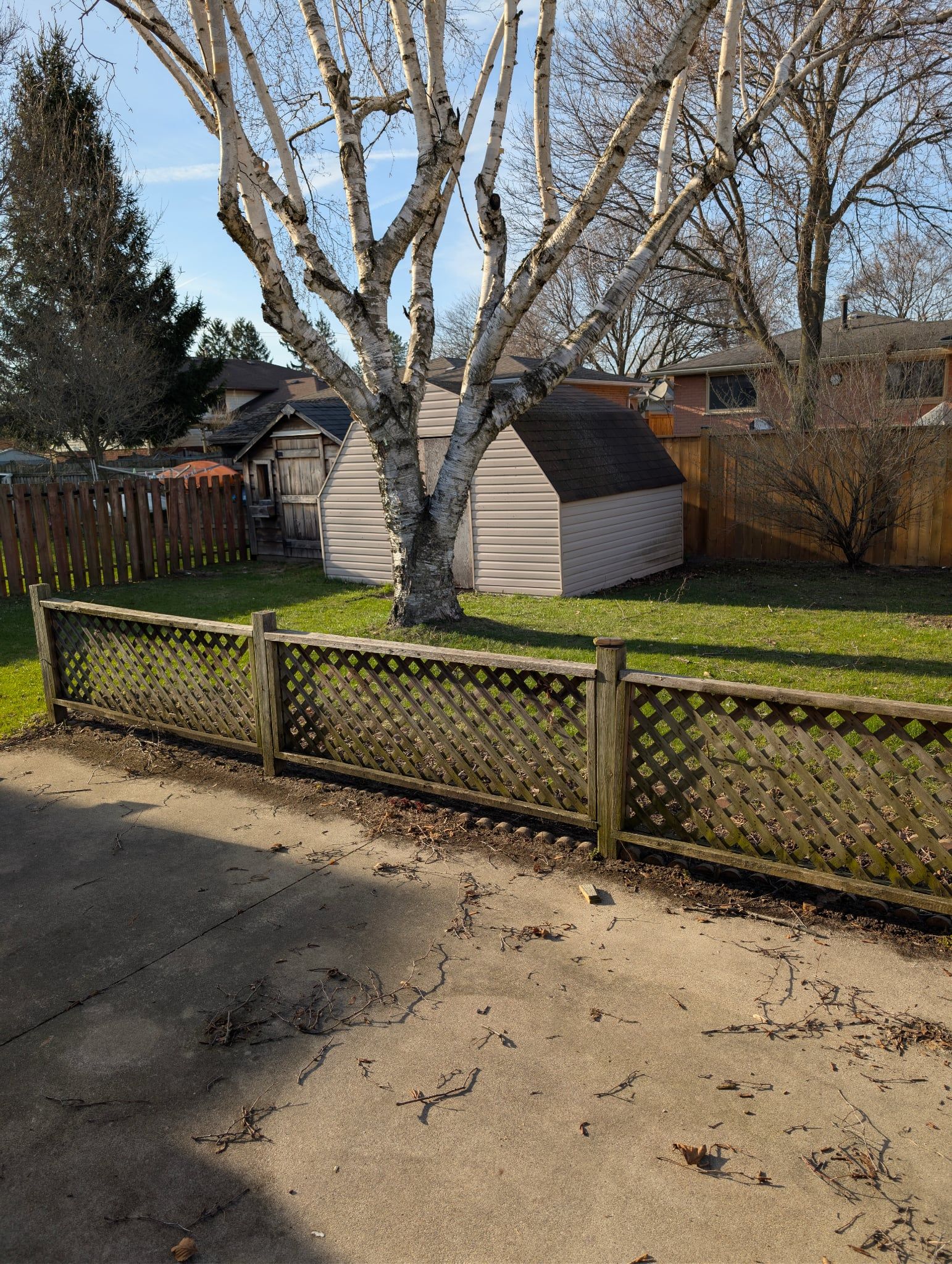 • Fully fenced yard with garden sheds, semi-enclosed patio, and mature trees for privacy.