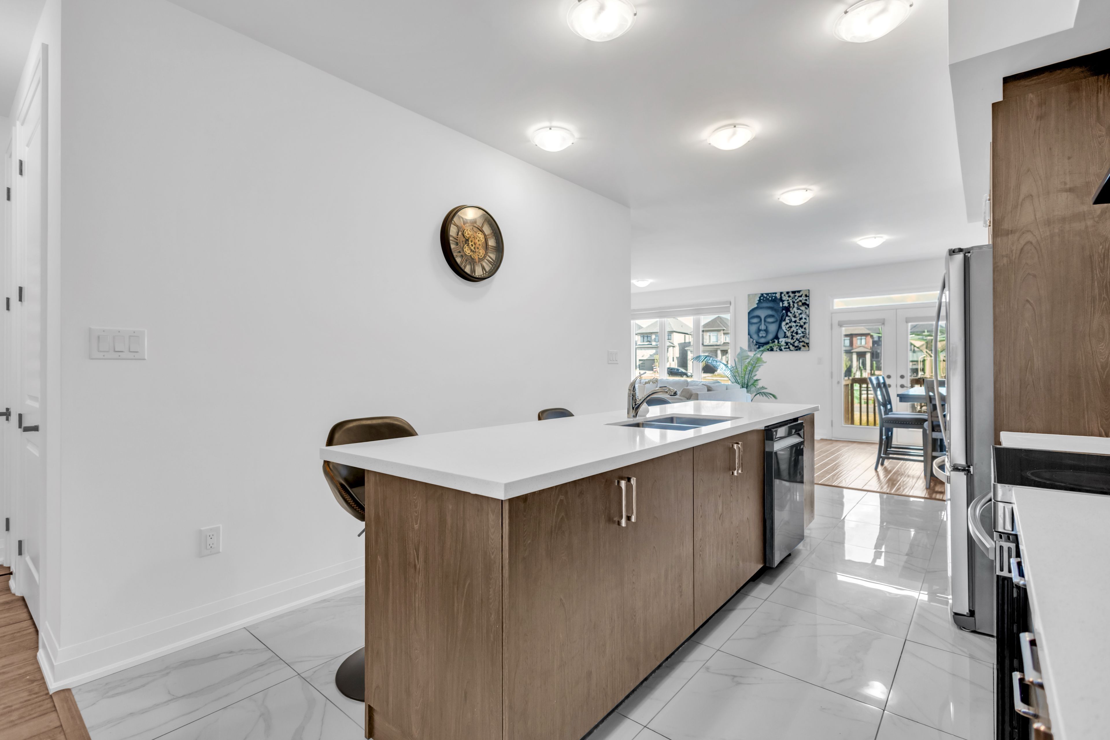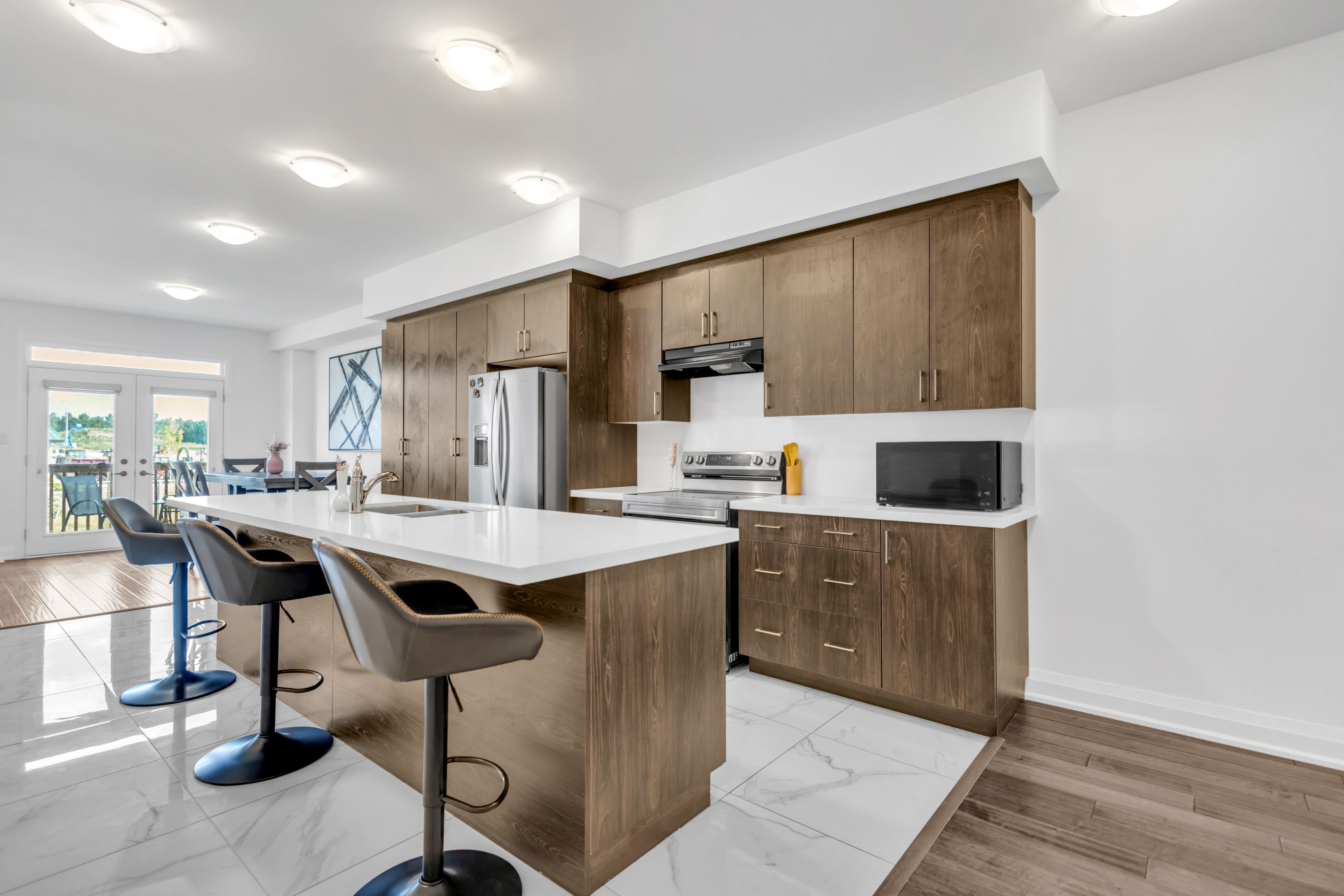• Open concept kitchen with marble island and stainless steel appliances.