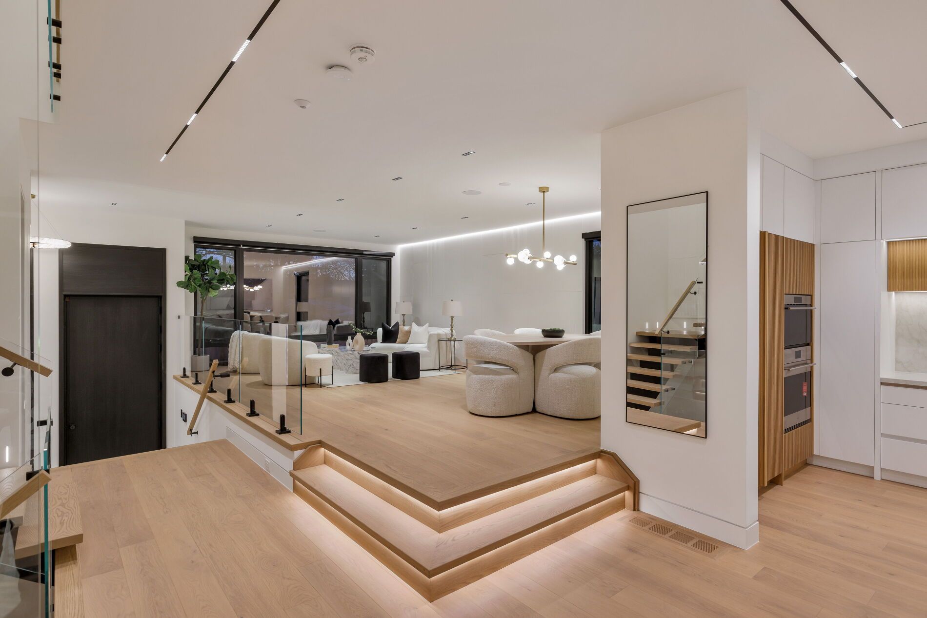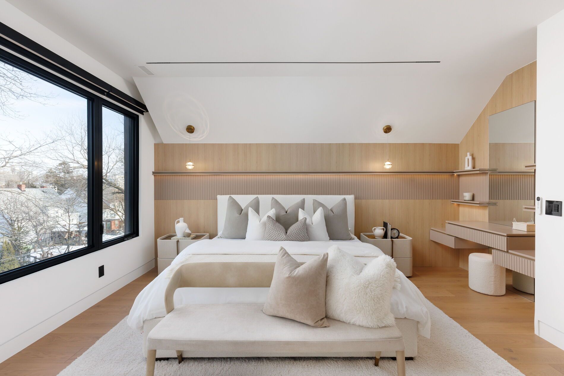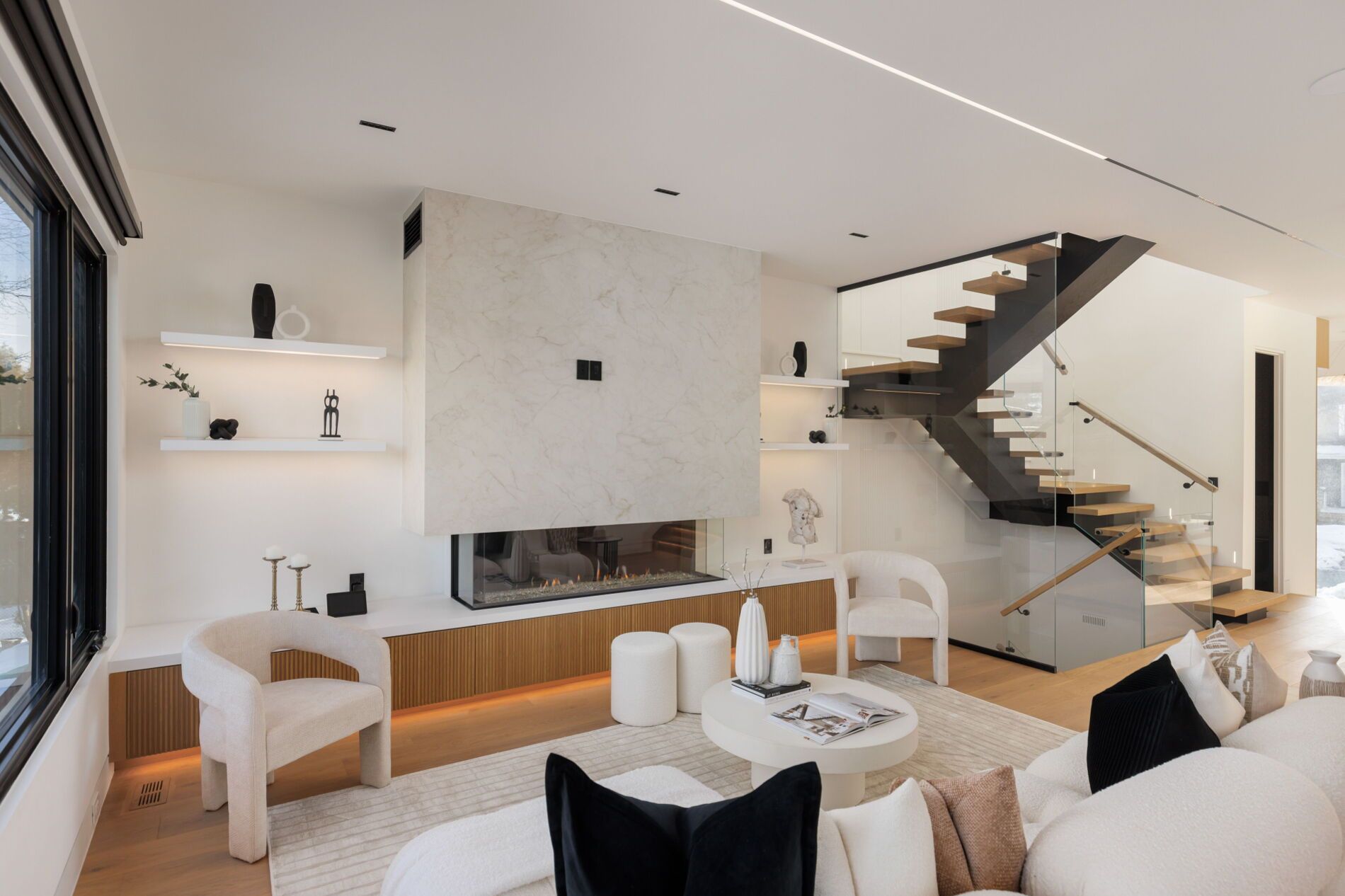 A commanding architectural statement in prestigious stonegate-queensway, this newly completed custom residence is thoughtfully crafted by an hcra-licensed builder and backed by the full tarion warranty. Offering approx 3,650 sq ft of curated living space with 4+1 beds & 5+1 baths, the home is defined by architectural clarity, material integrity & refined restraint. A dramatic 14-ft foyer introduces interiors where soaring ceilings, wide-plank white oak floors, bespoke millwork & a fully trimless shadow-reveal design create crisp, uninterrupted lines and a gallery-like atmosphere, enhanced by layered architectural lighting throughout. A sculptural floating mono-beam staircase wrapped in ultra-clear glass rises as a striking focal point, while a porcelain feature wall with a 3-sided fireplace anchors the principal living space with warmth & presence. The chef's kitchen showcases a waterfall porcelain island, handcrafted fluted cabinetry & a professional sub-zero & wolf appliance suite seamlessly integrated into the design. Expansive walls of glass & 9 skylights draw natural light across every level, complementing curated interior illumination and heightening the home's sense of scale and calm. Integrated control4 automation provides effortless control of lighting, audio, security & motorized window coverings. Upstairs, the primary retreat offers boutique-hotel serenity with custom millwork, a generous walk-in closet & a spa-inspired ensuite finished in rich porcelain & refined fixtures, while each add'l bedroom enjoys ensuite access. The bright walk-up lower level continues the architectural narrative with 10-ft ceilings, a bespoke wet bar, rec lounge, add'l bedroom & full bath. A bold contemporary façade defined by aluminum panel detailing, precision fluted elements & architectural exterior lighting, complemented by professional landscaping, completes this architecturally refined modern residence mins to top schools, waterfront trails, mimico go & downtown toronto.