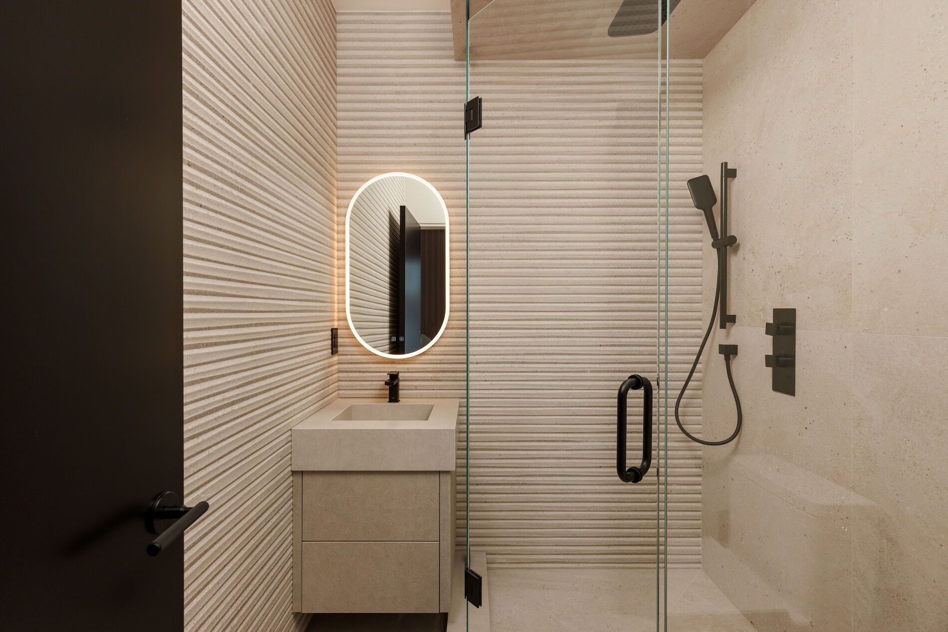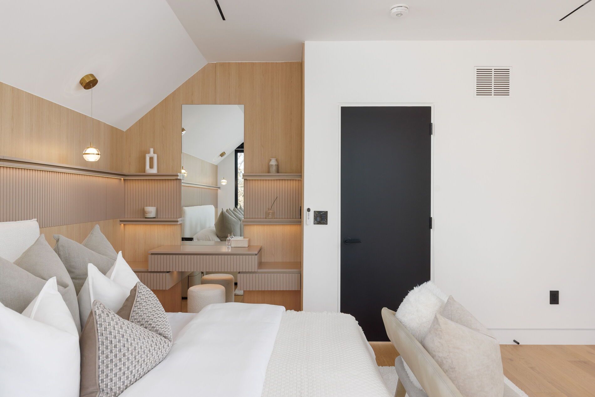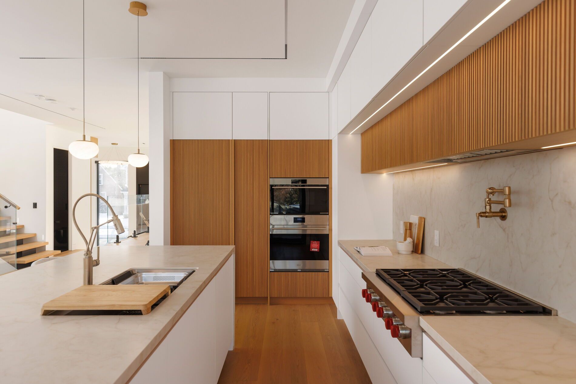 A commanding architectural statement in prestigious stonegate-queensway, this newly completed custom residence is thoughtfully crafted by an hcra-licensed builder and backed by the full tarion warranty. Offering approx 3,650 sq ft of curated living space with 4+1 beds & 5+1 baths, the home is defined by architectural clarity, material integrity & refined restraint. A dramatic 14-ft foyer introduces interiors where soaring ceilings, wide-plank white oak floors, bespoke millwork & a fully trimless shadow-reveal design create crisp, uninterrupted lines and a gallery-like atmosphere, enhanced by layered architectural lighting throughout. A sculptural floating mono-beam staircase wrapped in ultra-clear glass rises as a striking focal point, while a porcelain feature wall with a 3-sided fireplace anchors the principal living space with warmth & presence. The chef's kitchen showcases a waterfall porcelain island, handcrafted fluted cabinetry & a professional sub-zero & wolf appliance suite seamlessly integrated into the design. Expansive walls of glass & 9 skylights draw natural light across every level, complementing curated interior illumination and heightening the home's sense of scale and calm. Integrated control4 automation provides effortless control of lighting, audio, security & motorized window coverings. Upstairs, the primary retreat offers boutique-hotel serenity with custom millwork, a generous walk-in closet & a spa-inspired ensuite finished in rich porcelain & refined fixtures, while each add'l bedroom enjoys ensuite access. The bright walk-up lower level continues the architectural narrative with 10-ft ceilings, a bespoke wet bar, rec lounge, add'l bedroom & full bath. A bold contemporary façade defined by aluminum panel detailing, precision fluted elements & architectural exterior lighting, complemented by professional landscaping, completes this architecturally refined modern residence mins to top schools, waterfront trails, mimico go & downtown toronto.