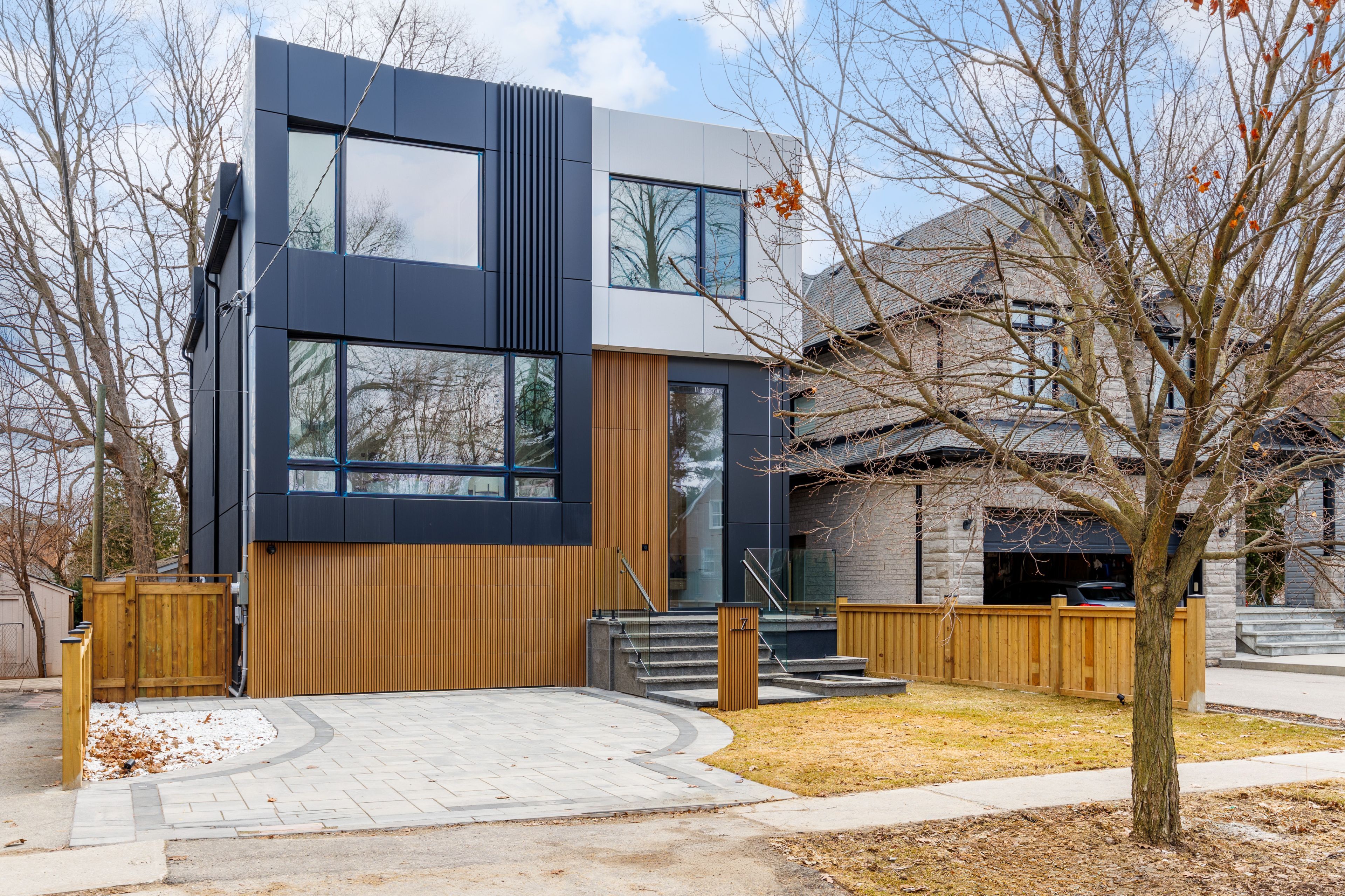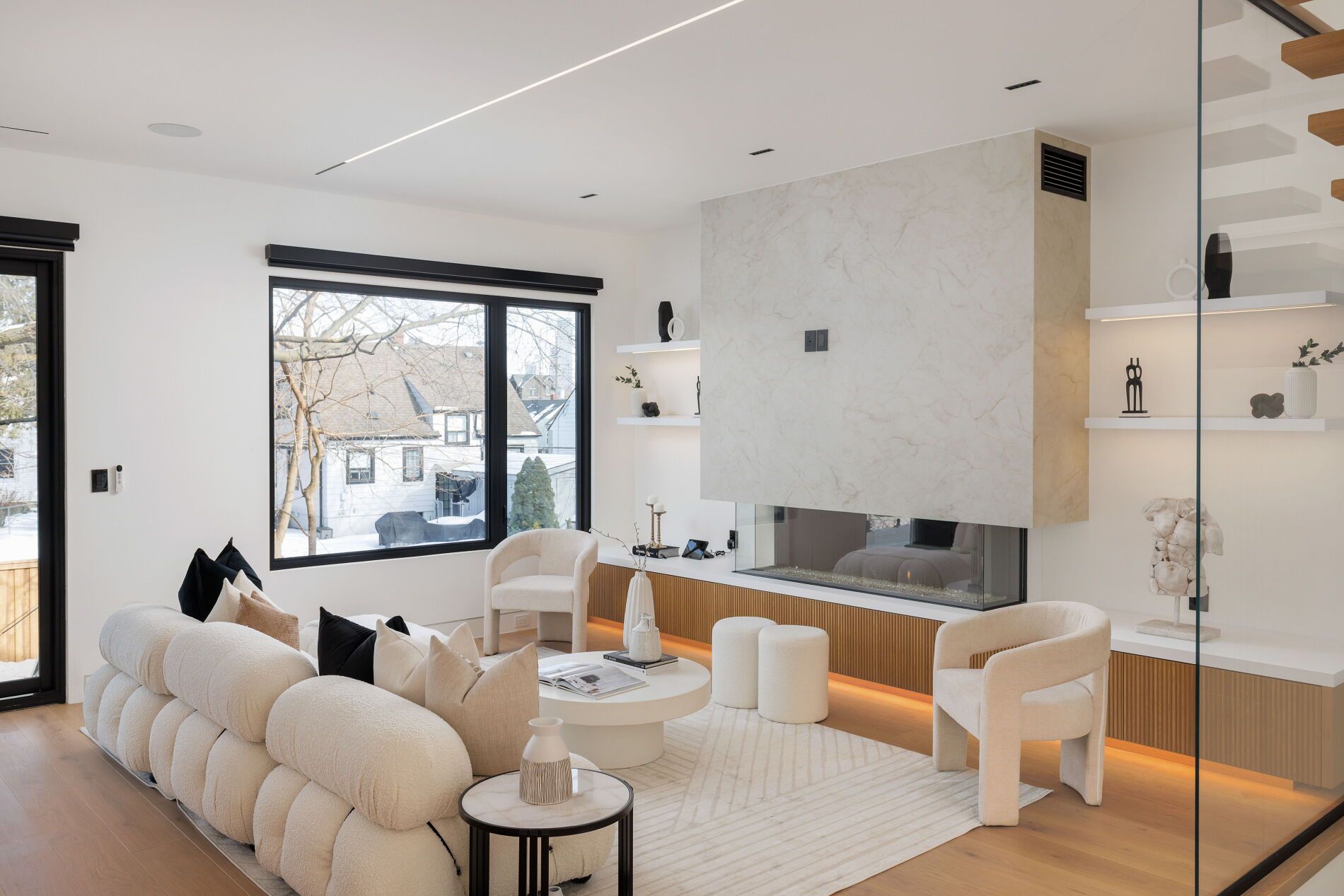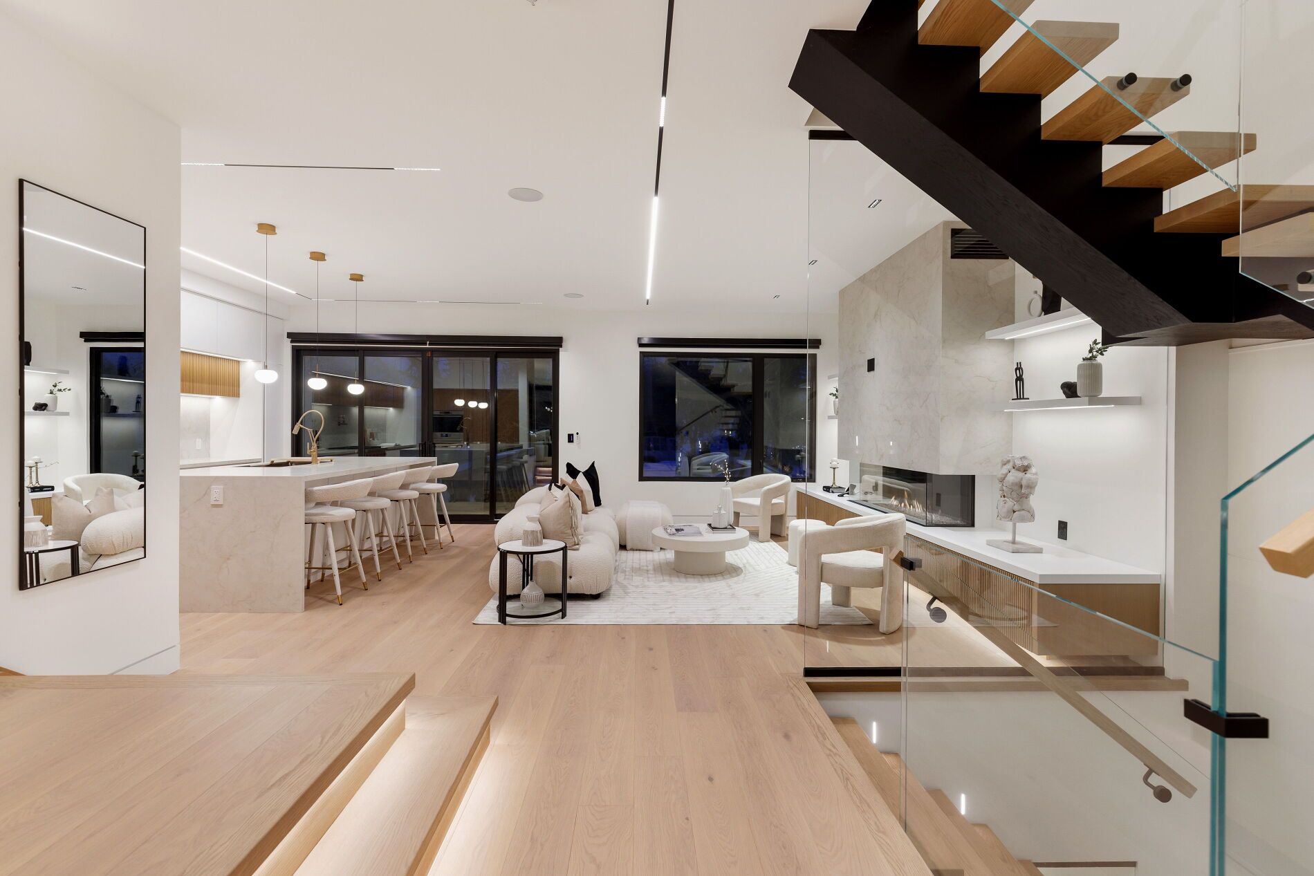 A commanding architectural statement in prestigious stonegate-queensway, this newly completed custom residence is thoughtfully crafted by an hcra-licensed builder and backed by the full tarion warranty. Offering approx 3,650 sq ft of curated living space with 4+1 beds & 5+1 baths, the home is defined by architectural clarity, material integrity & refined restraint. A dramatic 14-ft foyer introduces interiors where soaring ceilings, wide-plank white oak floors, bespoke millwork & a fully trimless shadow-reveal design create crisp, uninterrupted lines and a gallery-like atmosphere, enhanced by layered architectural lighting throughout. A sculptural floating mono-beam staircase wrapped in ultra-clear glass rises as a striking focal point, while a porcelain feature wall with a 3-sided fireplace anchors the principal living space with warmth & presence. The chef's kitchen showcases a waterfall porcelain island, handcrafted fluted cabinetry & a professional sub-zero & wolf appliance suite seamlessly integrated into the design. Expansive walls of glass & 9 skylights draw natural light across every level, complementing curated interior illumination and heightening the home's sense of scale and calm. Integrated control4 automation provides effortless control of lighting, audio, security & motorized window coverings. Upstairs, the primary retreat offers boutique-hotel serenity with custom millwork, a generous walk-in closet & a spa-inspired ensuite finished in rich porcelain & refined fixtures, while each add'l bedroom enjoys ensuite access. The bright walk-up lower level continues the architectural narrative with 10-ft ceilings, a bespoke wet bar, rec lounge, add'l bedroom & full bath. A bold contemporary façade defined by aluminum panel detailing, precision fluted elements & architectural exterior lighting, complemented by professional landscaping, completes this architecturally refined modern residence mins to top schools, waterfront trails, mimico go & downtown toronto.