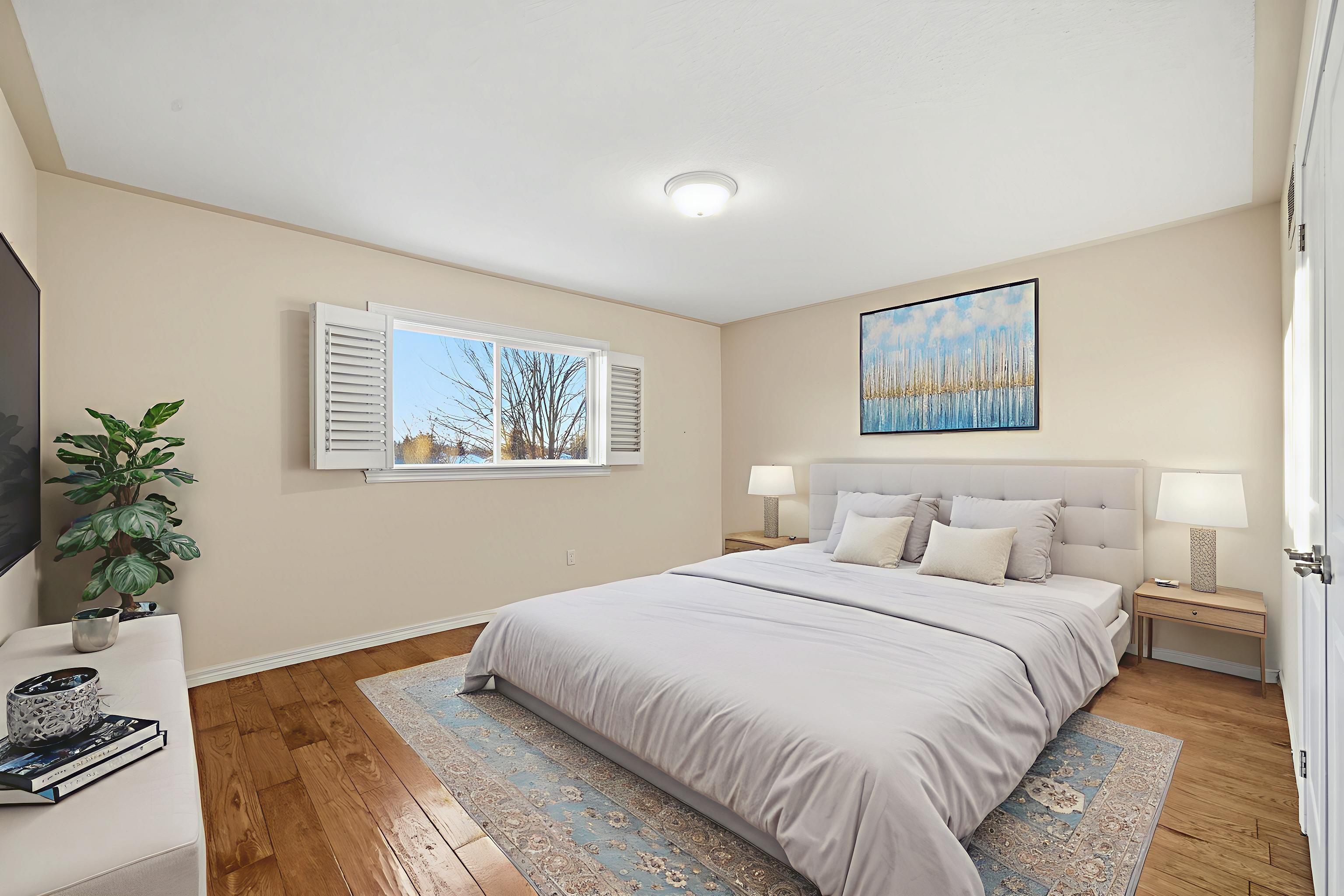 Beautiful raised bungalow within walking distance to parks and trails. The main level offers hardwood floors and an open-concept kitchen and family room, with the family room featuring a cozy gas fireplace and juliette balcony. Two bedrooms on the main floor include a primary suite with a walk-in closet and 3-pc ensuite with a walk-in shower! A second full bath, main floor laundry, and garage access from inside the home adds even more convenience. The lower level provides a third bedroom, 3-pc bath, hobby room, generous storage, and a massive rec room with a basement walkout to the private, landscaped backyard with mature trees, perennial gardens, interlock patio, hard-top gazebo, and a charming garden shed. You won't want to miss this one!
