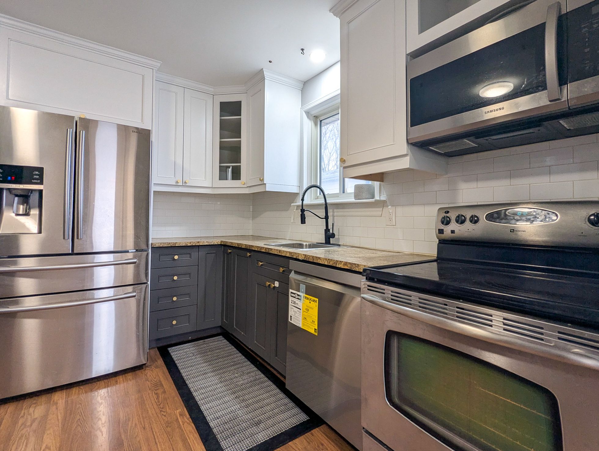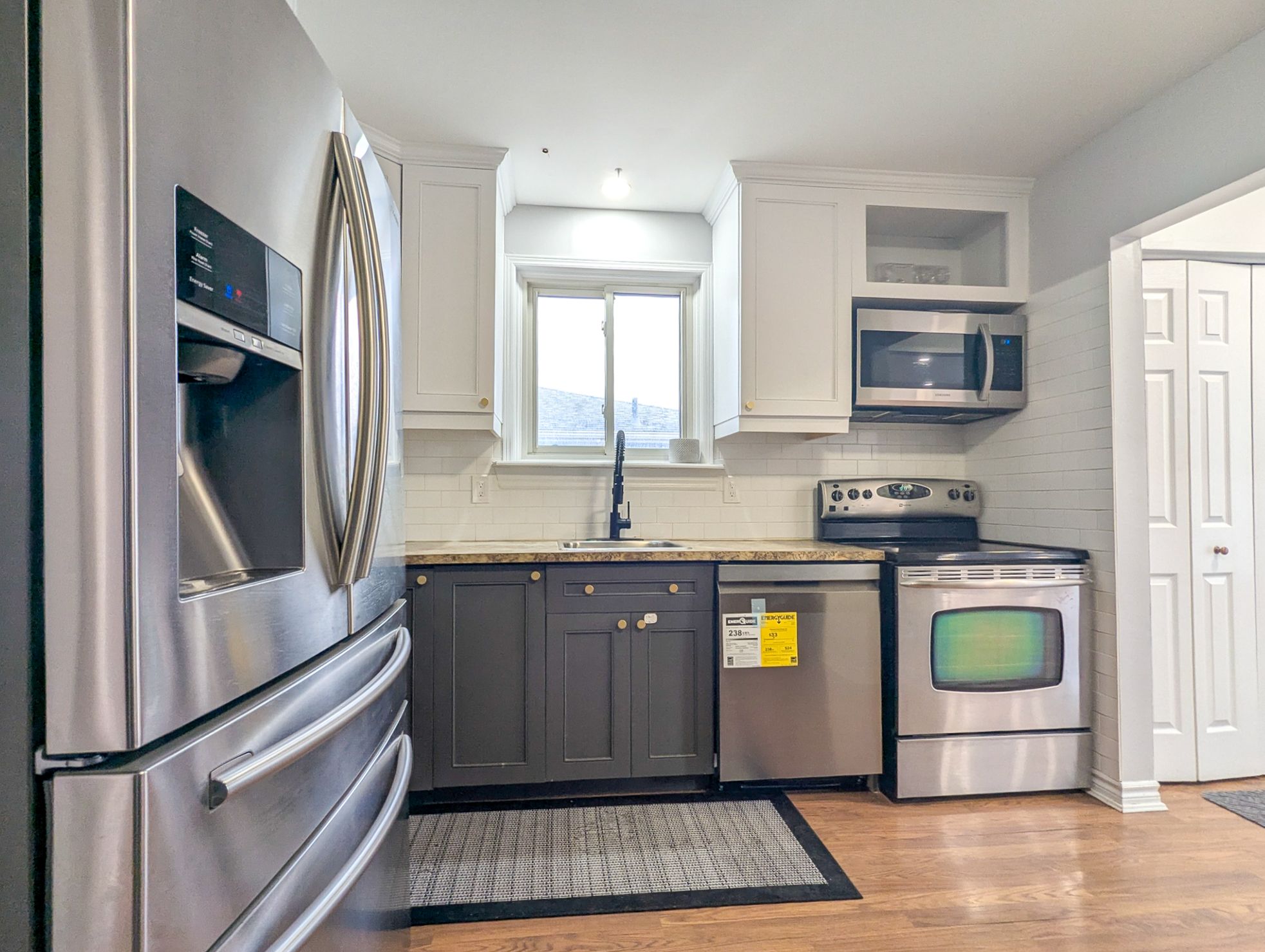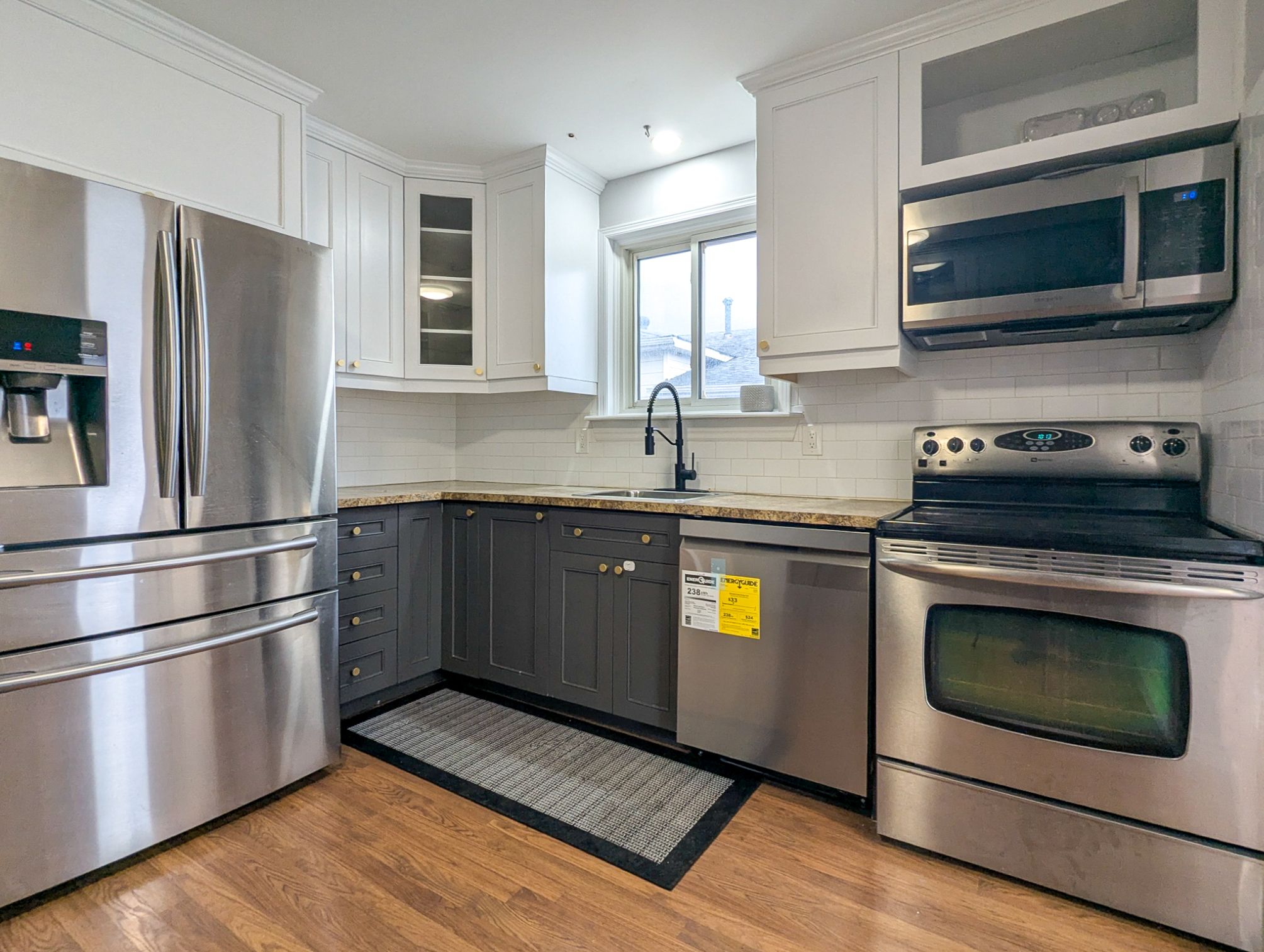 • Modern kitchen featuring stainless steel appliances.