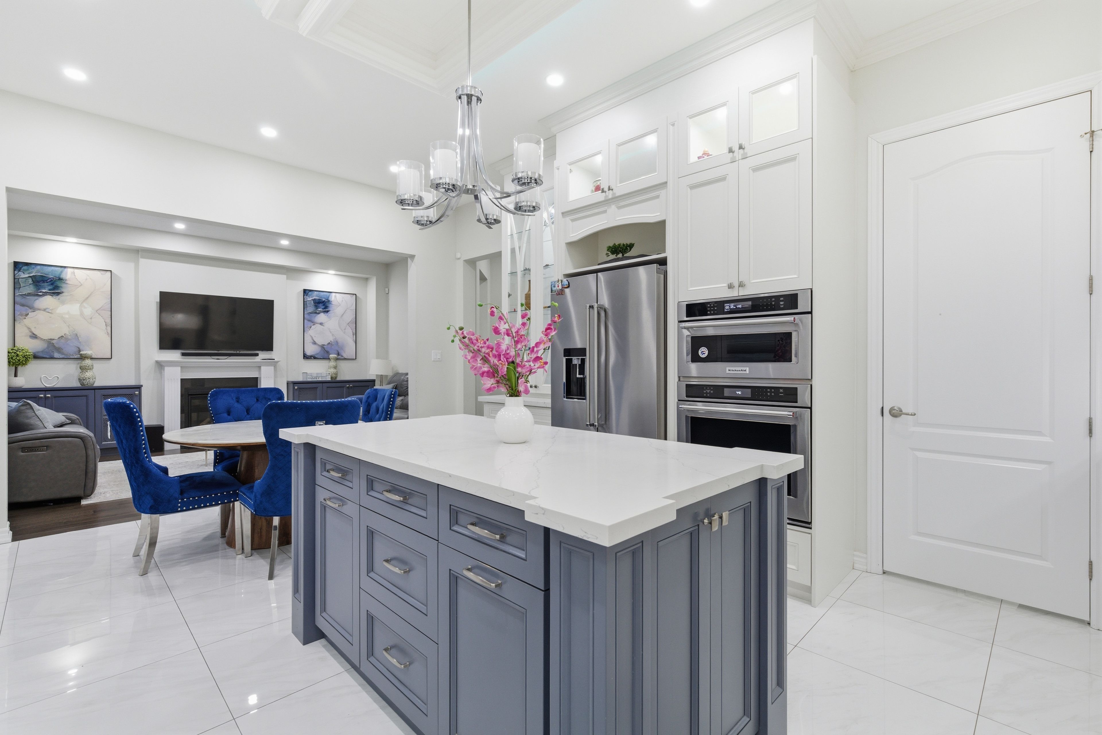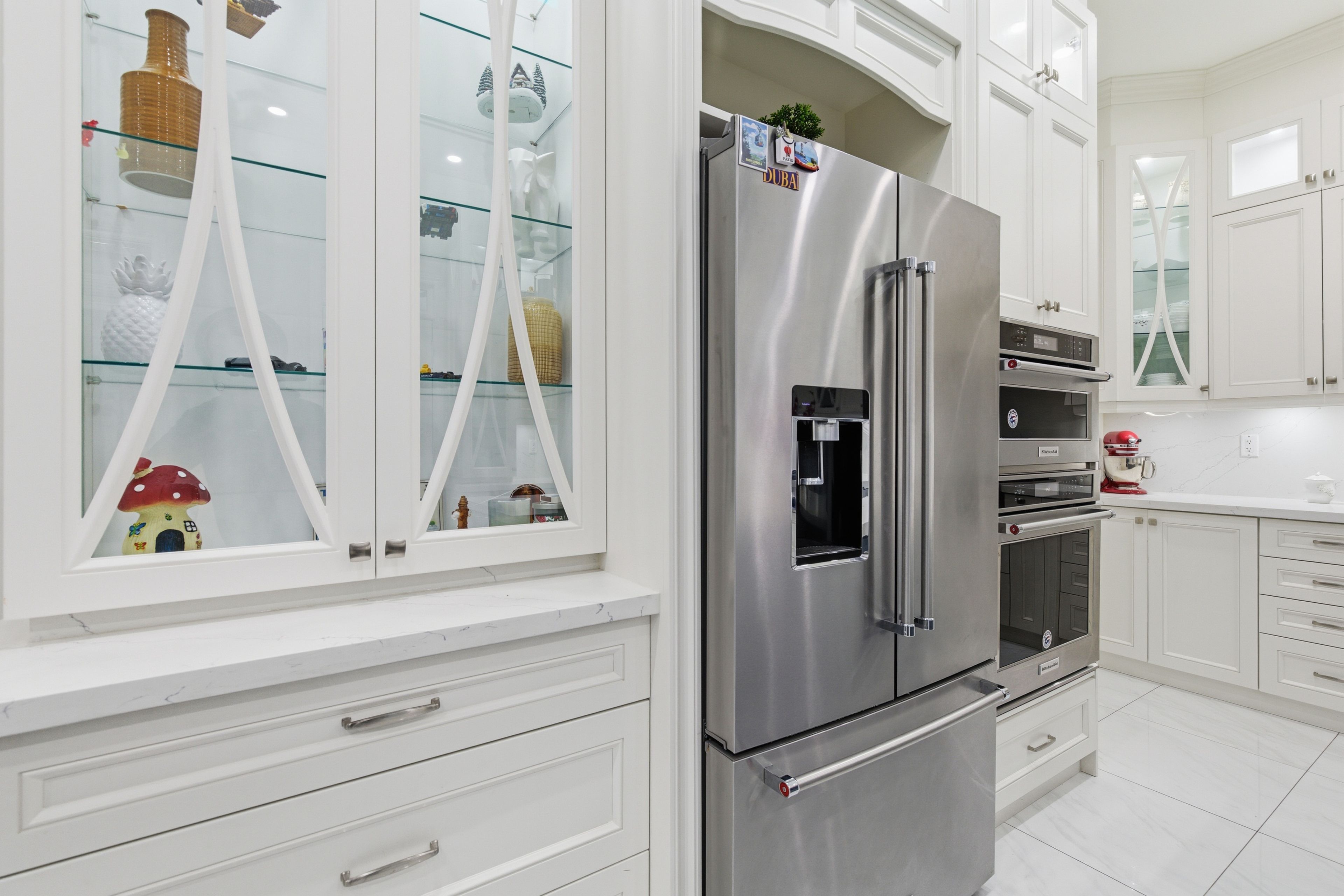 • High-end kitchen with built-in stainless steel appliances for cooking and entertaining.