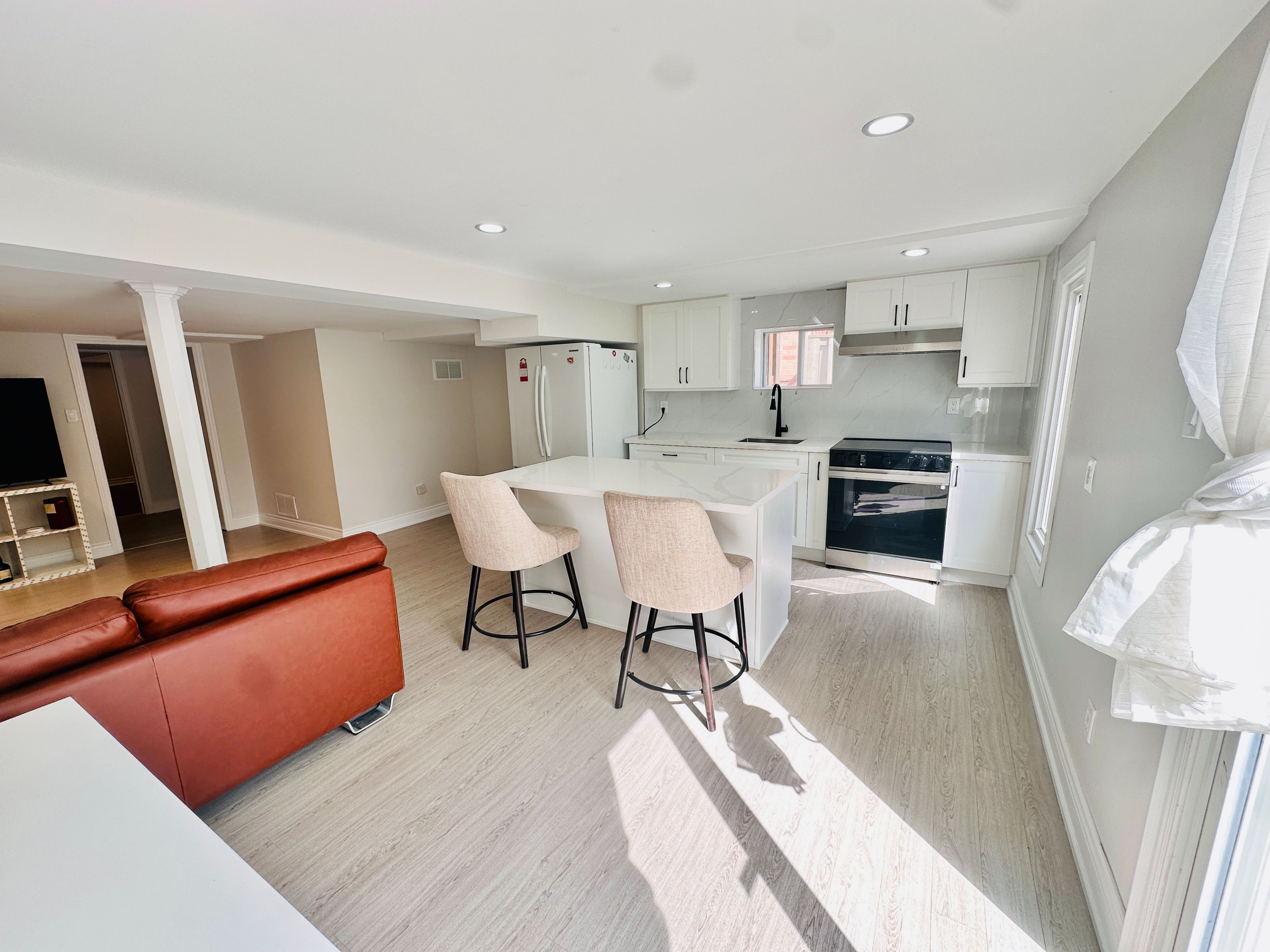 • Bright and spacious living area with a modern kitchen and luxurious island.