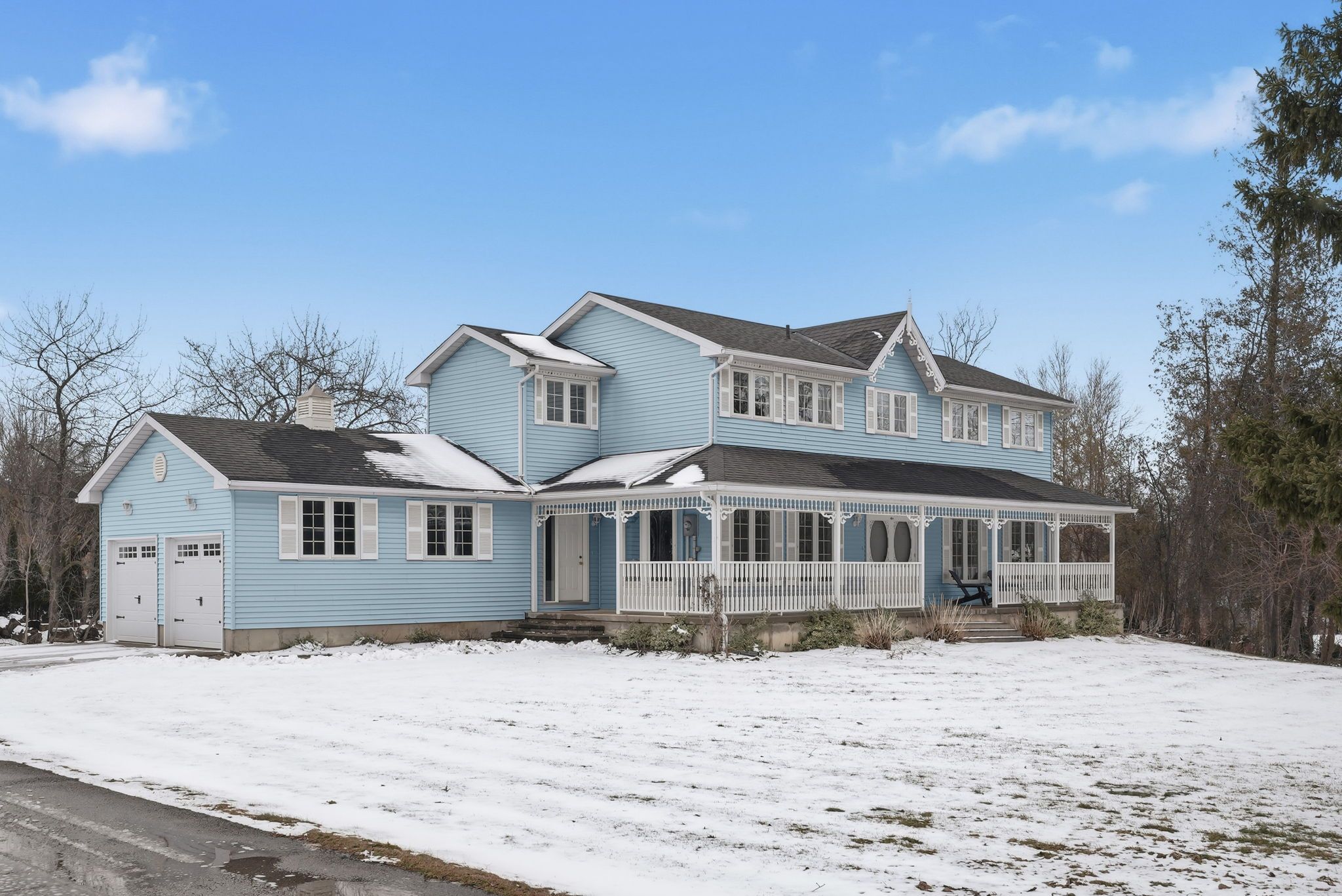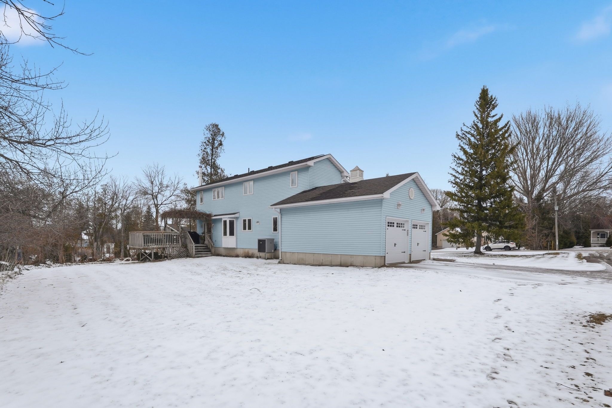 This spacious two-story family home with four bedrooms and three baths is set on a large treed lot, just a quick 2-minute drive north of kincardine and 400 meters from the beautiful lake huron beaches. Designed as a viceroy lancaster model, it features a full-width covered front porch and large windows that flood the space with natural light. The main floor showcases an open-concept kitchen and dining area equipped with newer cabinetry and an island ideal for meal preparation. A patio door leads to a generously sized deck, perfect for entertaining guests. Completing the main floor are a cozy living room, an office/sitting area, a laundry room, and a convenient two-piece bathroom. On the upper level, you'll find a spacious master suite with a walk-in closet and an ensuite bathroom, along with three additional bedrooms and a four-piece bathroom. This property also includes a two-car garage, a storage shed, and an impressive 943 square feet of basement space awaiting your personal touch. With an efficient heat pump, a forced air electric furnace, and a vermont castings wood stove, this home offers both comfort and efficiency. Nestled on a nearly half-acre lot with apple and cherry trees, you'll enjoy the openness and privacy of country living, all while being just minutes from town. Don't miss out on this fantastic opportunity!
