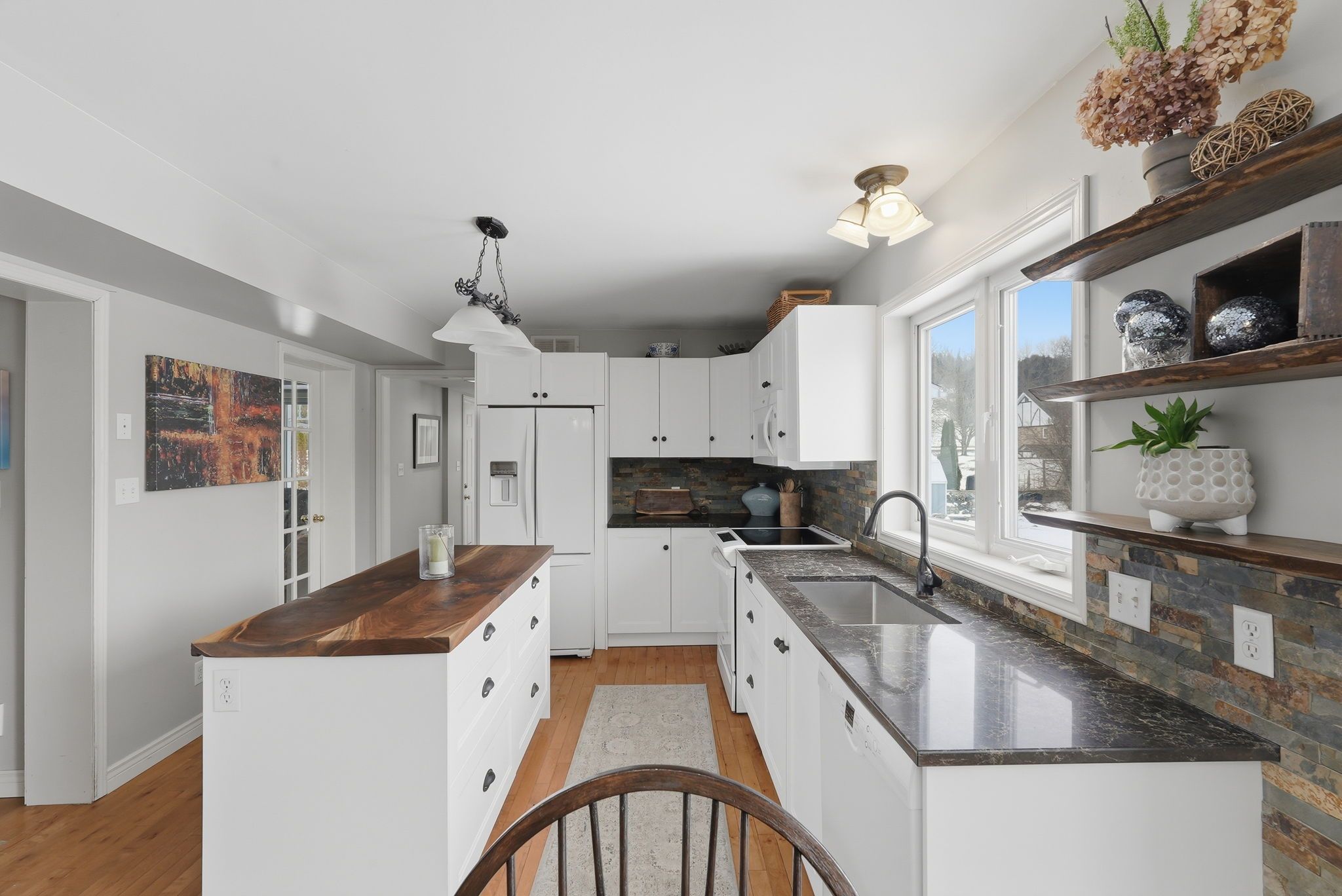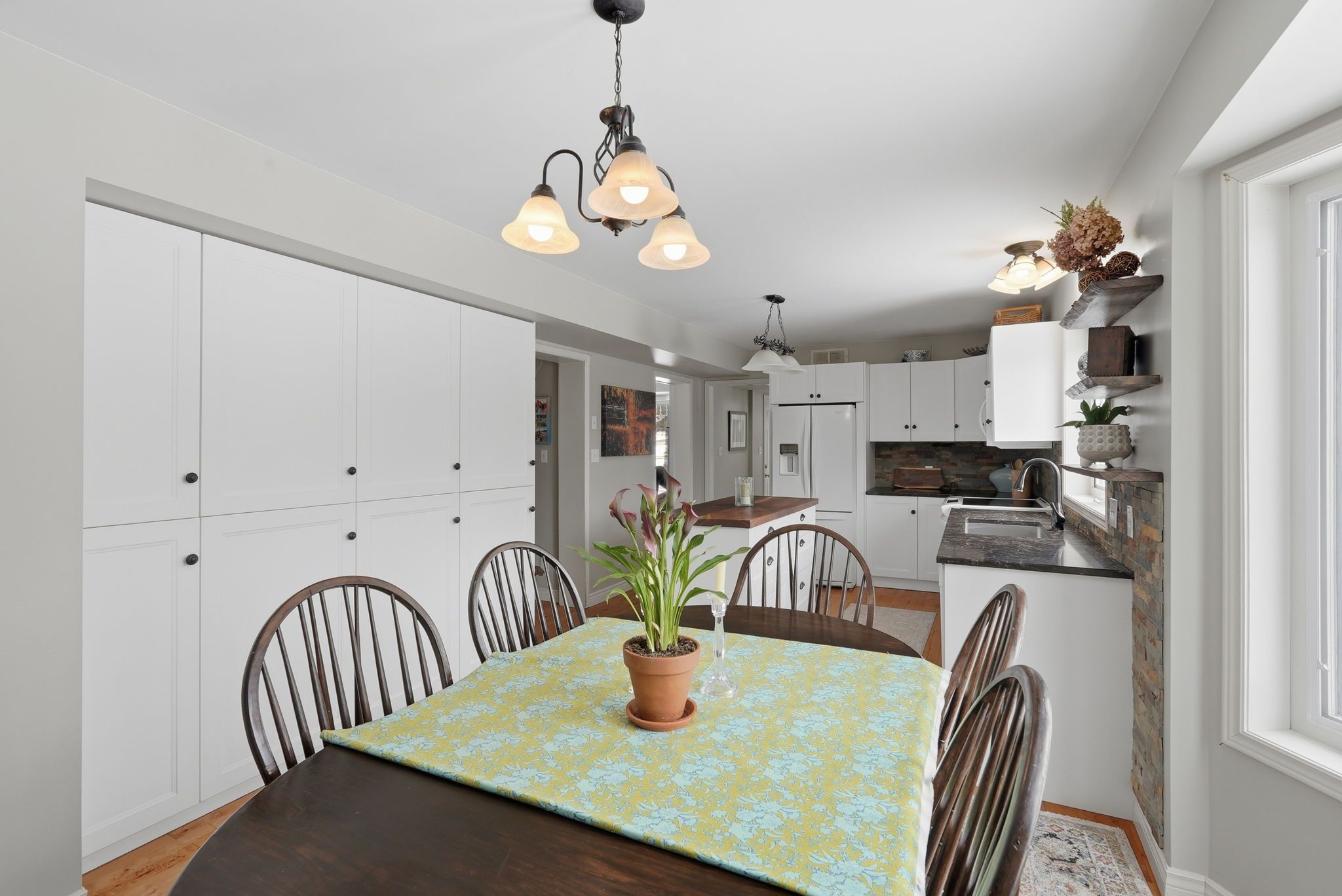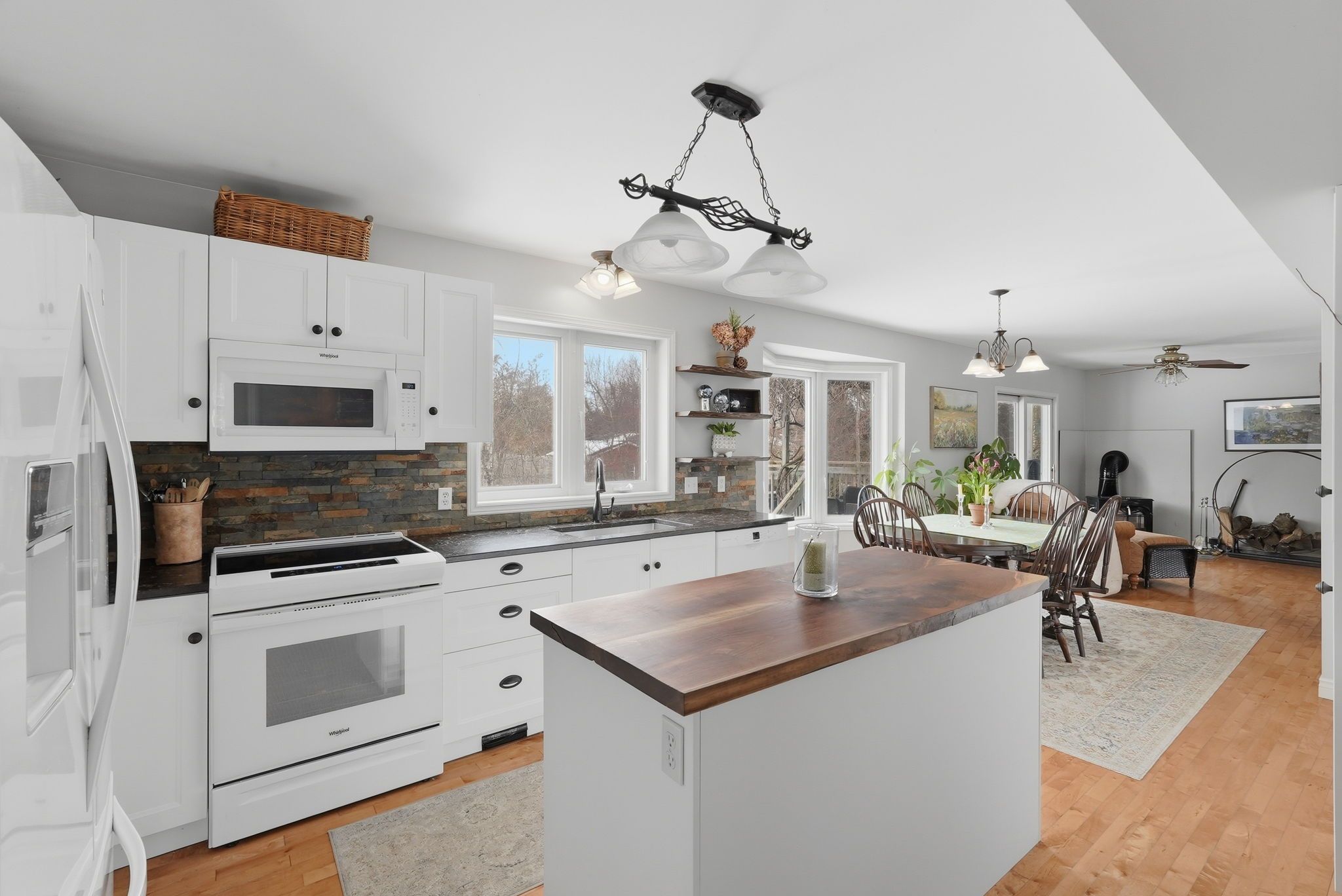 • Open-concept kitchen and dining area with newer cabinetry and island for meal prep.
