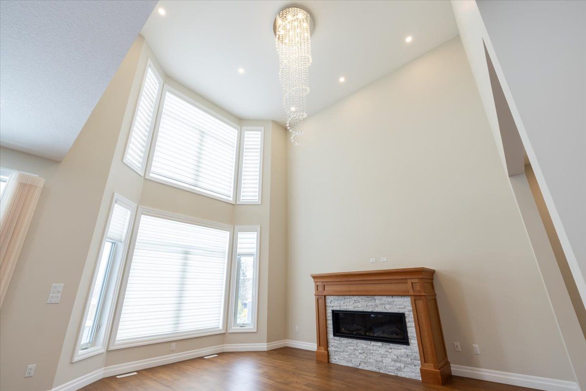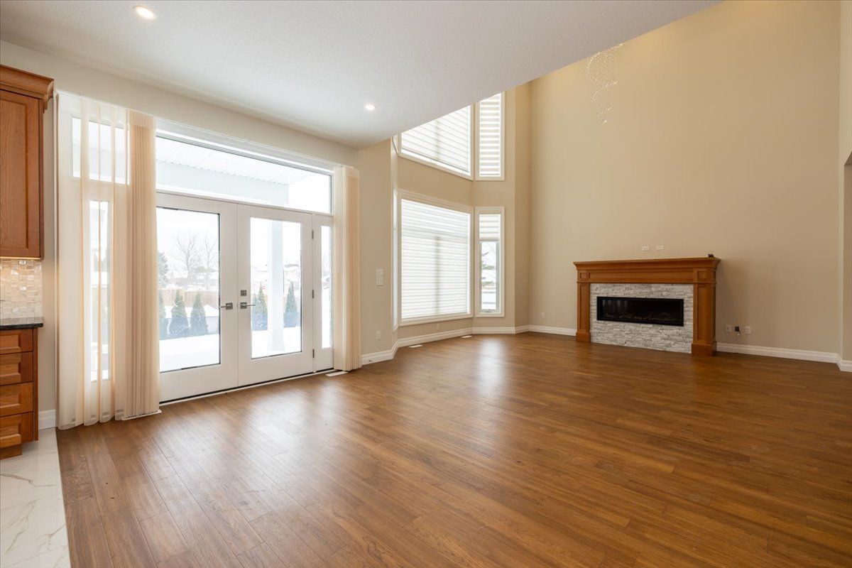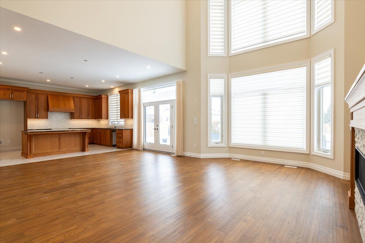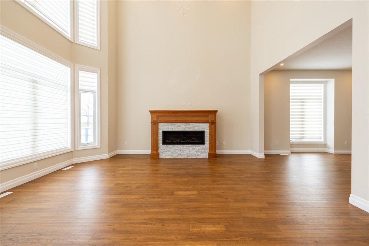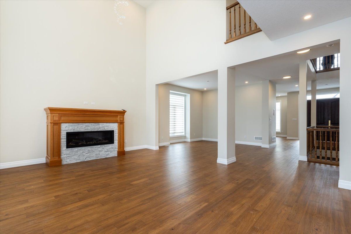 • Grand great room features two-storey ceilings and a striking fireplace.