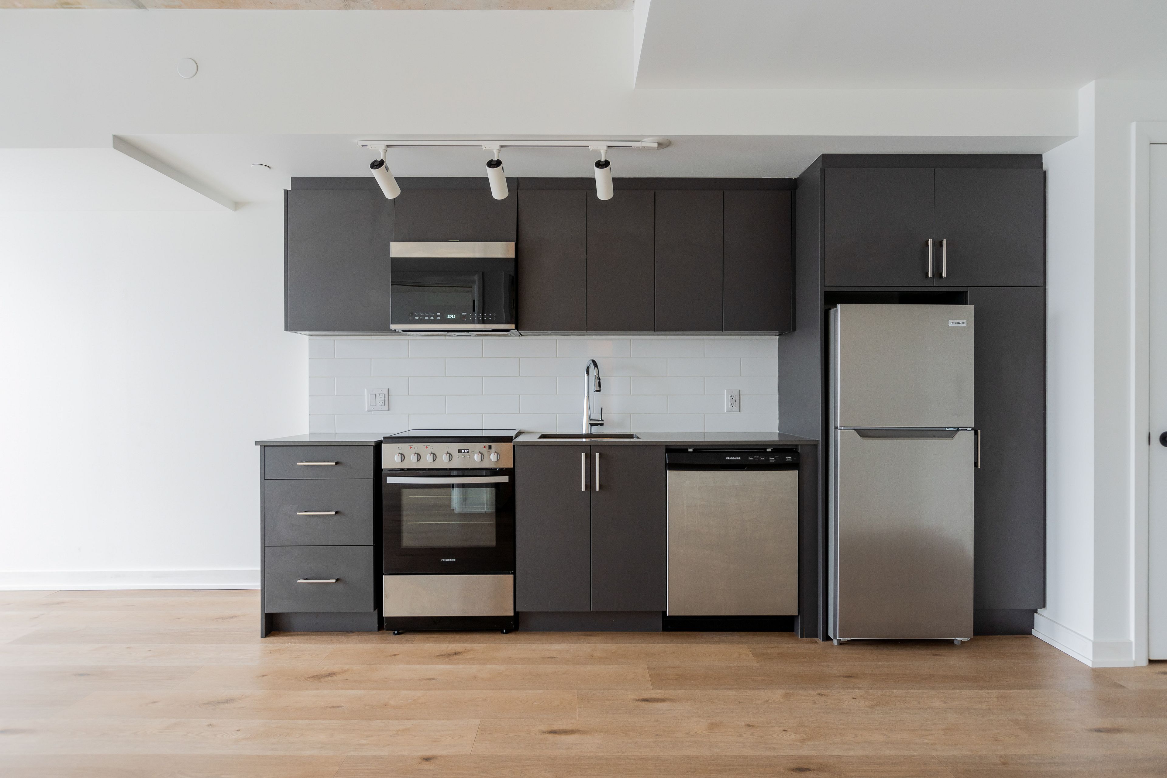 • Modern kitchen with stainless steel appliances and ensuite laundry.