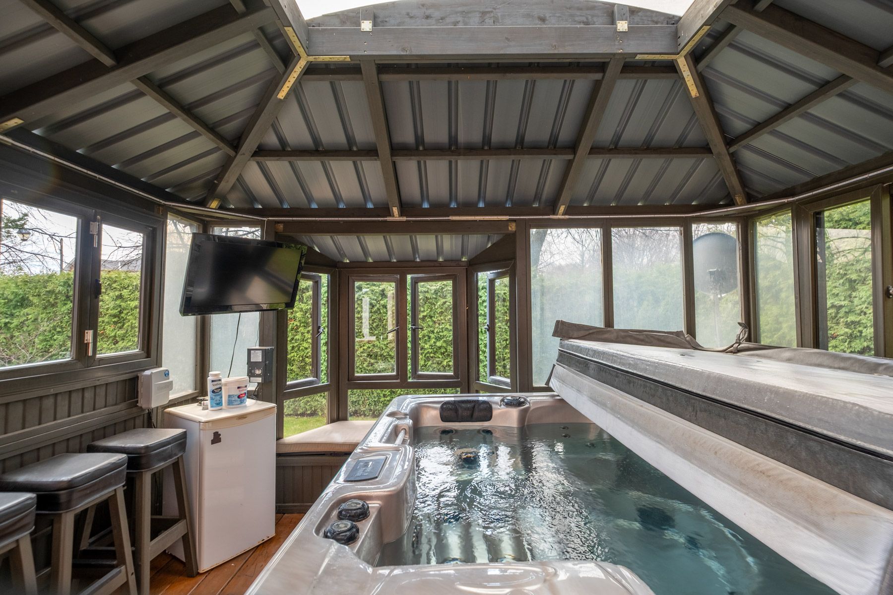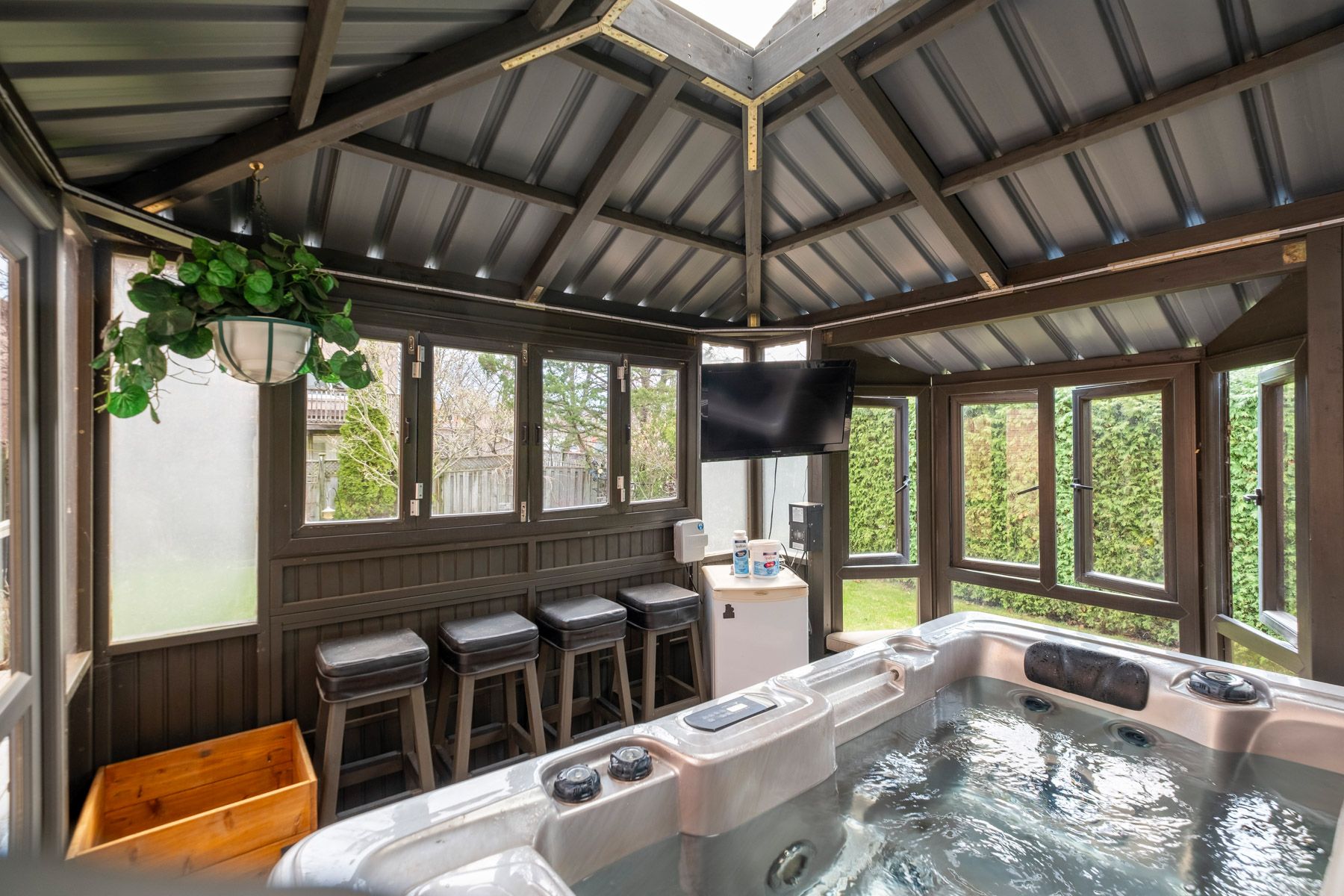 • Outdoor area features a gazebo and hot tub for relaxation.