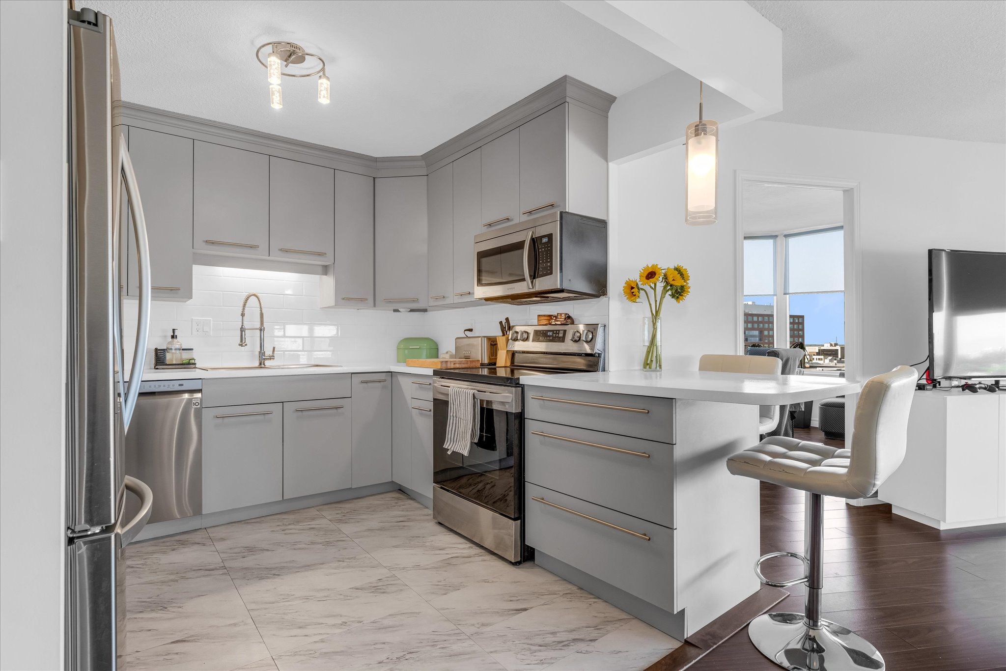 Welcome to this beautifully updated 2-bedroom, 2-bath suite offering impressive downtown views and everyday convenience in one exceptional package. From the moment you step inside, a spacious foyer opens into a bright, inviting living area where expansive windows frame the city beyond. The open-concept kitchen flows seamlessly into the main living space, creating an ideal setting for entertaining or relaxed evenings at home. The versatile den has been thoughtfully transformed into a dedicated dining area complete with a built-in bar/coffee station - a stylish touch that adds both function and personality. The primary bedroom features a walk-in closet and a beautifully remodeled ensuite. A second full bathroom and in-suite laundry provide practical ease, while modern updates throughout ensure a move-in-ready experience with nothing left to do. Enjoy elevated views of the downtown core from the comfort of your living space - sparkling city lights at night and open skyline views during the day. This well-managed building offers exceptional amenities including an indoor pool, exercise room, billiards room, workshop, reading lounge, and observatory rooms with panoramic city views. Condo fees include hydro, heat, individual thermostat control, water, sewer, bell fibe tv, unlimited wireless internet, parking, building insurance, and common elements - outstanding value with predictable monthly costs. Close to downtown. Close to everything. Simply move in and enjoy.