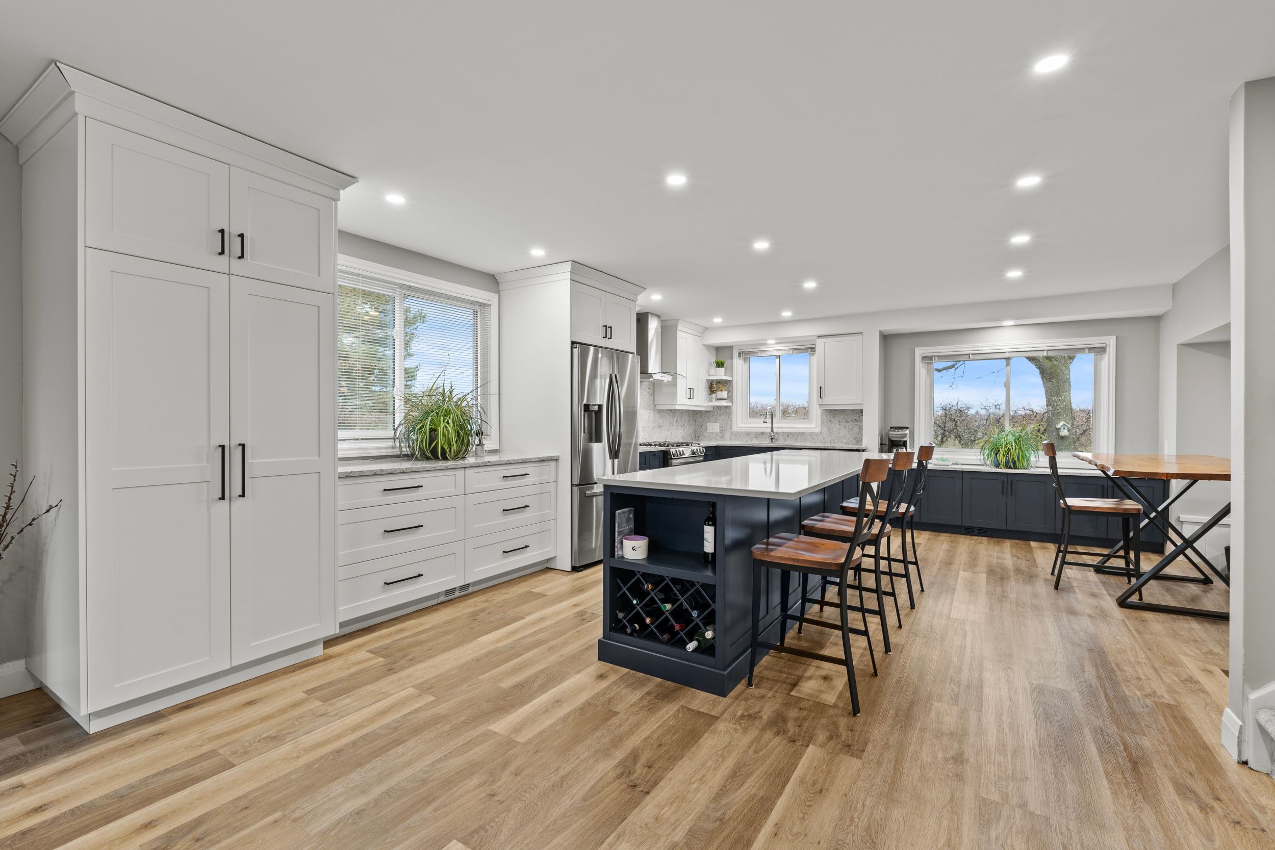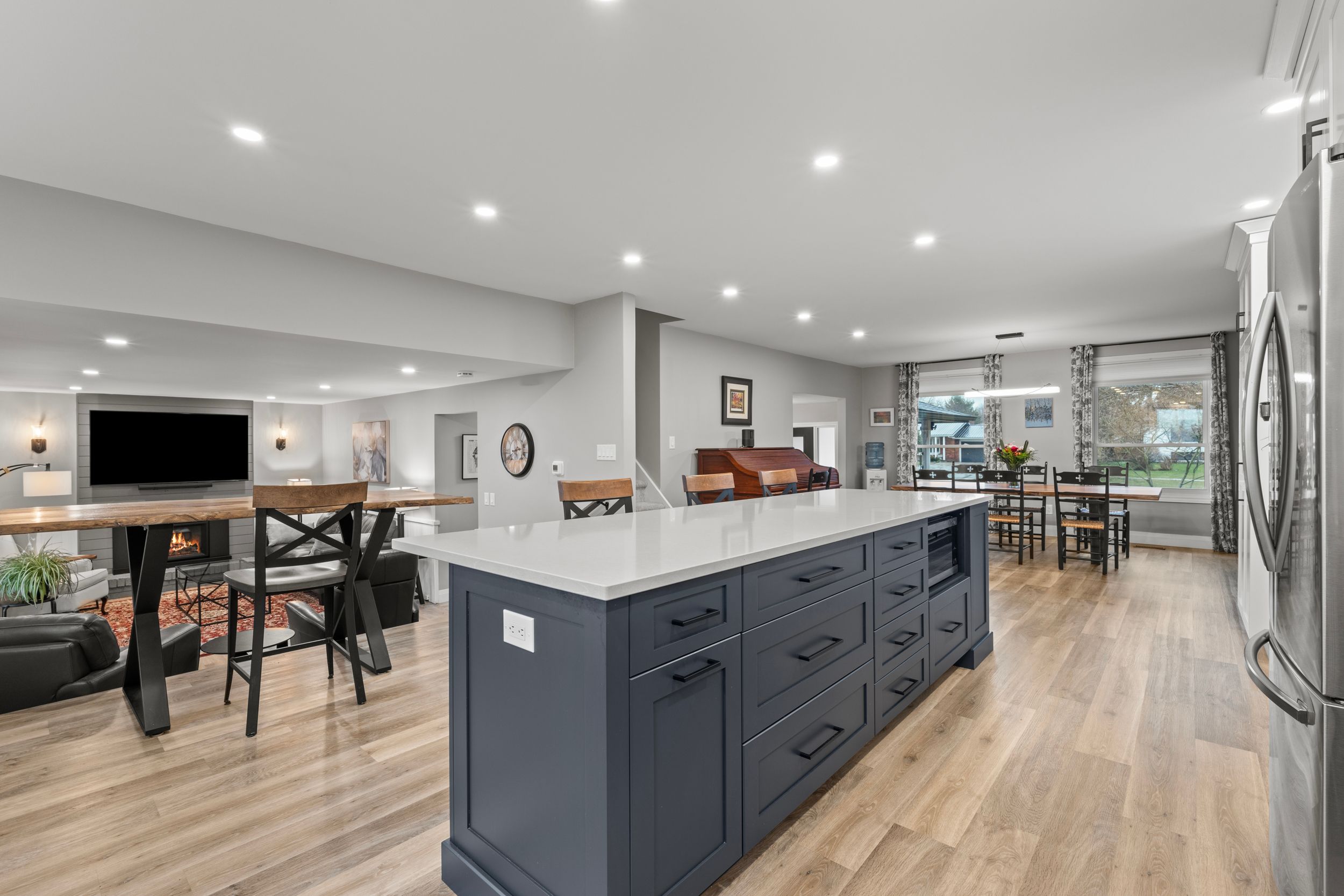 • Open-concept kitchen with a massive quartz island, perfect for hosting.