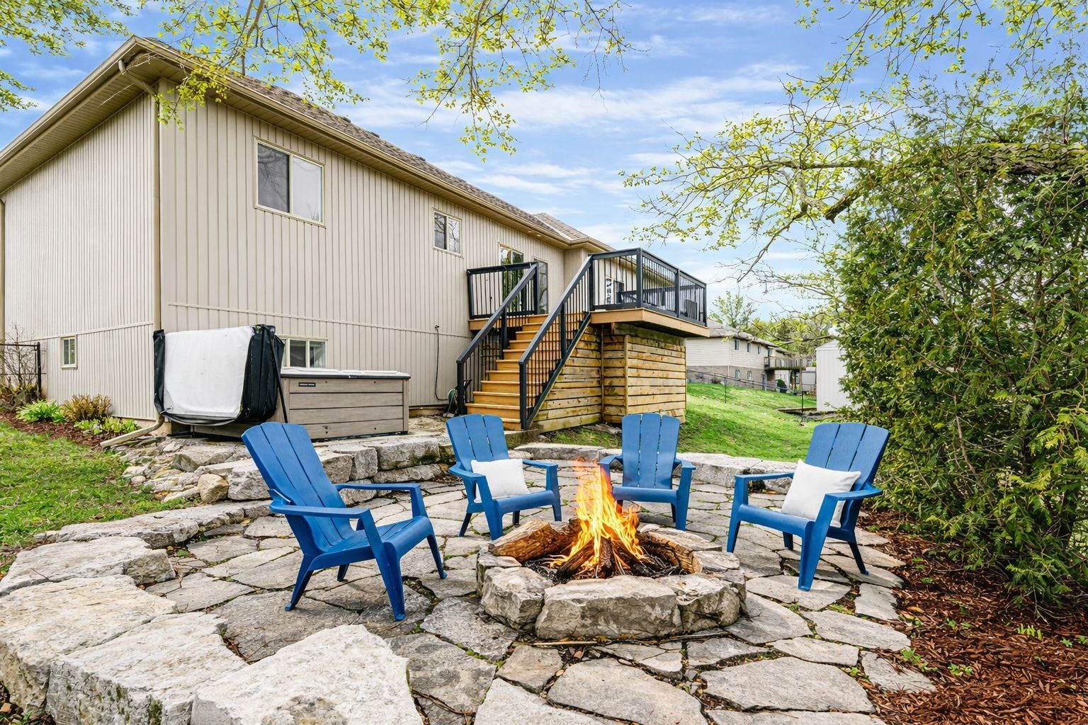 • Private backyard with a hot tub and fire pit for year-round outdoor enjoyment.