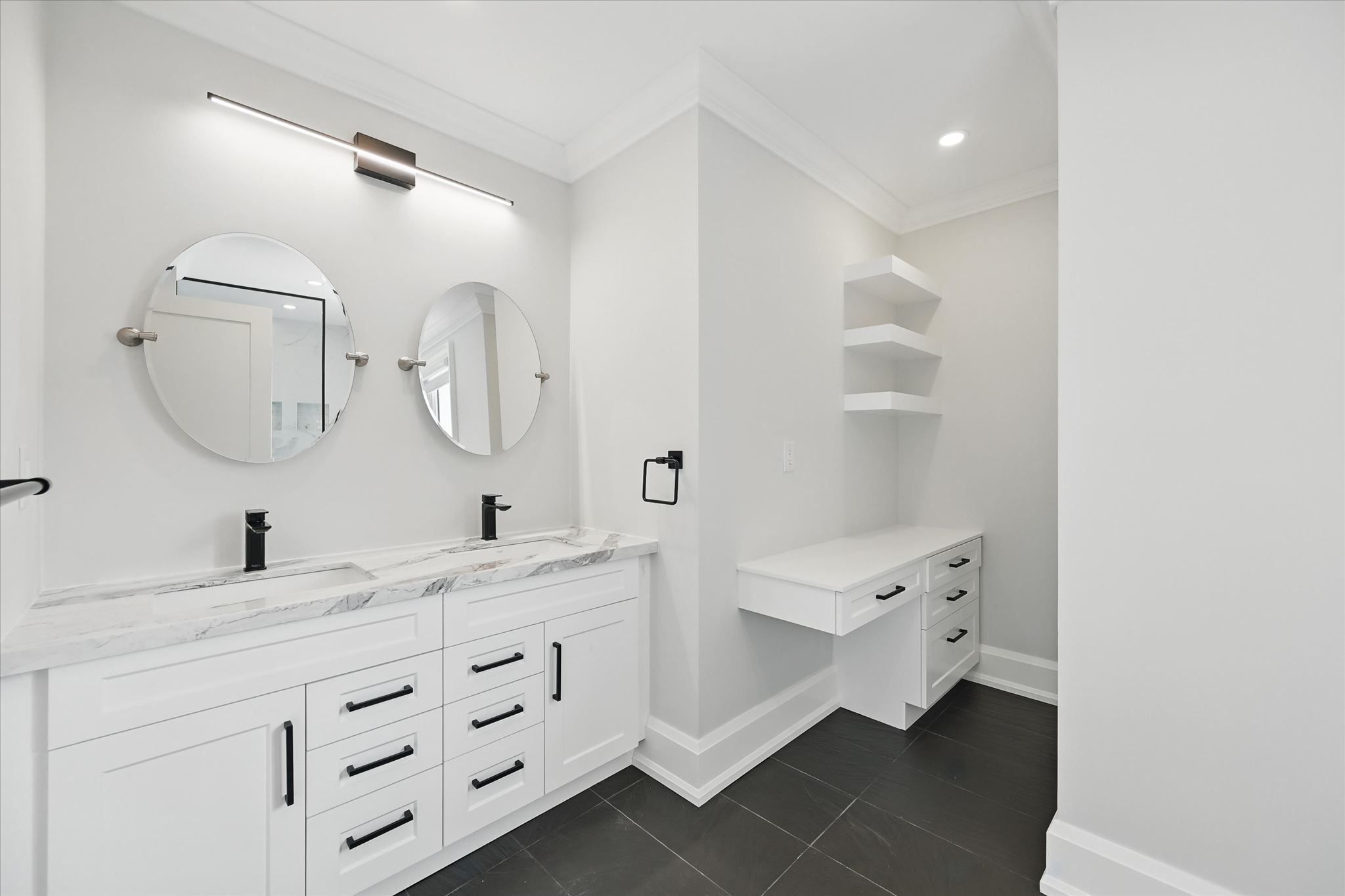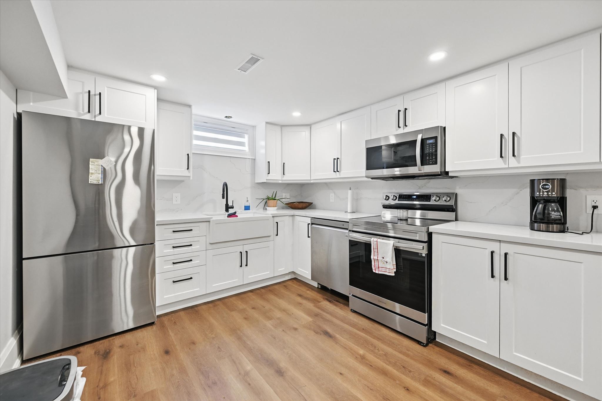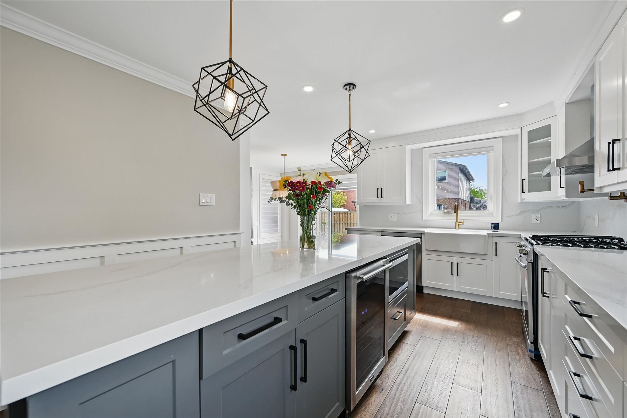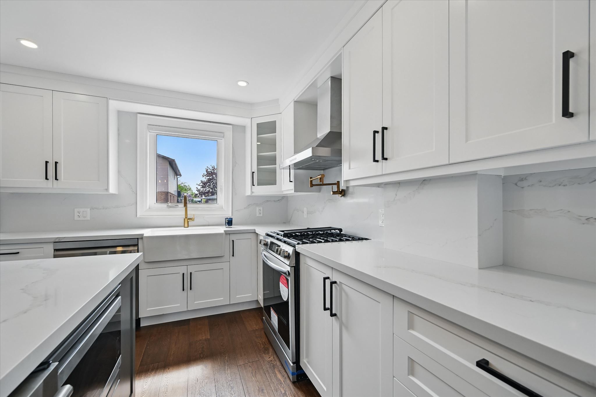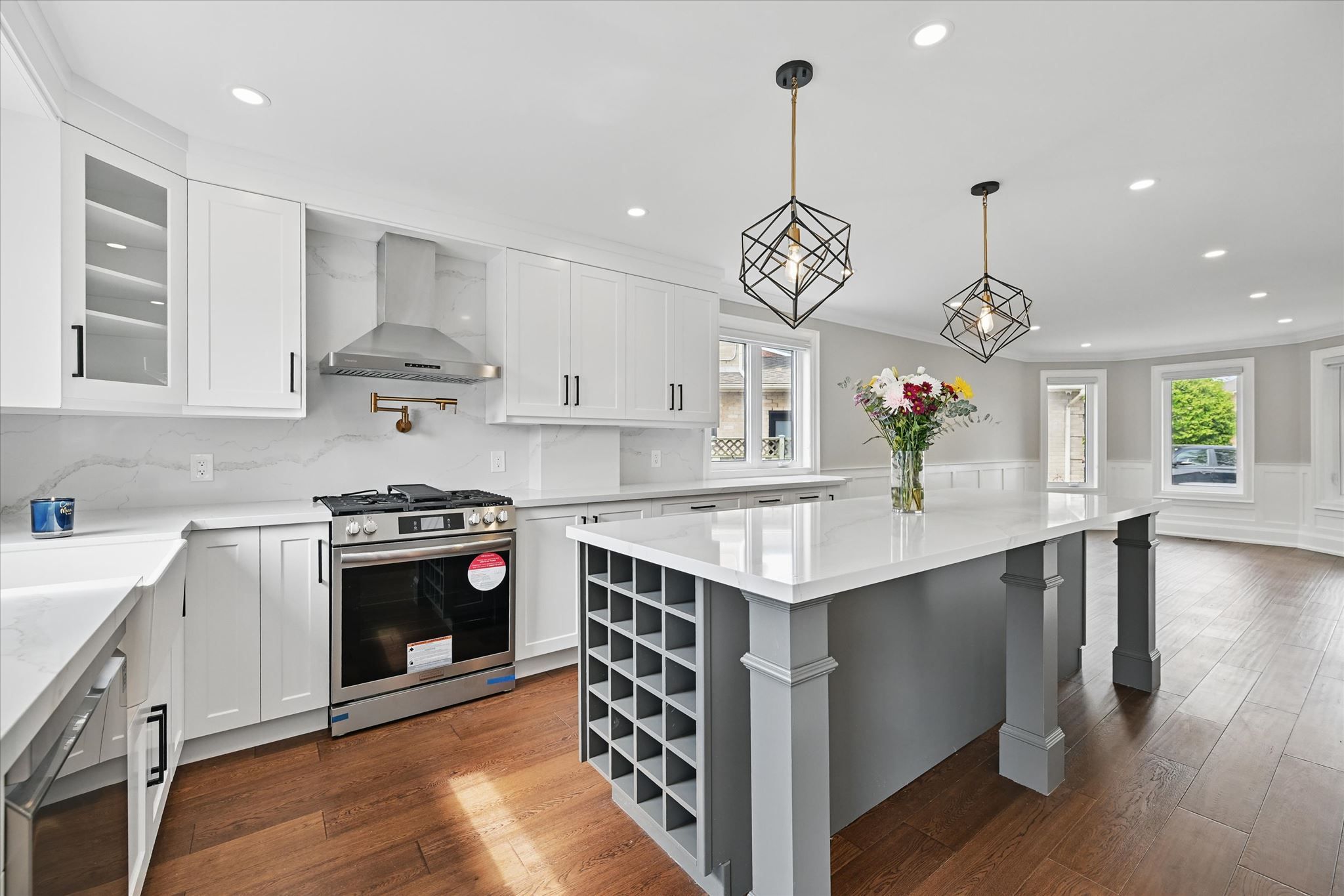 • Modern kitchen with quartz counters and gas range for cooking enthusiasts.