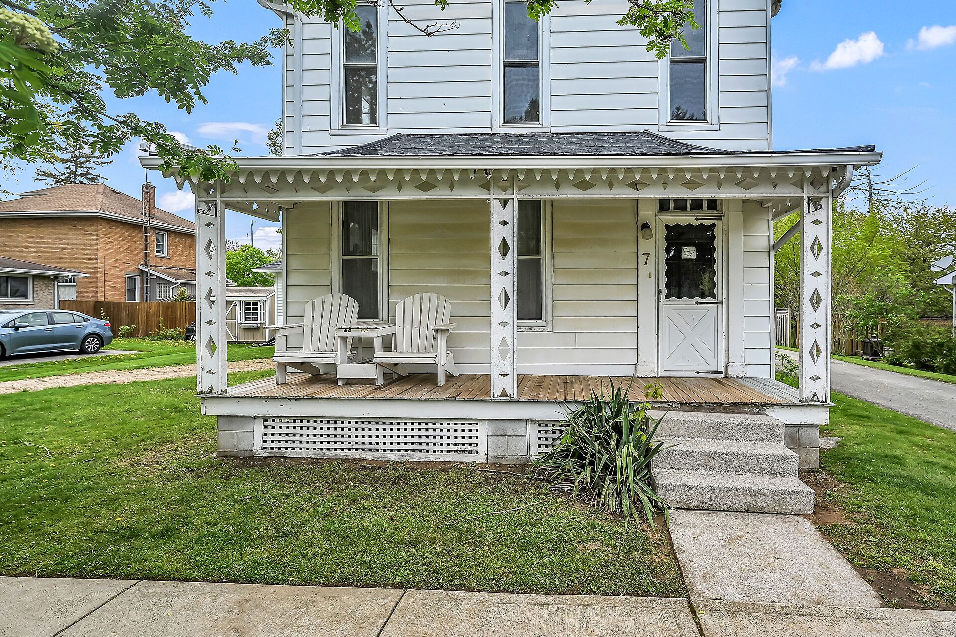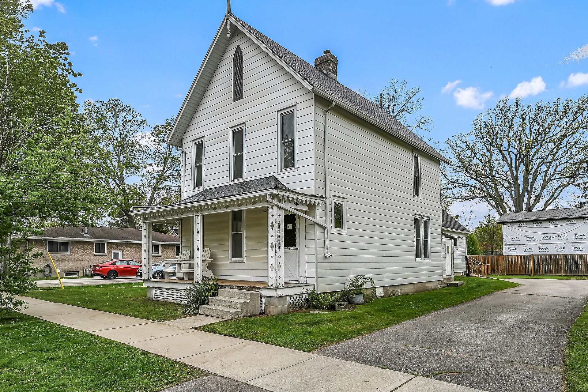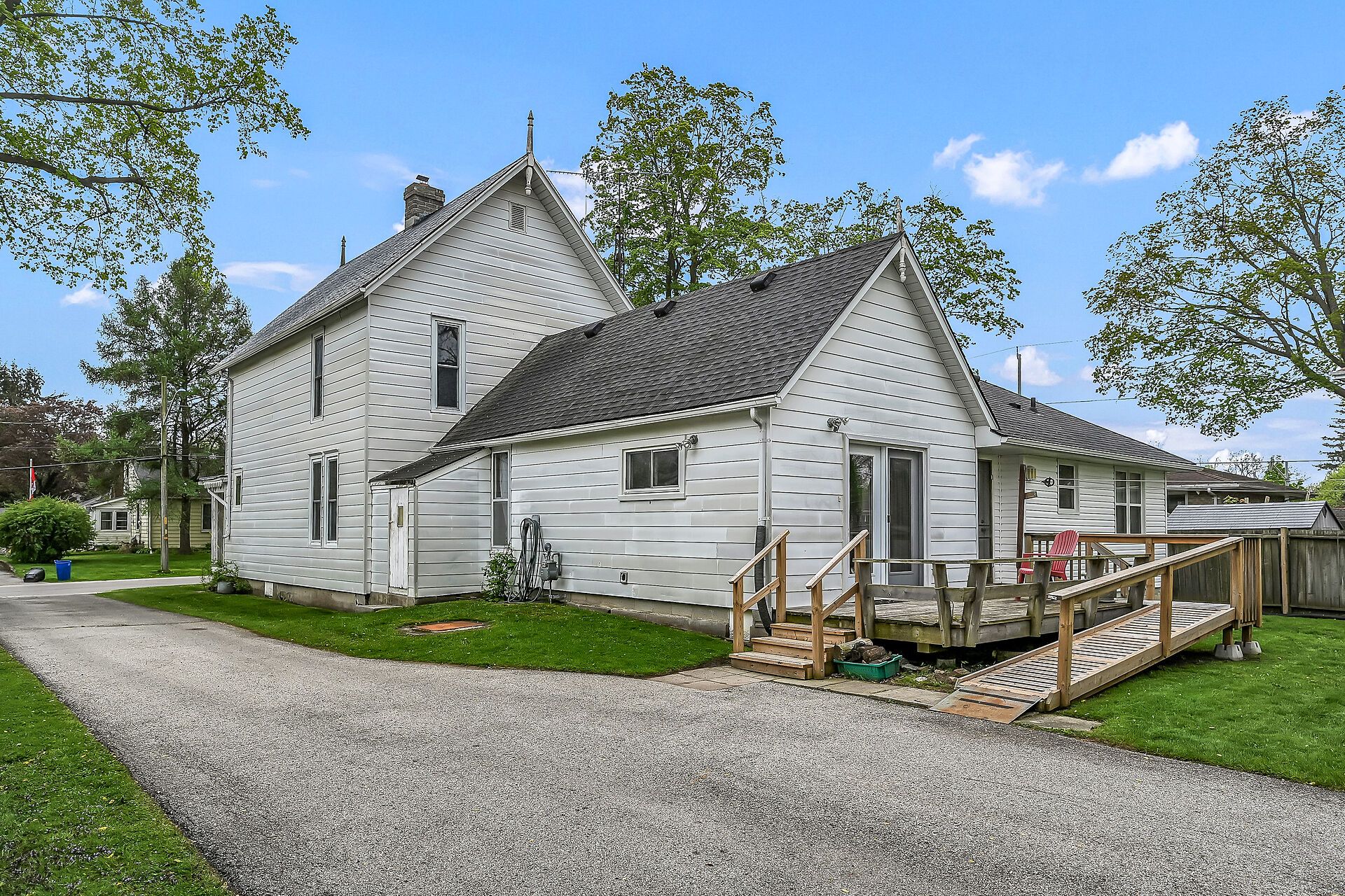 Stately 2 storey "dover classic" plus 2017 in-law style addition located in the heart of port dover - near schools & churches - walking distance to all of this popular lake erie town's sought after amenities - including live theatre, weekly "music in the park" attractions, eclectic shops, trendy eateries, mini golf, links style golf course & famous beach front. Positioned proudly on huge, mature 0. 23 acre treed lot, the tastefully appointed home boasts quaint covered front porch & paved driveway extending to back yard where 128sf rear deck landing leads to separate doors accessing both primary & addition section. The freshly redecorated original home introduces 2,210sf of well preserved, character filled living area incs 1,077 sf of original main level living space sporting spacious multi-purpose room ftrs garden door deck walk-out - segues to functional kitchen - then pass thru french doors to inviting living room enhanced with authentic wood burning natural stone fireplace - continues to similar themed family room incs reverse side of stone fireplace - completed with welcoming front foyer. Ornate staircase ascends to 625sf - 3 bedroom upper level flanking 4pc bath. Beautifully refinished period hardwood flooring & heavy wood baseboards/trim compliment timeless décor with yesteryear's flair. Versatile 180sf service style partial basement houses newer n/g furnace equipped with ac-both new 2022, n/g hot water heater (rental), sump pump & new 200 amp hydro panel-2025. Bright 498sf west-wing addition, built in 2018, provides the perfect multi-generational venue for either parents and/or children and/or an economic rental option. Ftrs open concept design highlighted with living room/kitchenette, sizeable bedroom, 4pc bath & foyer - accented with low maintenance vinyl flooring. Attractive & affordable - unbeatable combination!