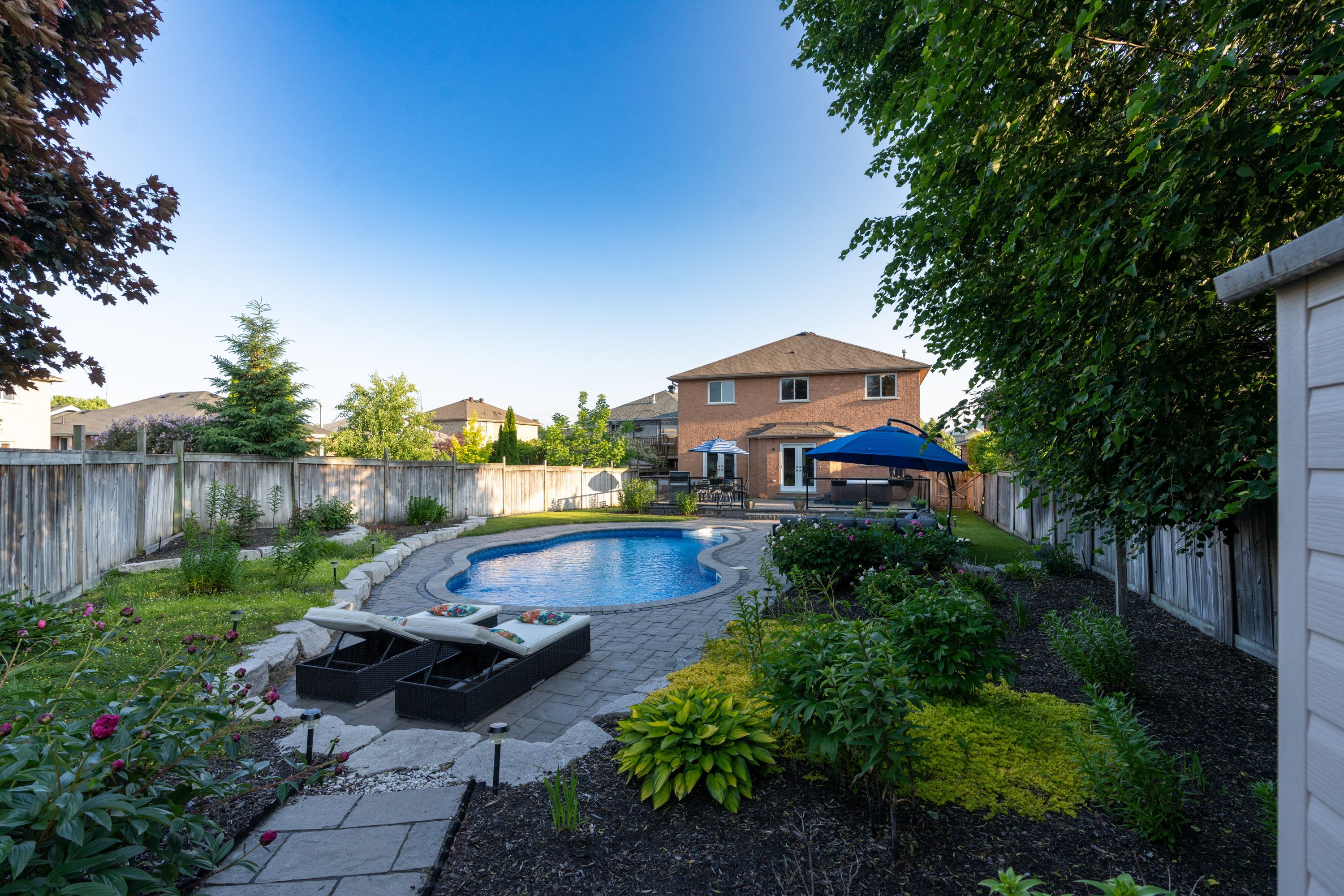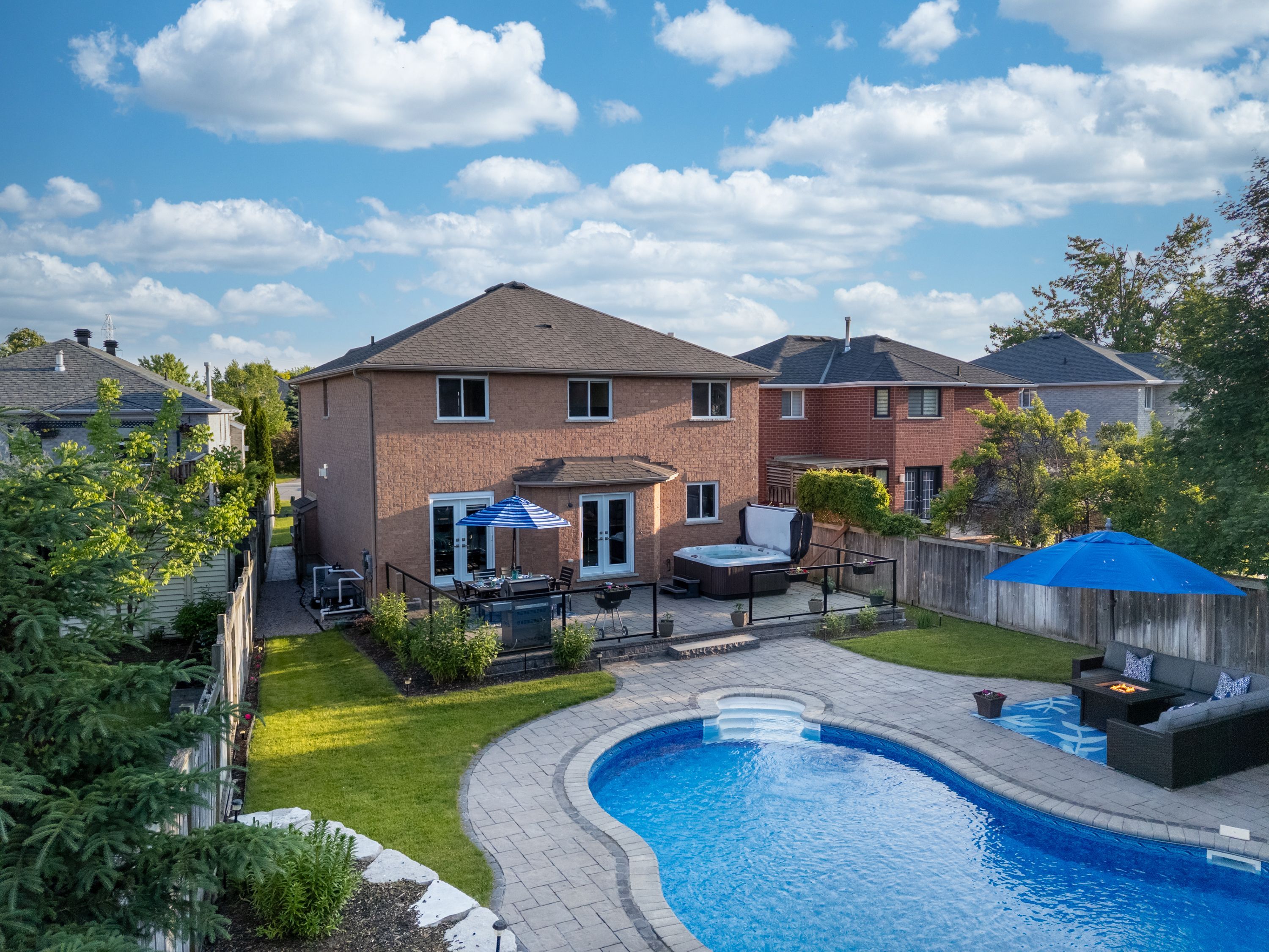 • Private backyard with a pool, jacuzzi, and landscaped seating area.