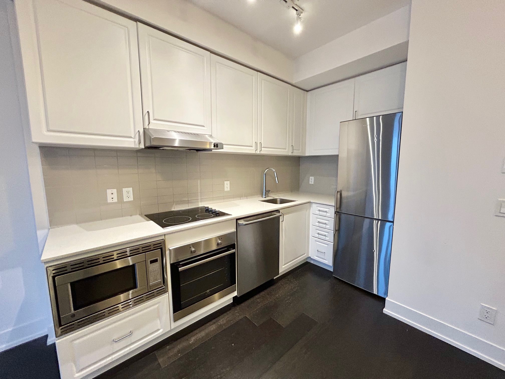 • Modern kitchen with quartz countertops and stainless steel appliances.