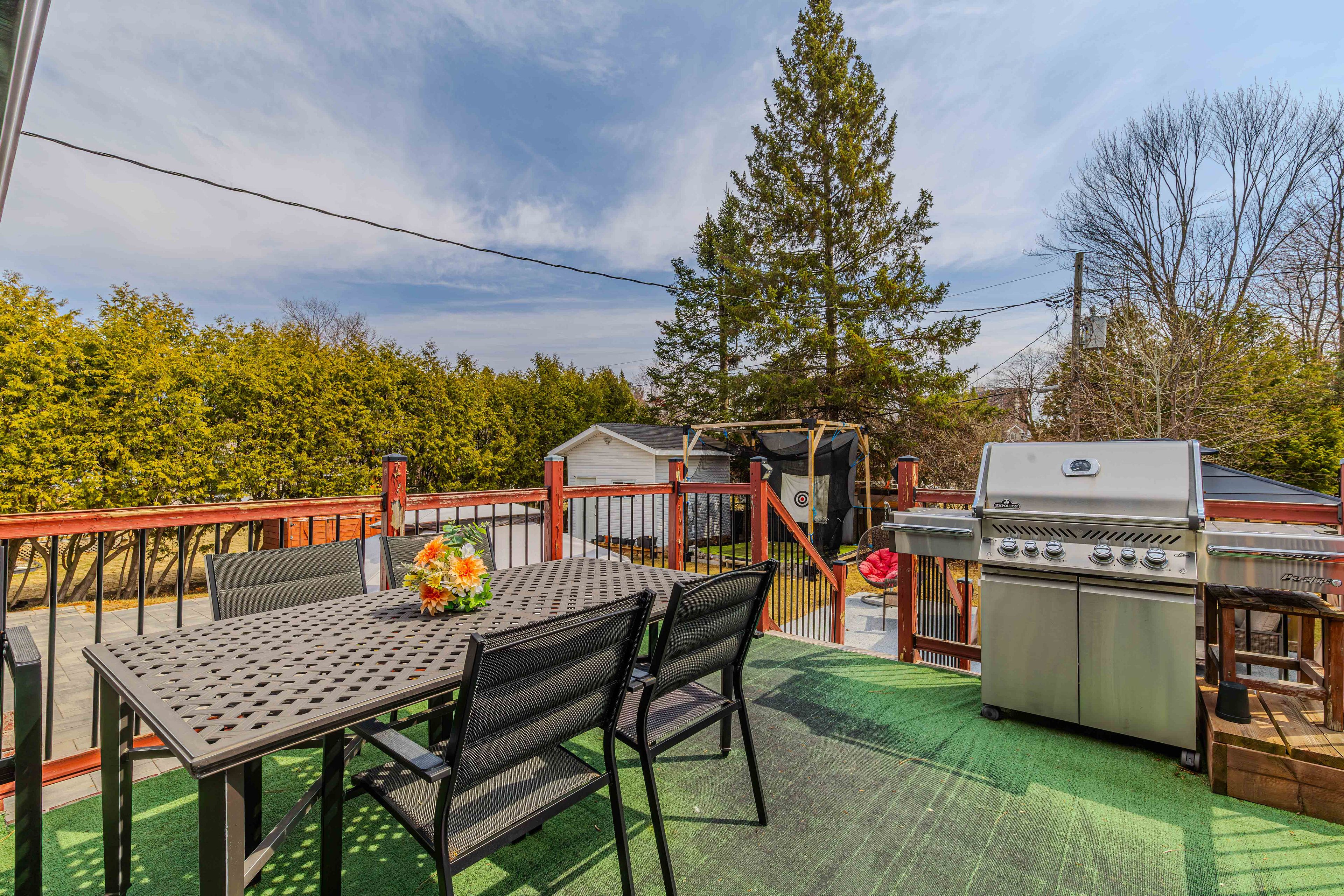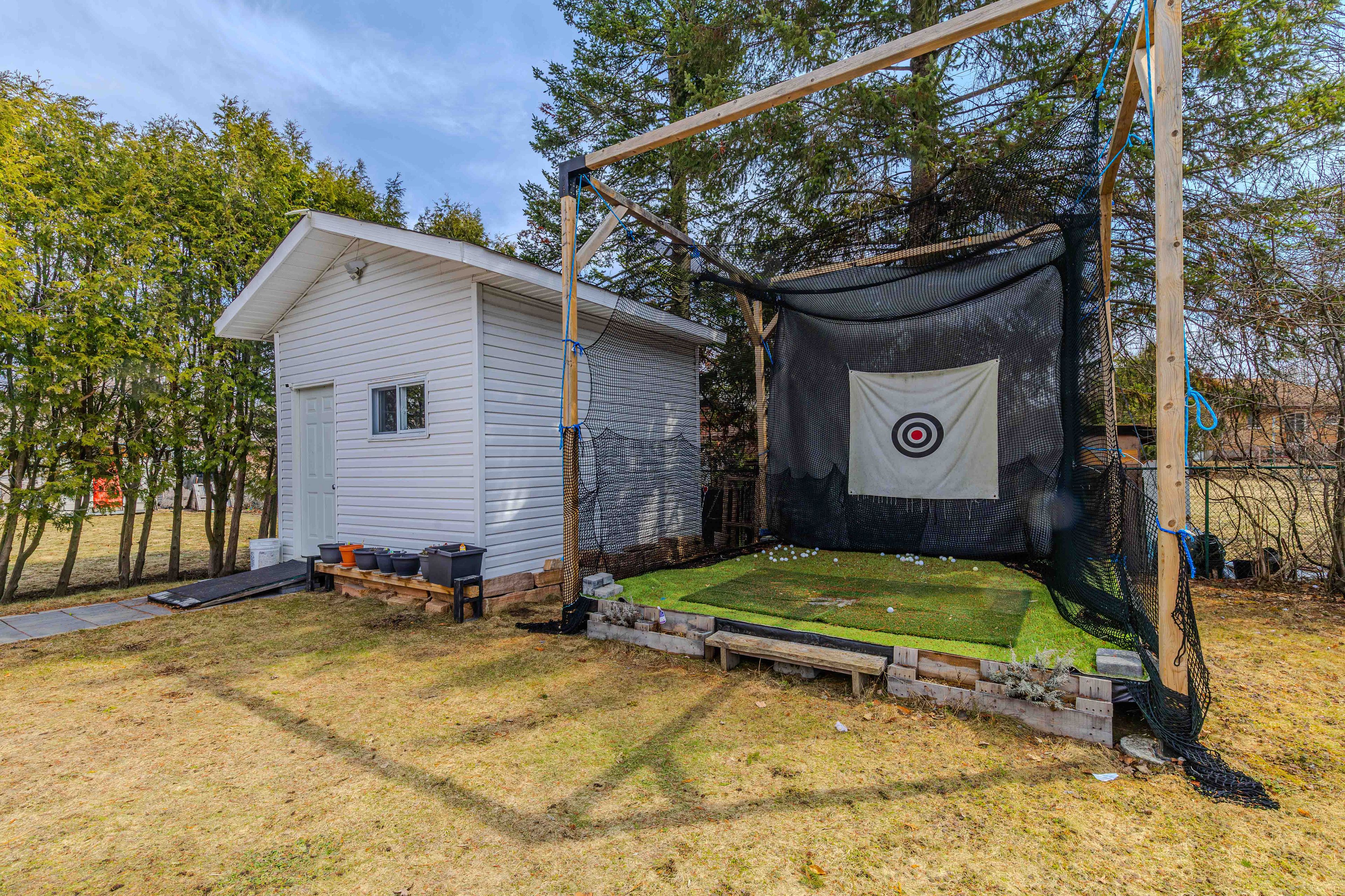 • Impressive backyard with a golf practice cage and outdoor fireplace.