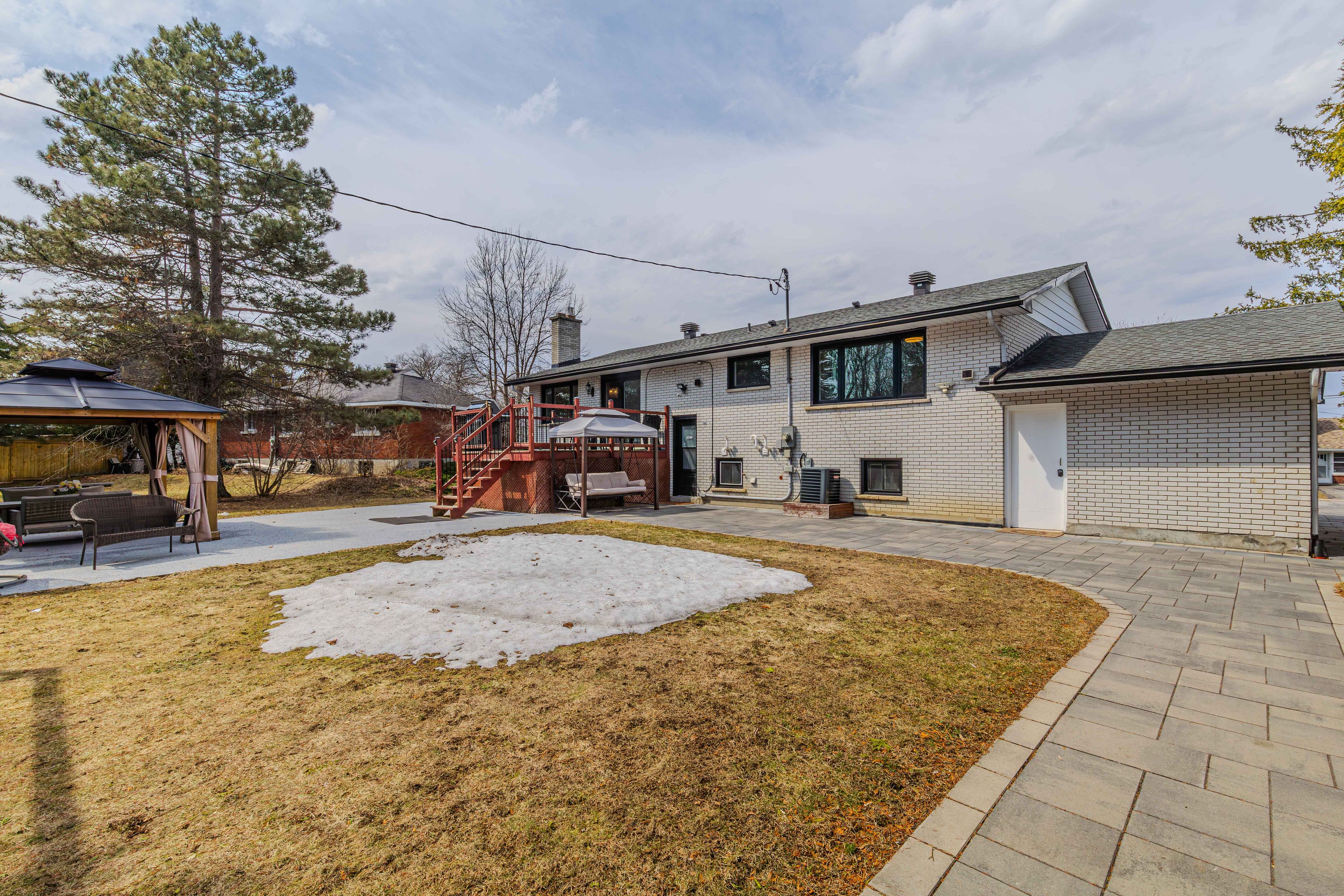 Fully renovated high ranch with in-law suite, offering a separate entrance and a versatile 6-bedroom, 4-bathroom layout, ideal for multi-generational living or income generation. The main level features an open-concept design with large windows that fill the space with natural light, along with 3 bedrooms and 2 full bathrooms. The lower level offers a fully self-contained 3-bedroom, 2-bathroom suite with its own kitchen and living space. Both levels have been updated with consistent finishes, including solid wood j&k kitchens, granite countertops, quality stainless steel appliances, and a mix of hardwood, laminate, and ceramic flooring. Separate laundry on each level enhances functionality and rental appeal. Set on an impressive 75 x 125 ft lot, the backyard is a true highlight-featuring a private golf practice cage, a spacious epoxy-finished gazebo, and a wood-burning outdoor fireplace, creating the perfect space to relax or entertain throughout the summer. Extensive interlock and a large covered patio complete this exceptional outdoor setup. Key updates: windows, doors, roof, furnace, a/c, and tankless hot water system (2018). Esa certification, interlock driveway & backyard, gas fireplace, shed (2019). Epoxy flooring in garage & gazebo/patio area (2022). Freshly painted throughout (2026). Located in a highly convenient area with excellent walkability to merivale amenities, transit, and major routes. Within the catchment for merivale high school, offering the ib program, making it an excellent choice for families prioritizing education. Previously lower level operated as an airbnb with a short-term rental permit (2022-2024), demonstrating proven income potential. Ideal for investors or end-users seeking flexibility and mortgage support.