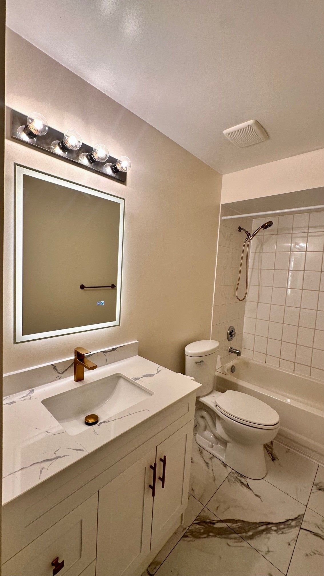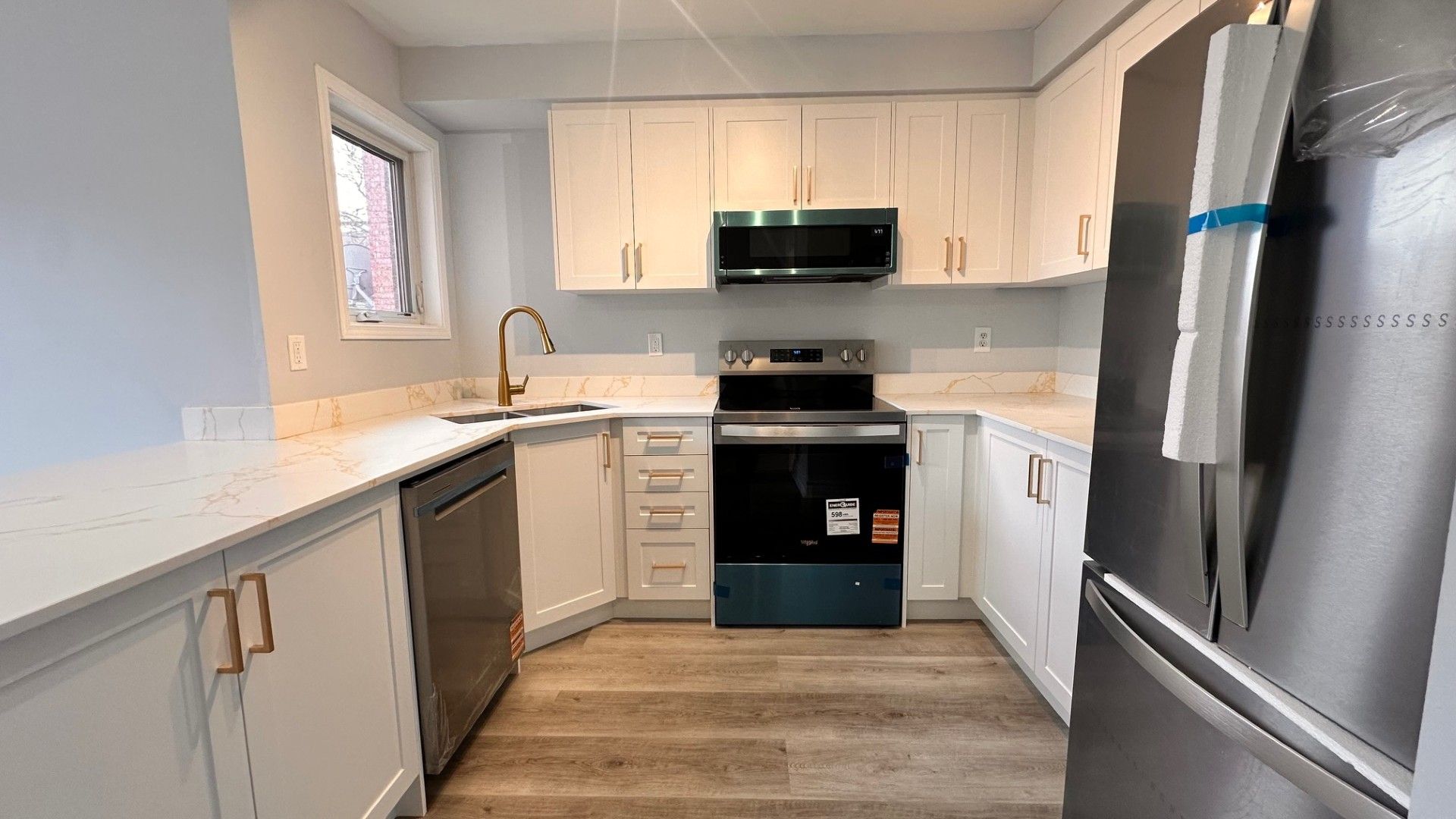 • Modern white kitchen featuring quartz countertops and new stainless steel appliances.