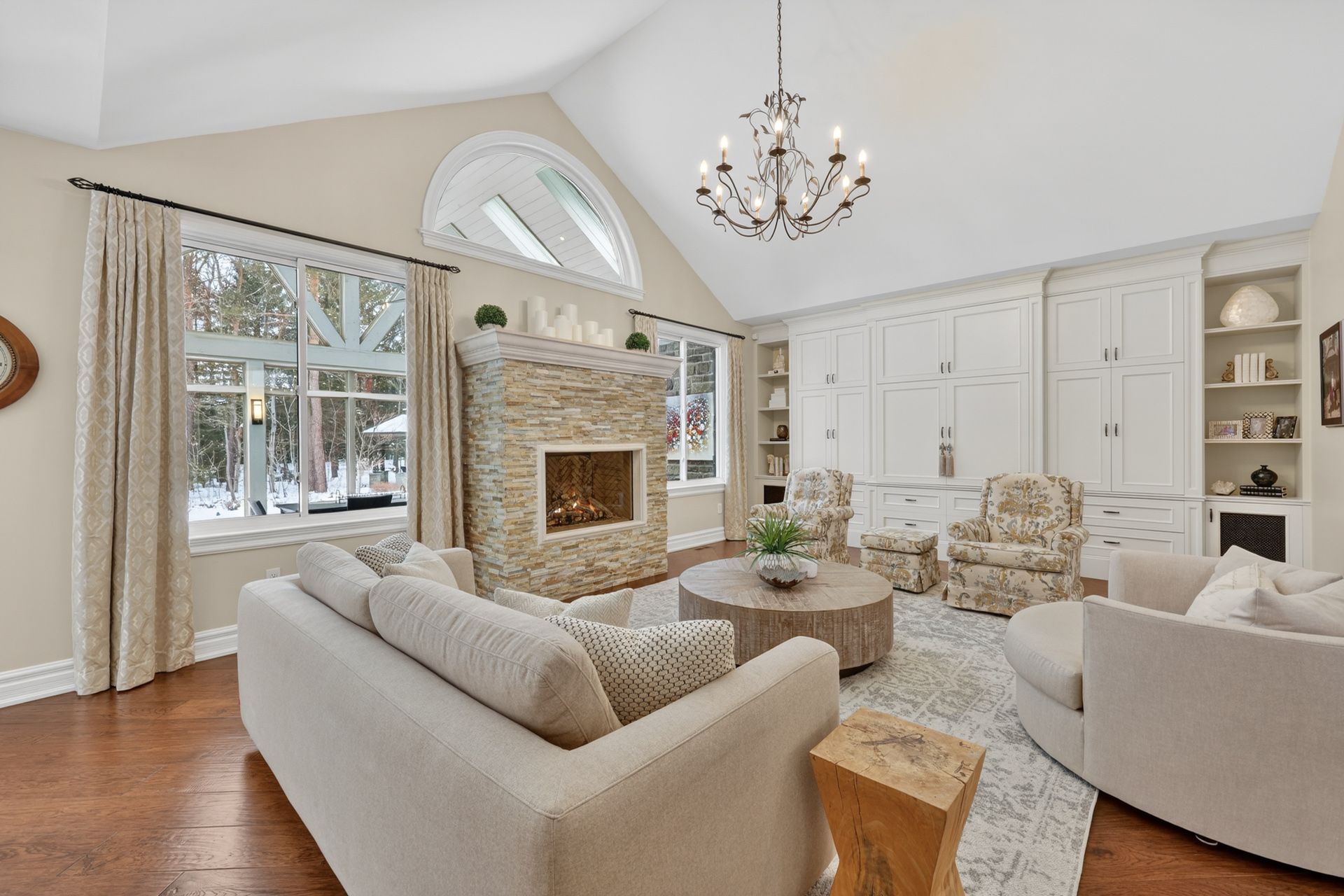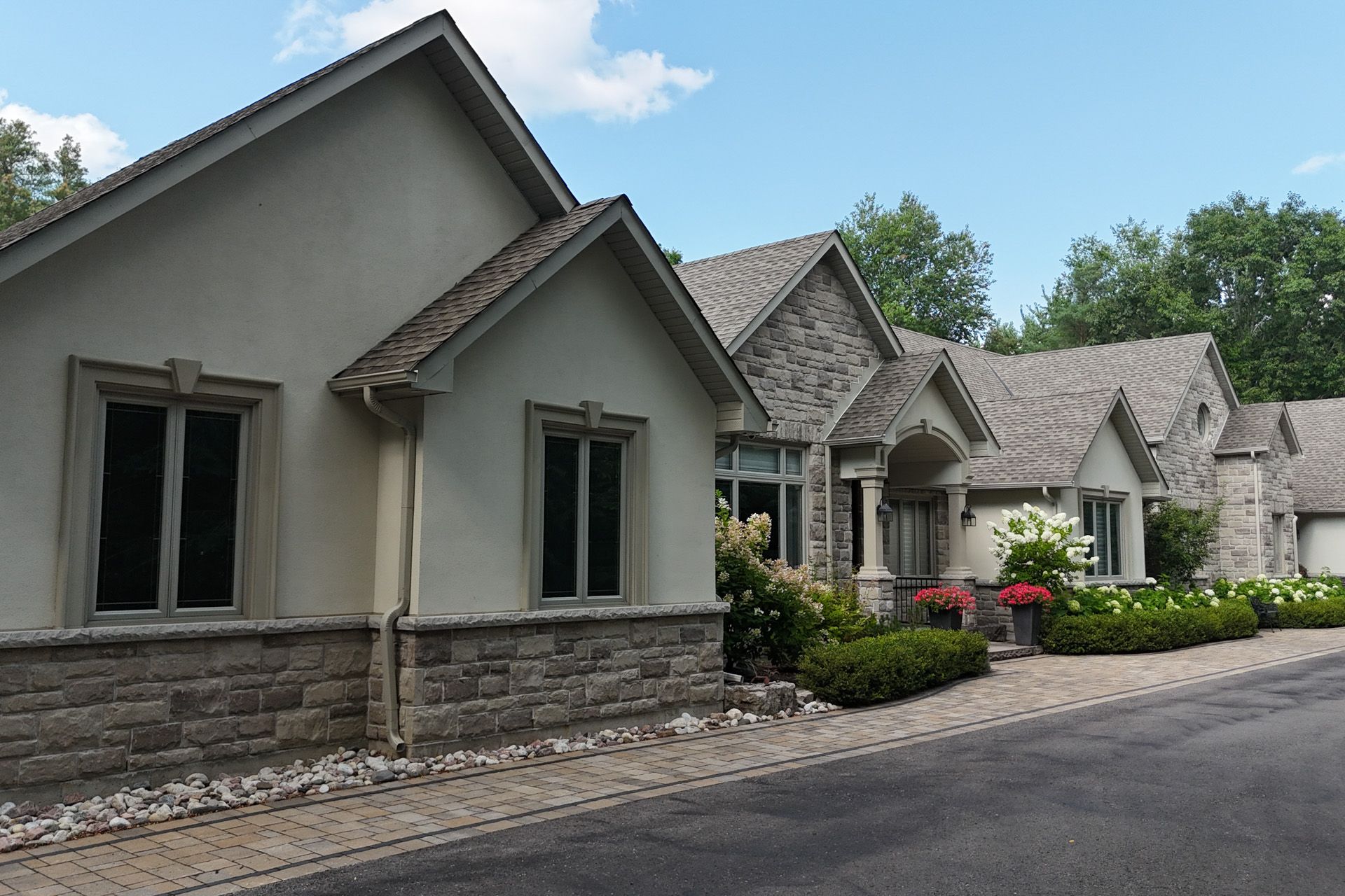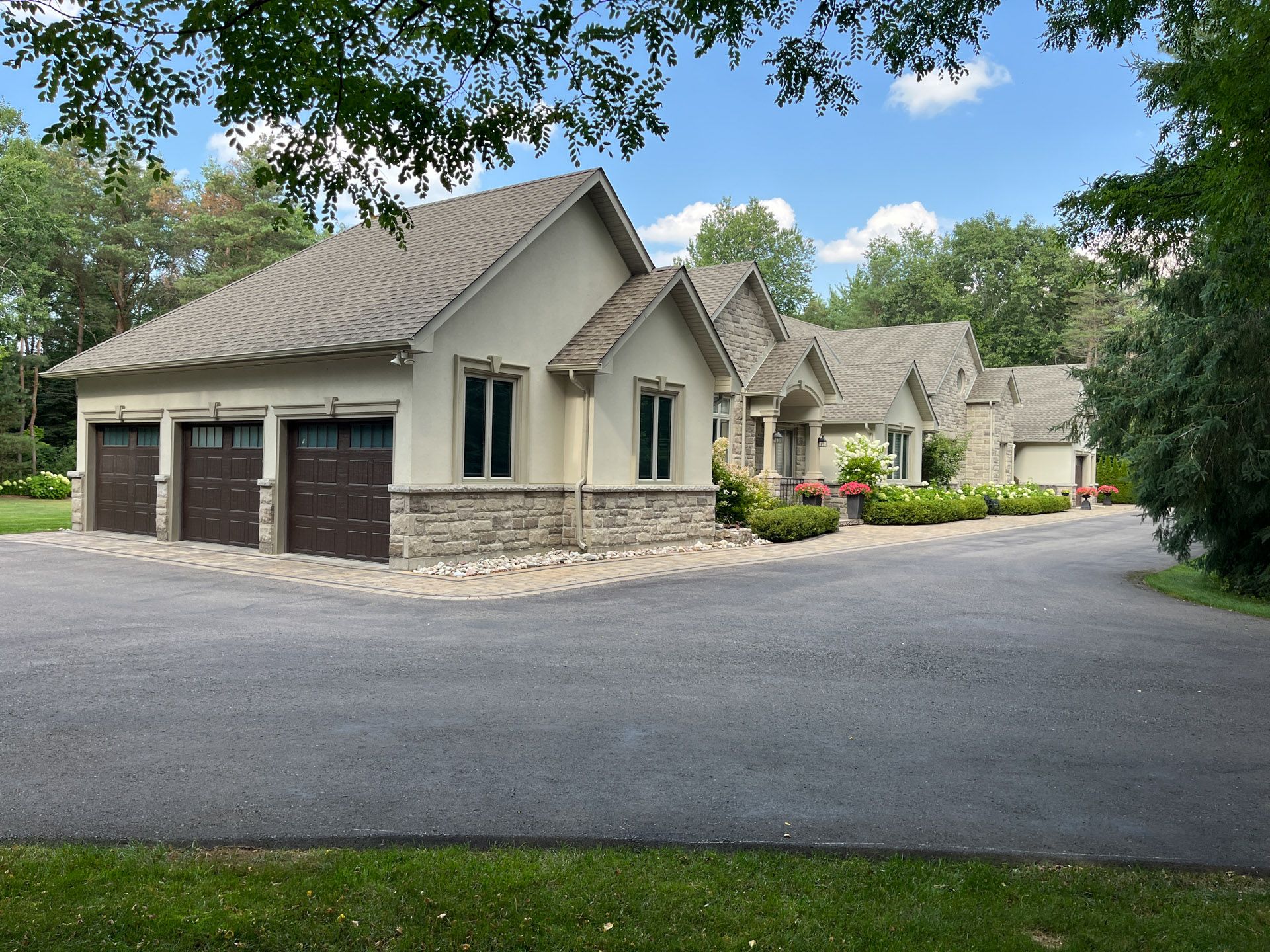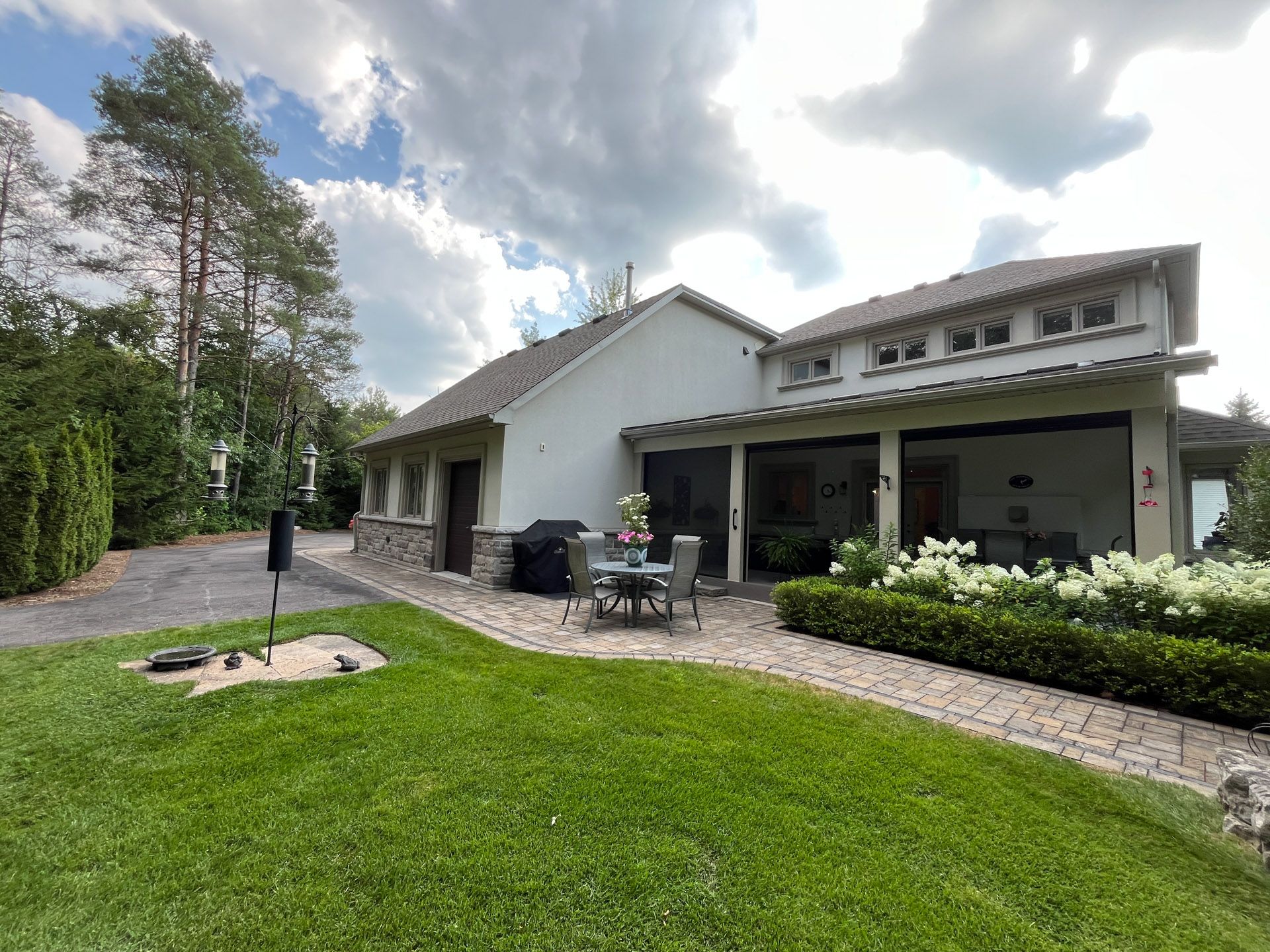 *two homes under one roof - bungaloft & bungalow - on 2 acres* this spectacular multi-generational 5929sf country estate offers 2 completely distinct living areas w/ absolute privacy. This elegant residence presents a 2784sf east wing bungaloft with 3+1 bdrms and a west wing 1744sf, bungalow with 2+1 bdrms all under one roof! It's masterfully designed for two families. Both exquisite residences offer private heated garages (3+2), 2 oversized sunrooms, separate front entrances, private yards and finished basements. This manor is nestled onto two luscious private acres within mins to hwy 404, all amenities and exceptional scenic trails. The west wing features a great room with a soaring 14-ft cathedral ceiling, a stone fireplace and a 11' formal dining room. The gourmet kitchen boasts a breakfast area, quartz countertops and a centre island. The private upper-level primary loft, offers a large sitting room, a massive dressing room and a spa-like 6-pc ensuite w/ a freestanding tub and glass shower. The lower level includes a games room, rec room, bdrm, 4 pc bath with sauna and play room. This wing is completed by an attached, heated 3-car garage with ev charger. The east wing provides unparalleled independence with its own open-concept kitchen featuring quartz countertops that overlooks the spacious family room w/ a fireplace and built-in shelving. Relax in the breathtaking sunroom with retractable screens and skylights. The lower level offers a theatre room w/ built-in bar, bdrm and 2-pc bath. This wing has its own private heated 2-car garage with ev charger, a unique wash bay and waterproof walls. Outside, the stone & stucco exterior offers incredible curb appeal with a massive paved driveway for ample parking. The backyard is a resort with stone patios, composite decking, and a custom wooden pavilion w/ stone fireplace. This exceptional 2 family property blends rural tranquility with luxury and privacy. A rare and unparalleled find! (see attached floor plans)