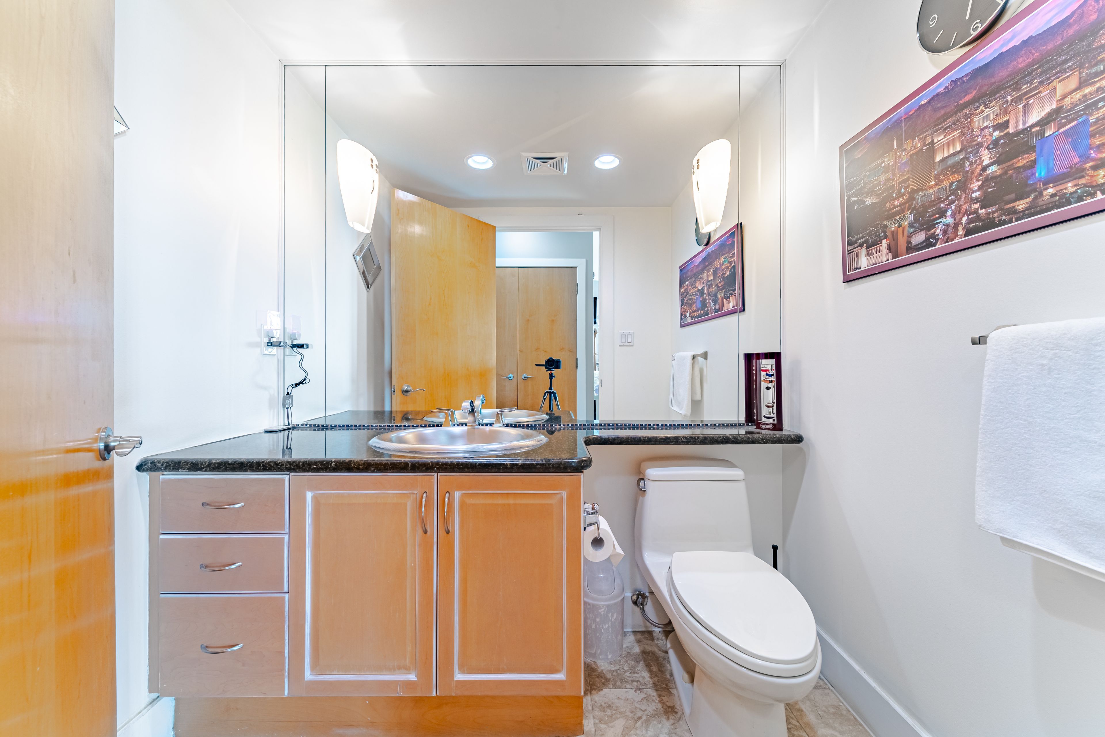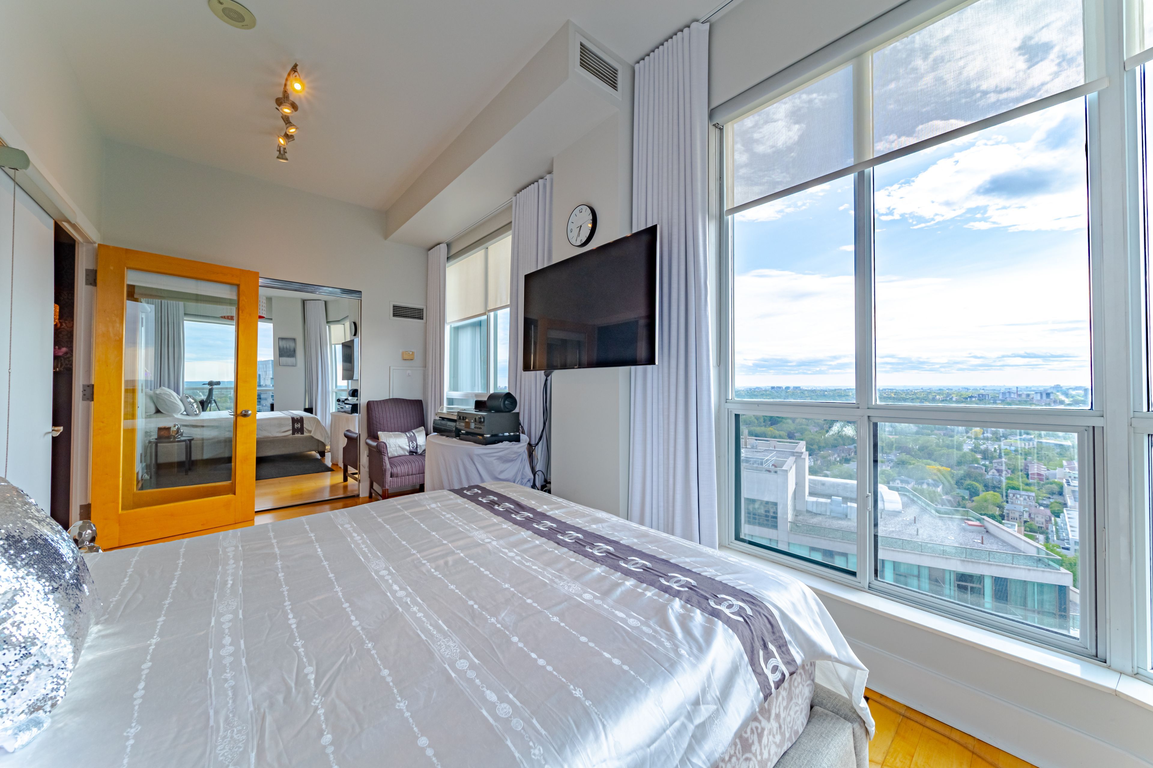 • Bright open-concept layout with large windows showcasing city views.