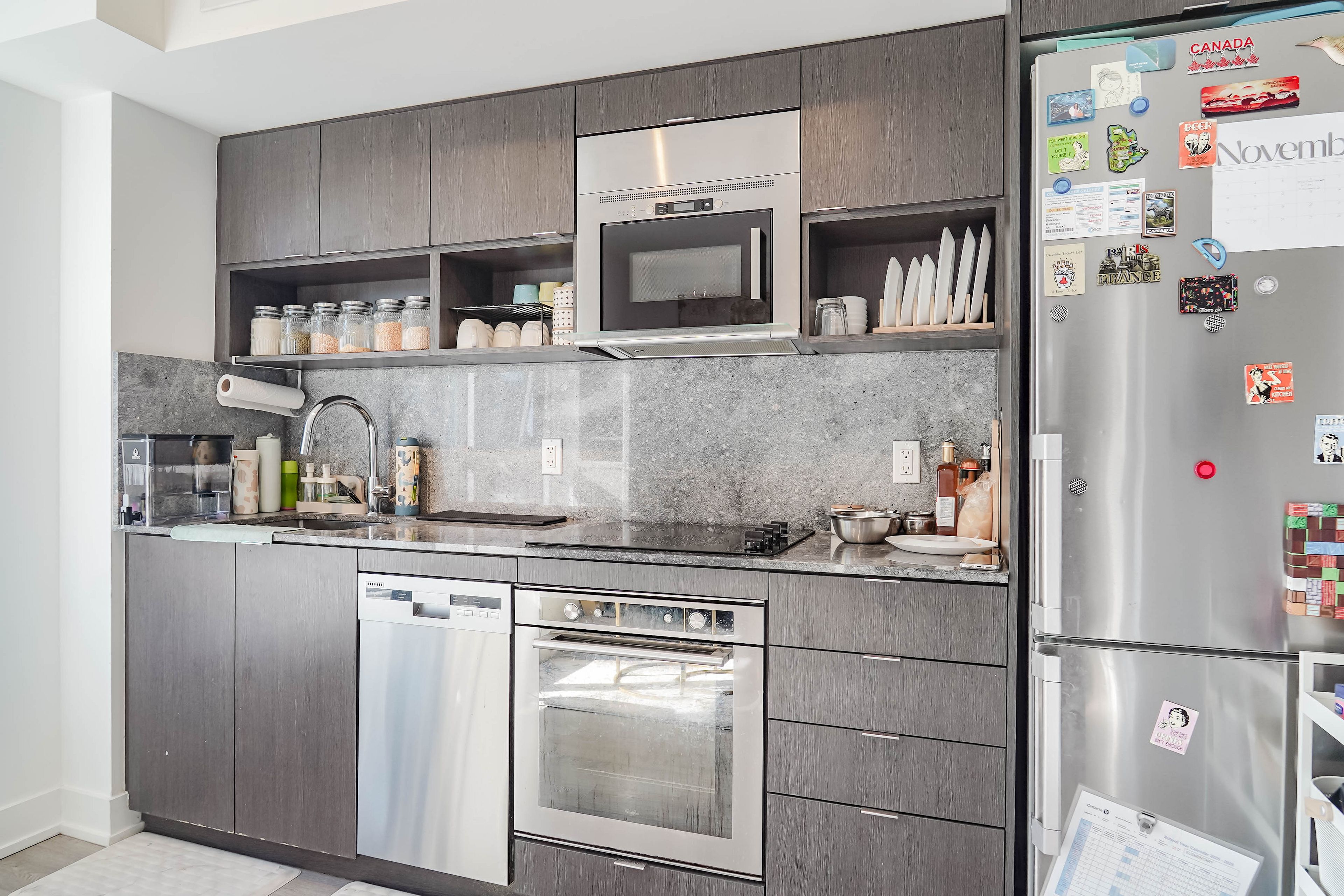 • Contemporary kitchen with stainless steel appliances and sleek cabinetry.