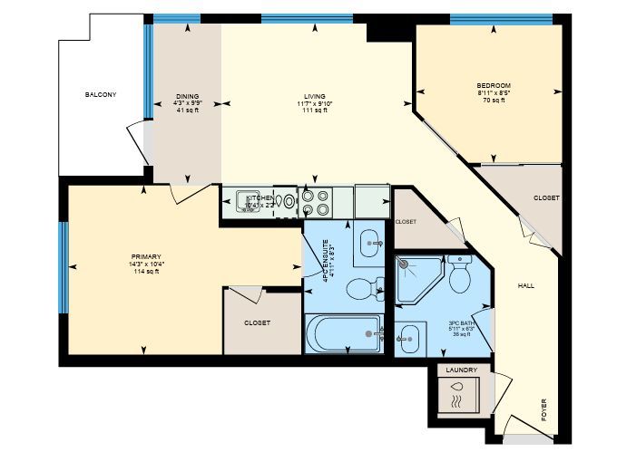 • Bright corner suite with 692 sq. ft. and modern layout.