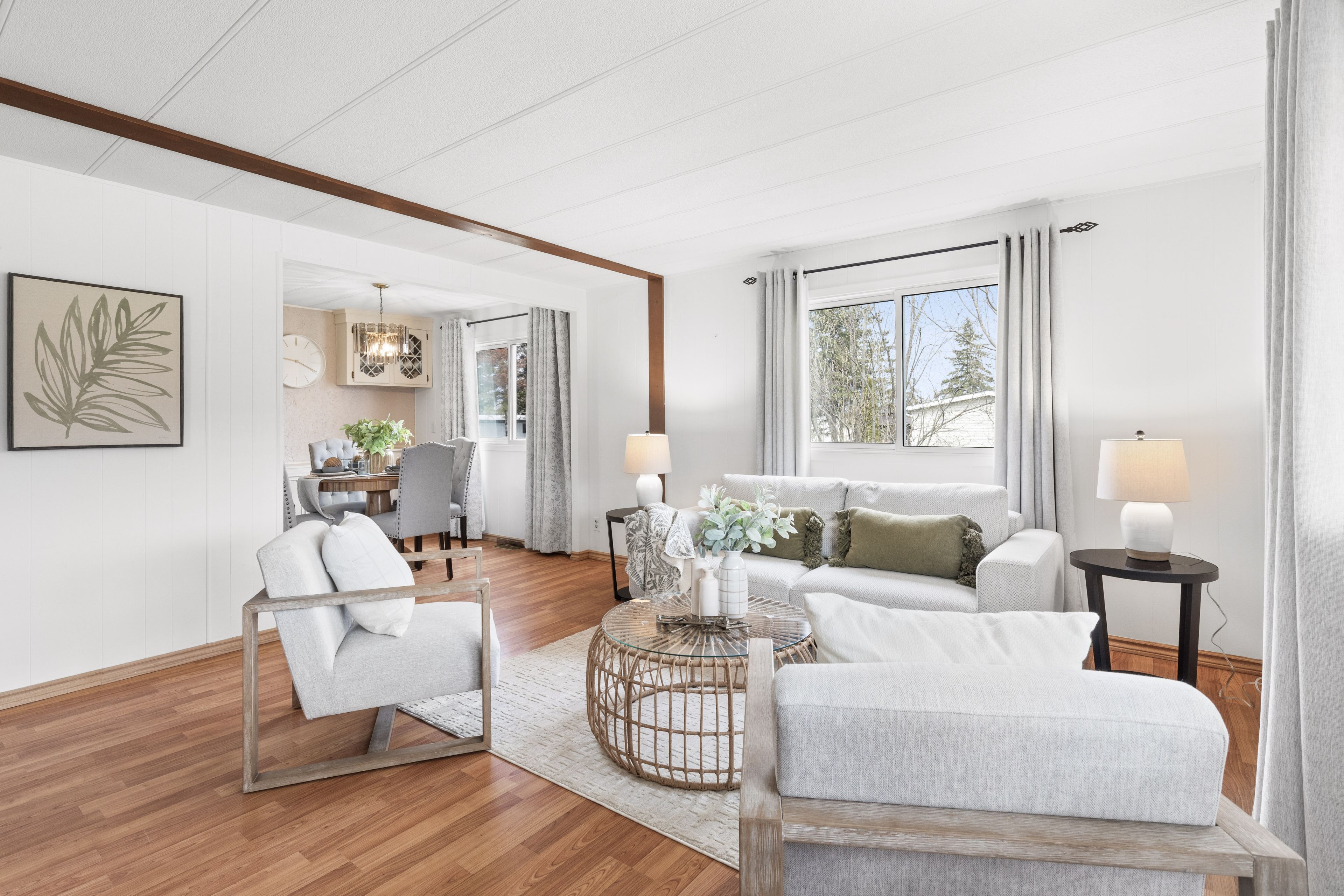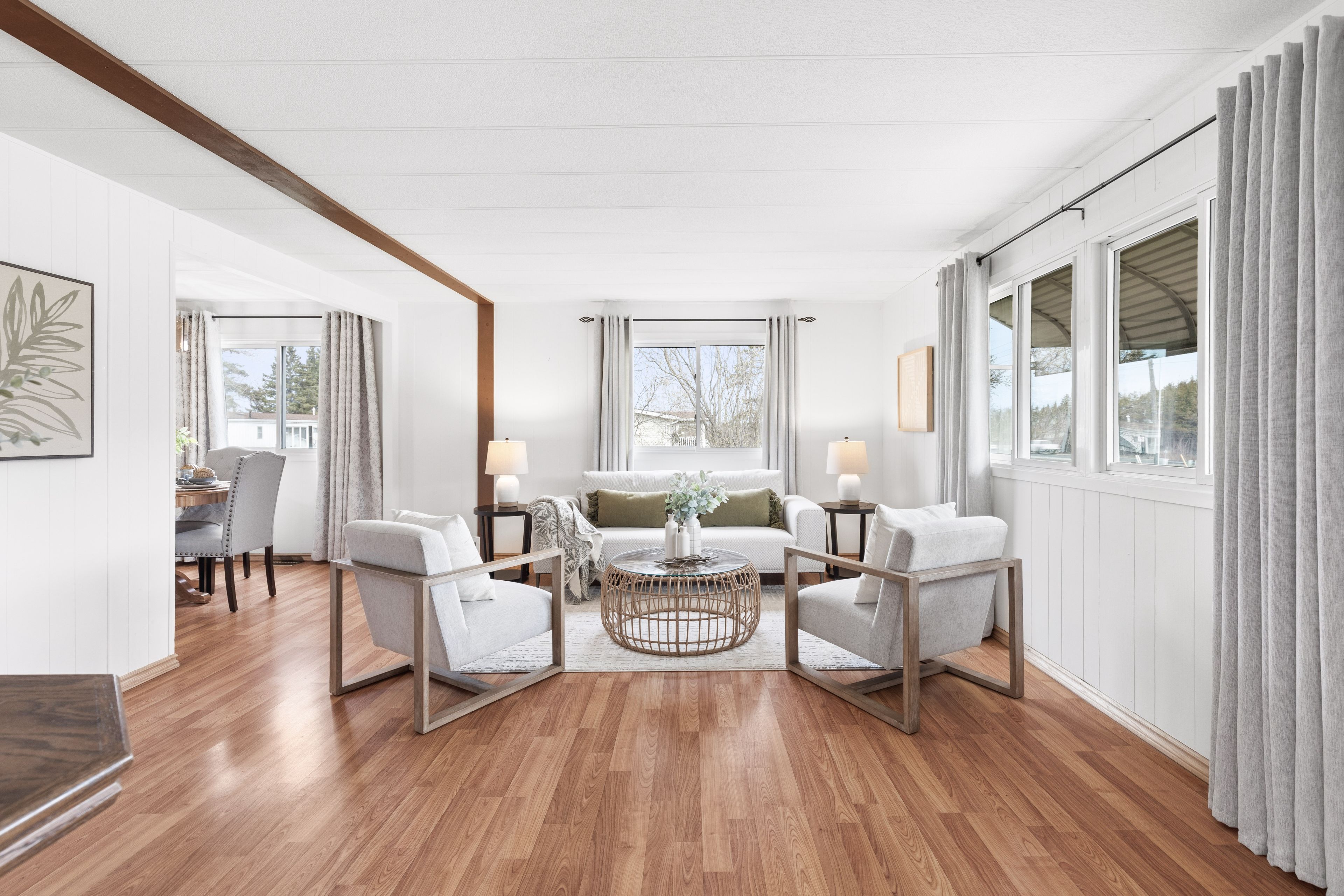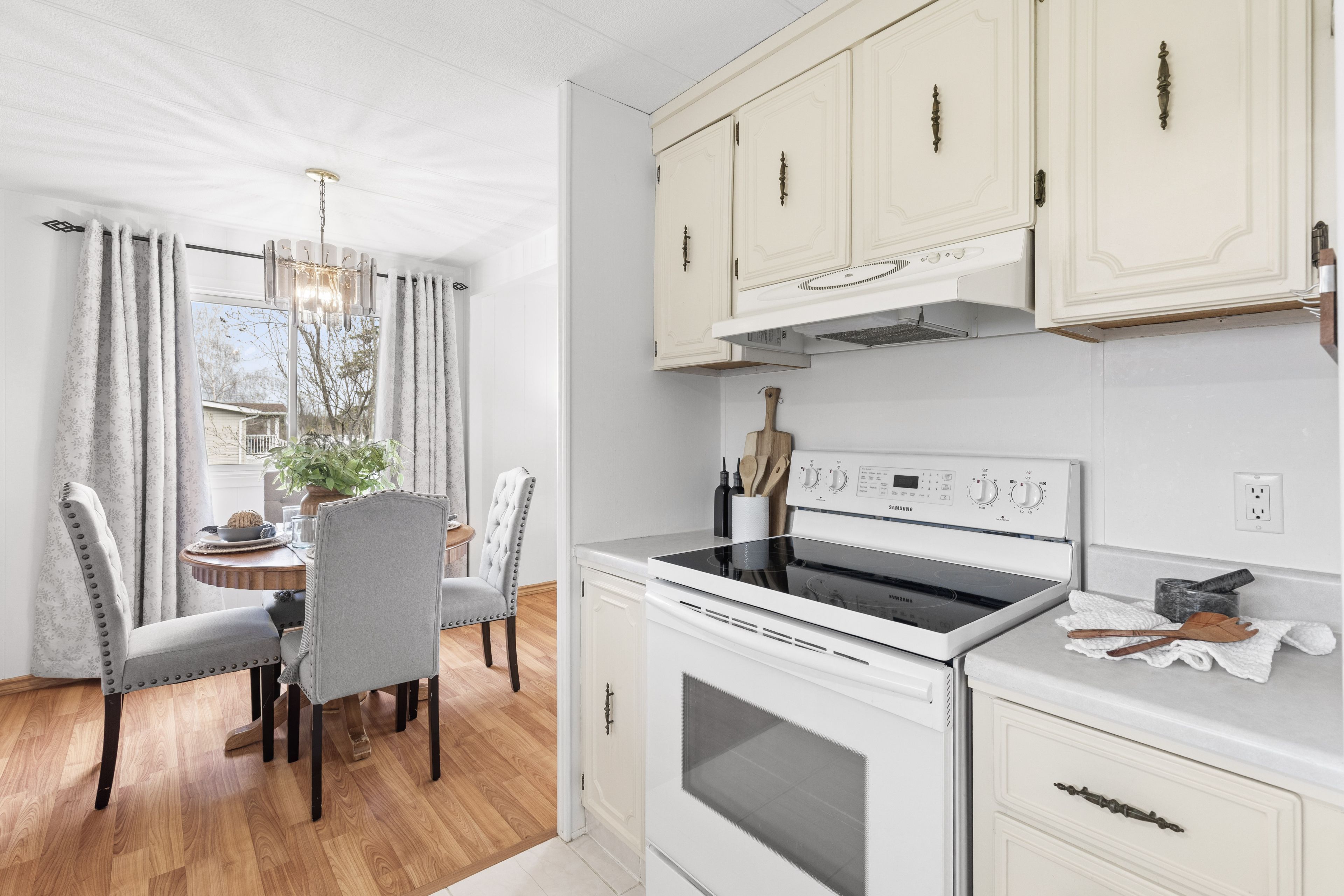 • Open-concept layout with a bright kitchen flowing to dining and living areas.