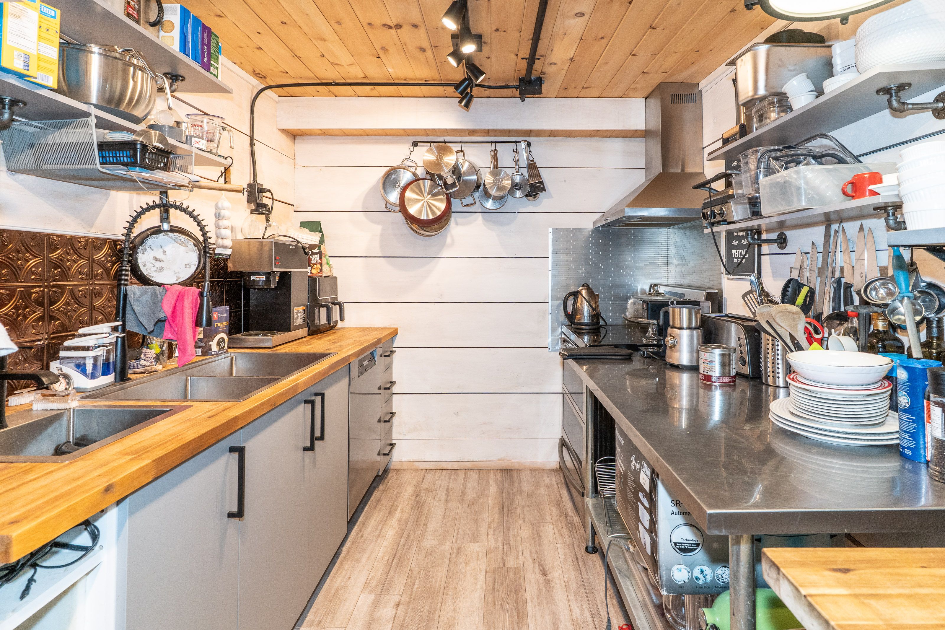 • Equipped kitchen ready to serve food for patrons.