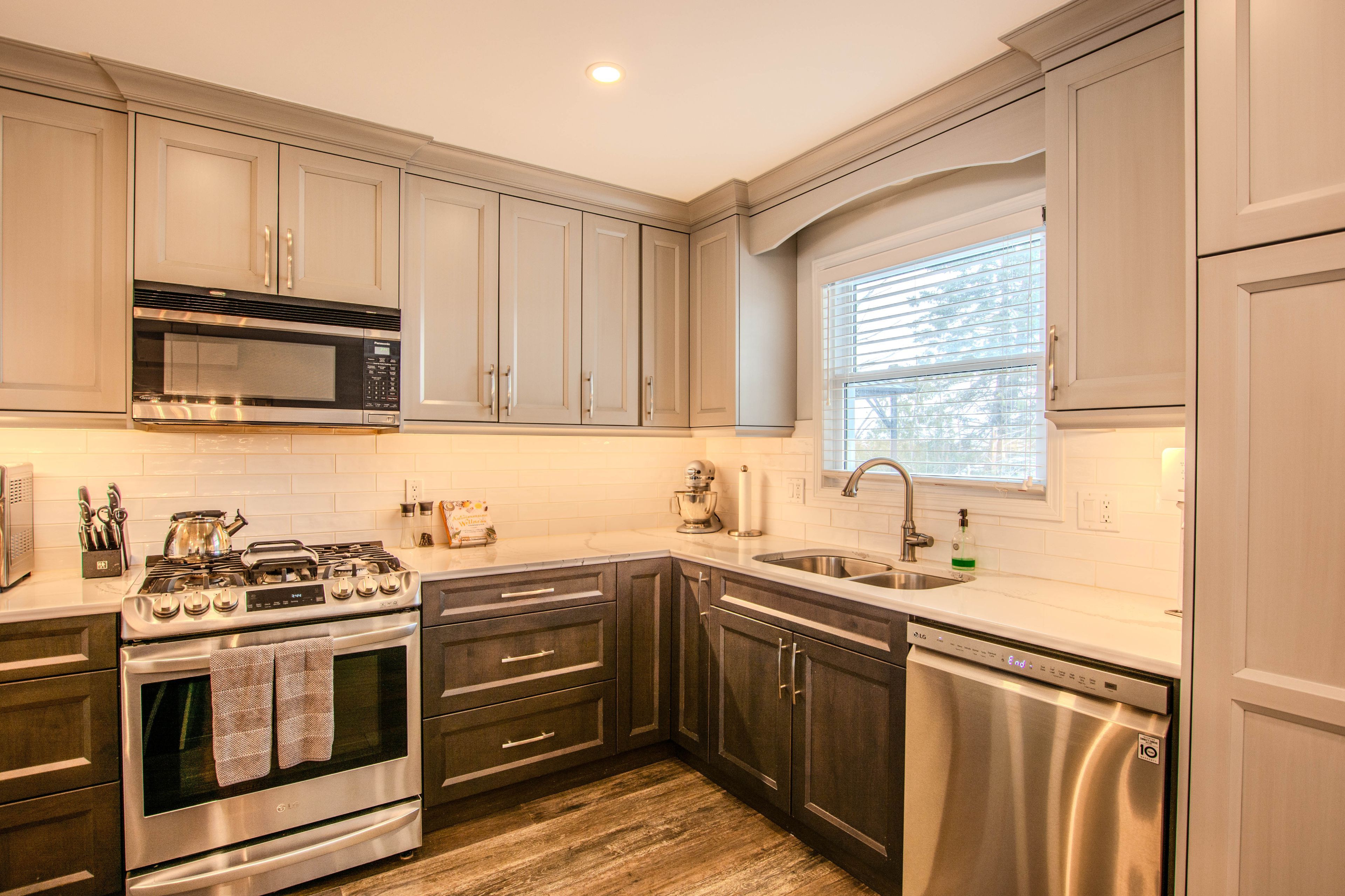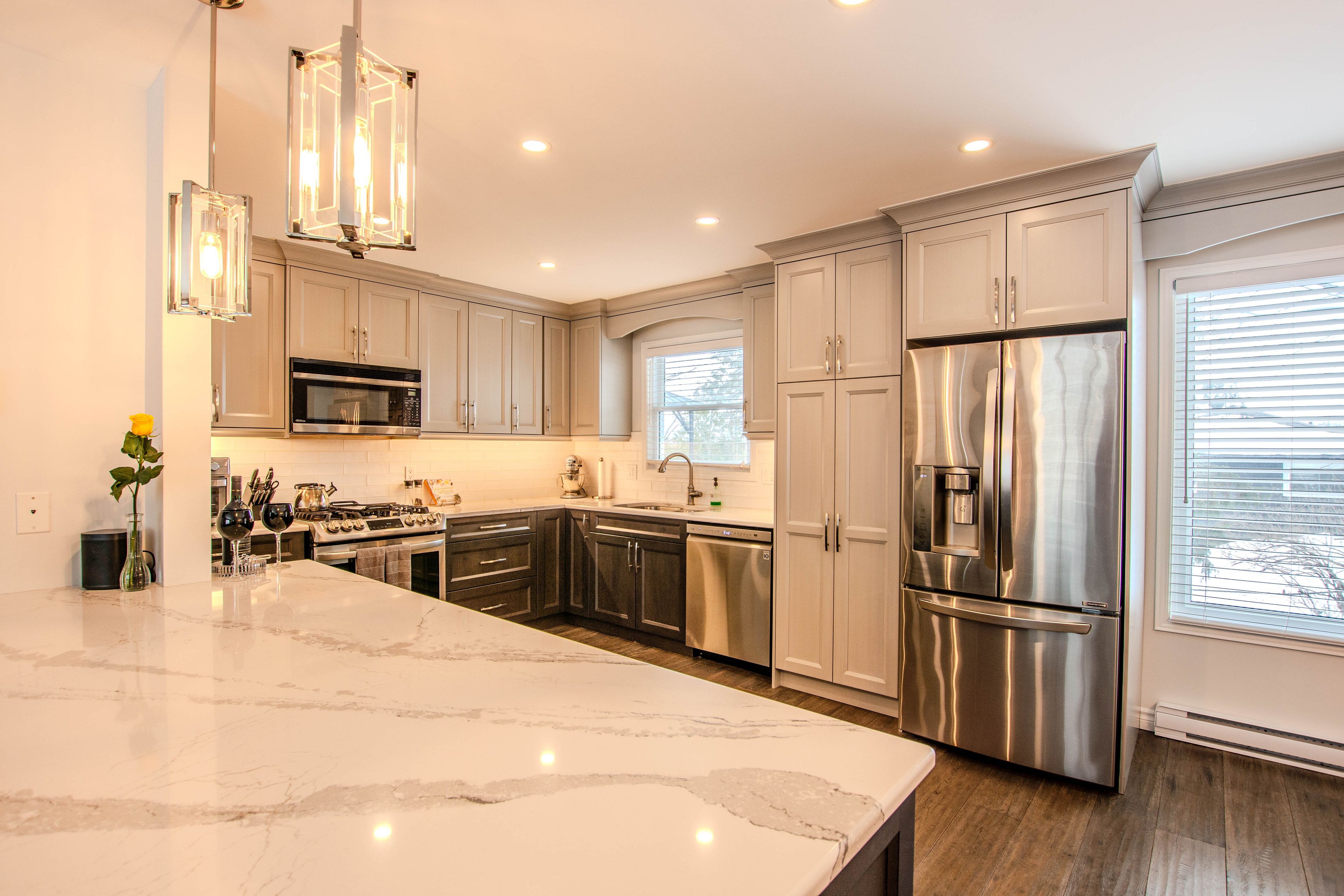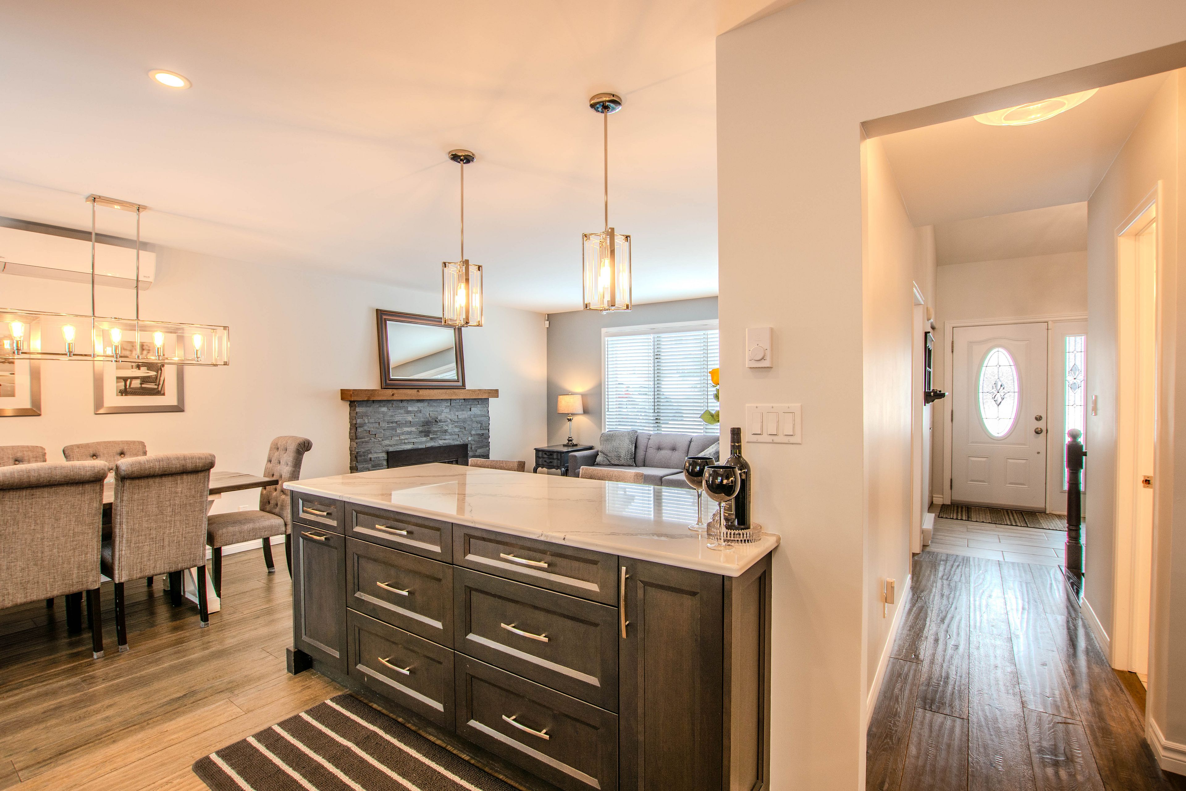 • Open-concept main floor with custom kitchen and quartz countertops.