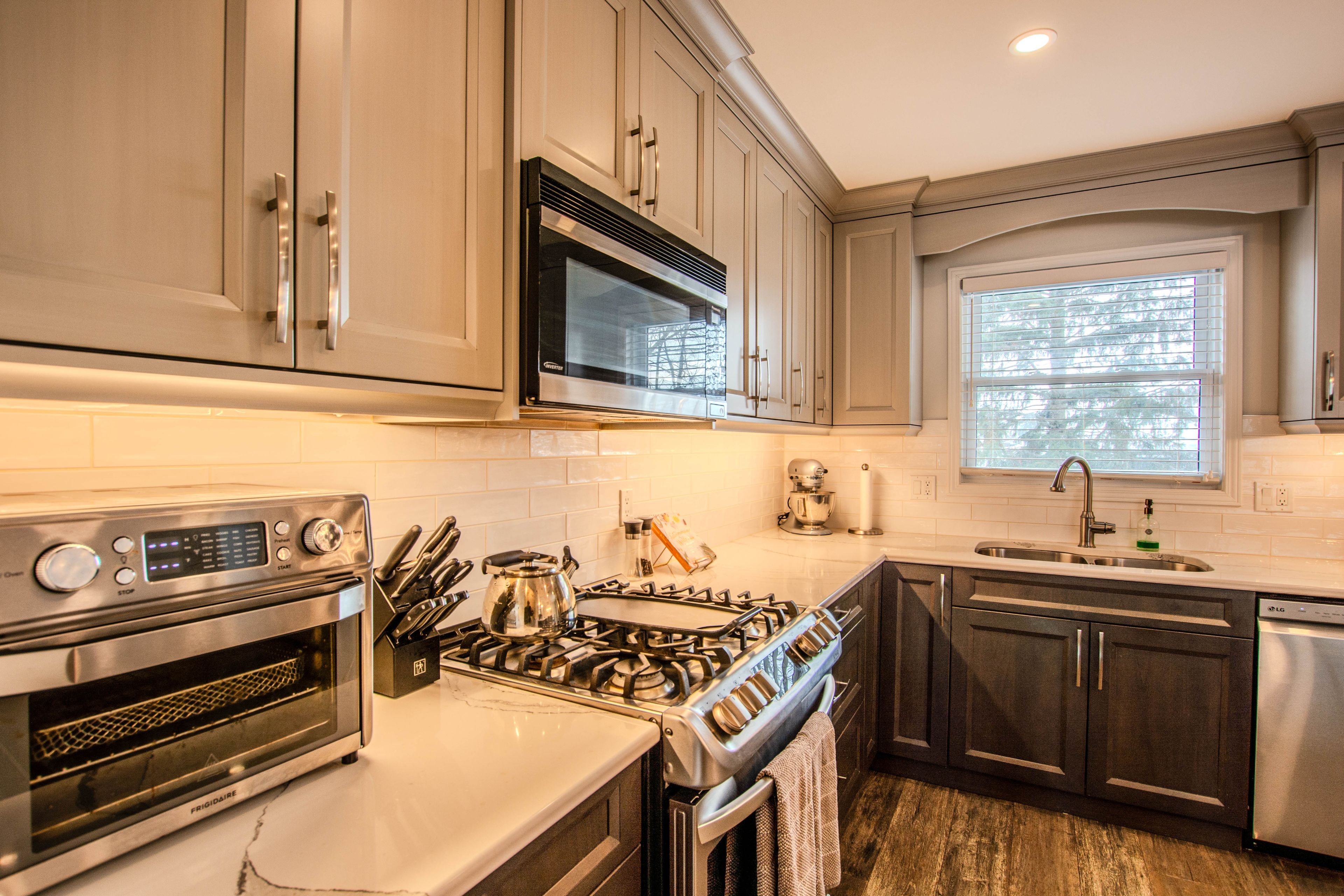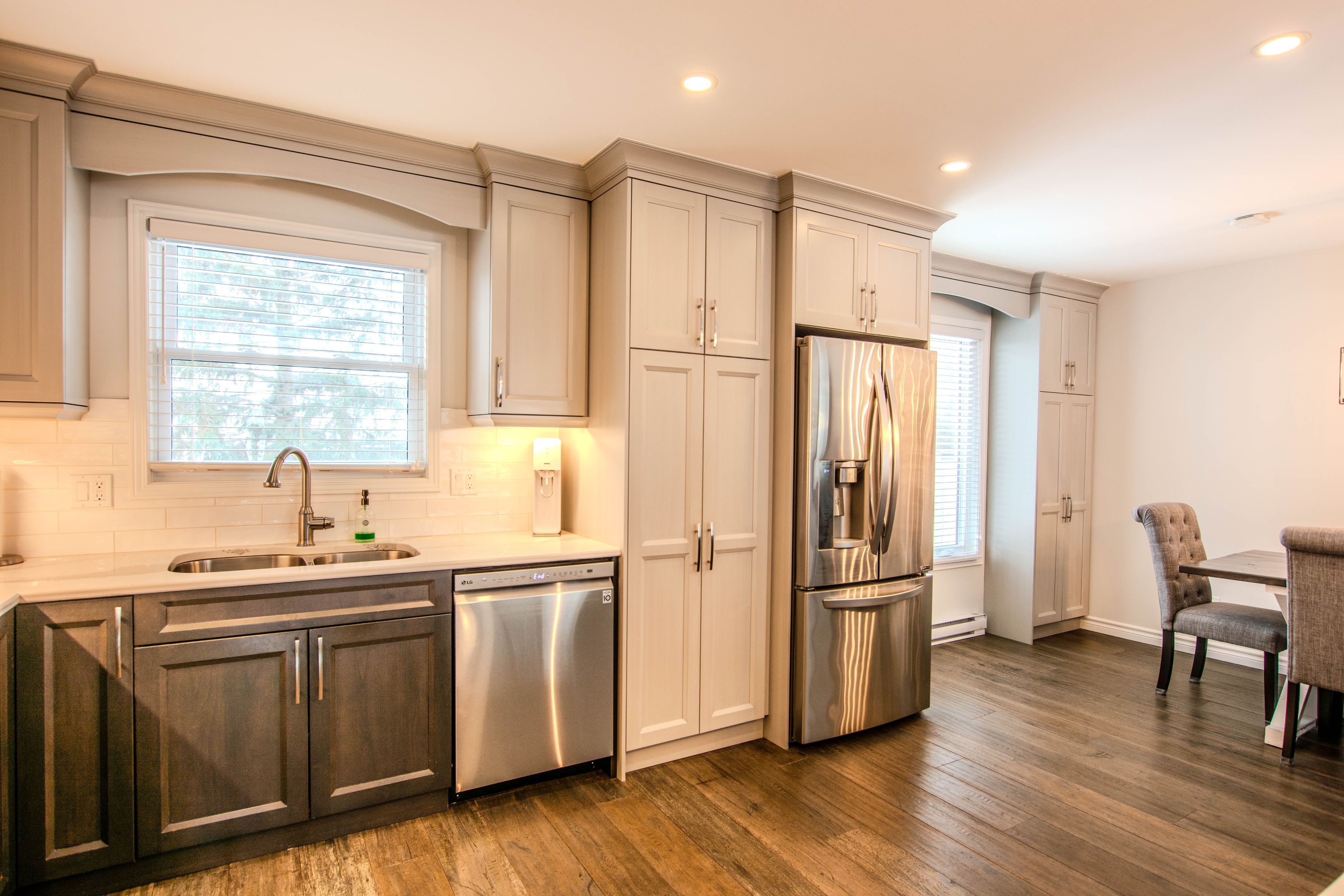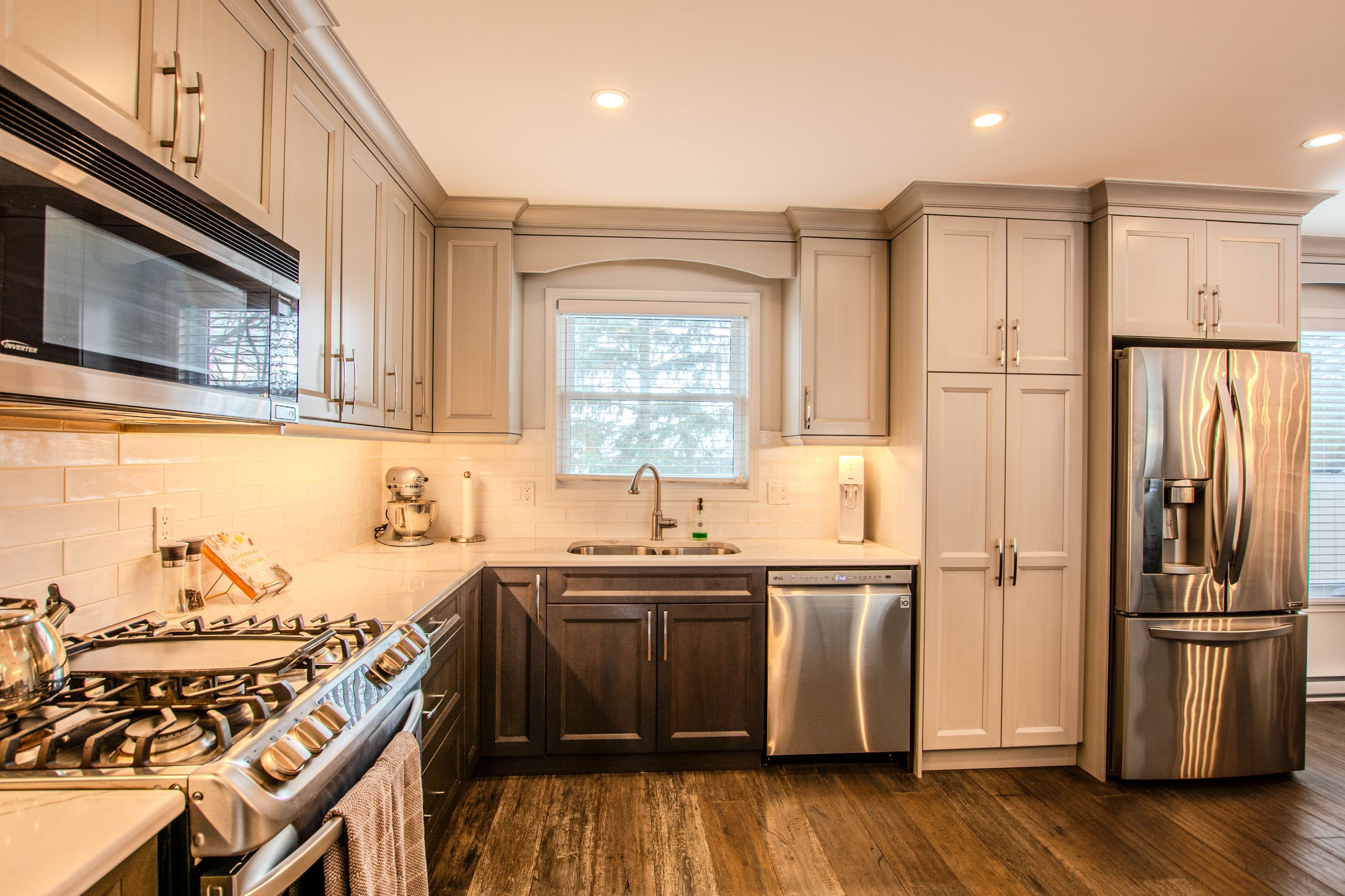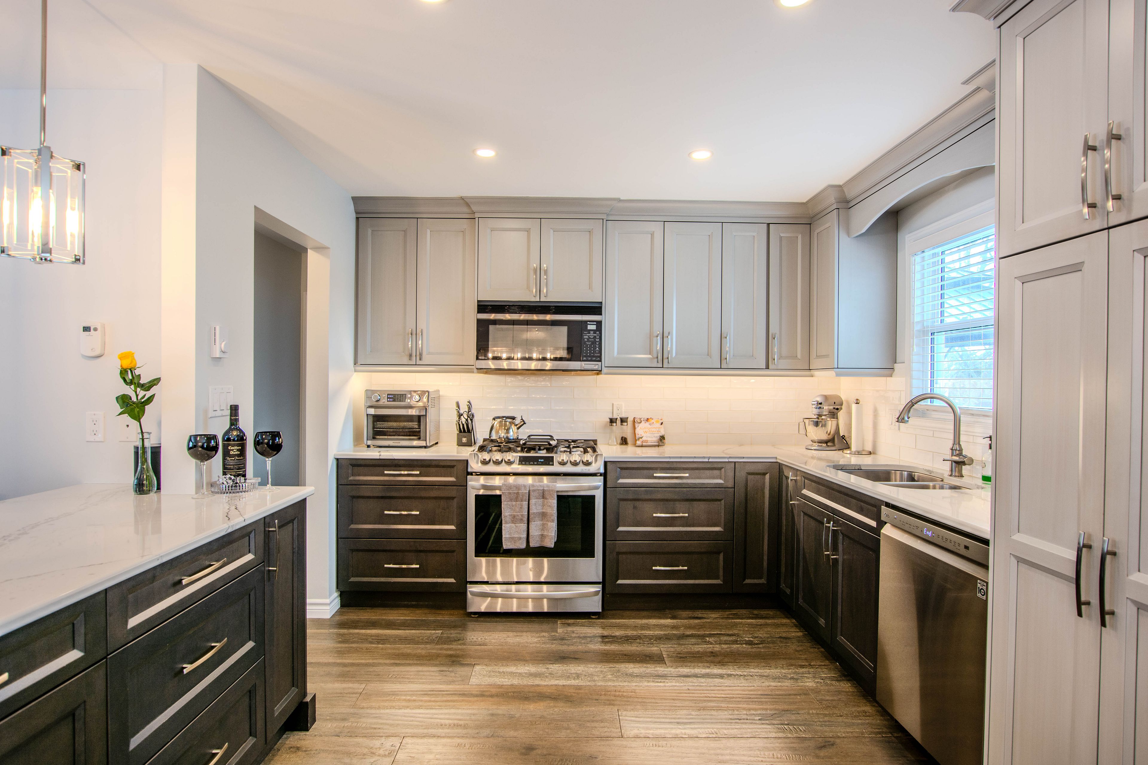 • Open-concept main floor with custom kitchen and quartz countertops.