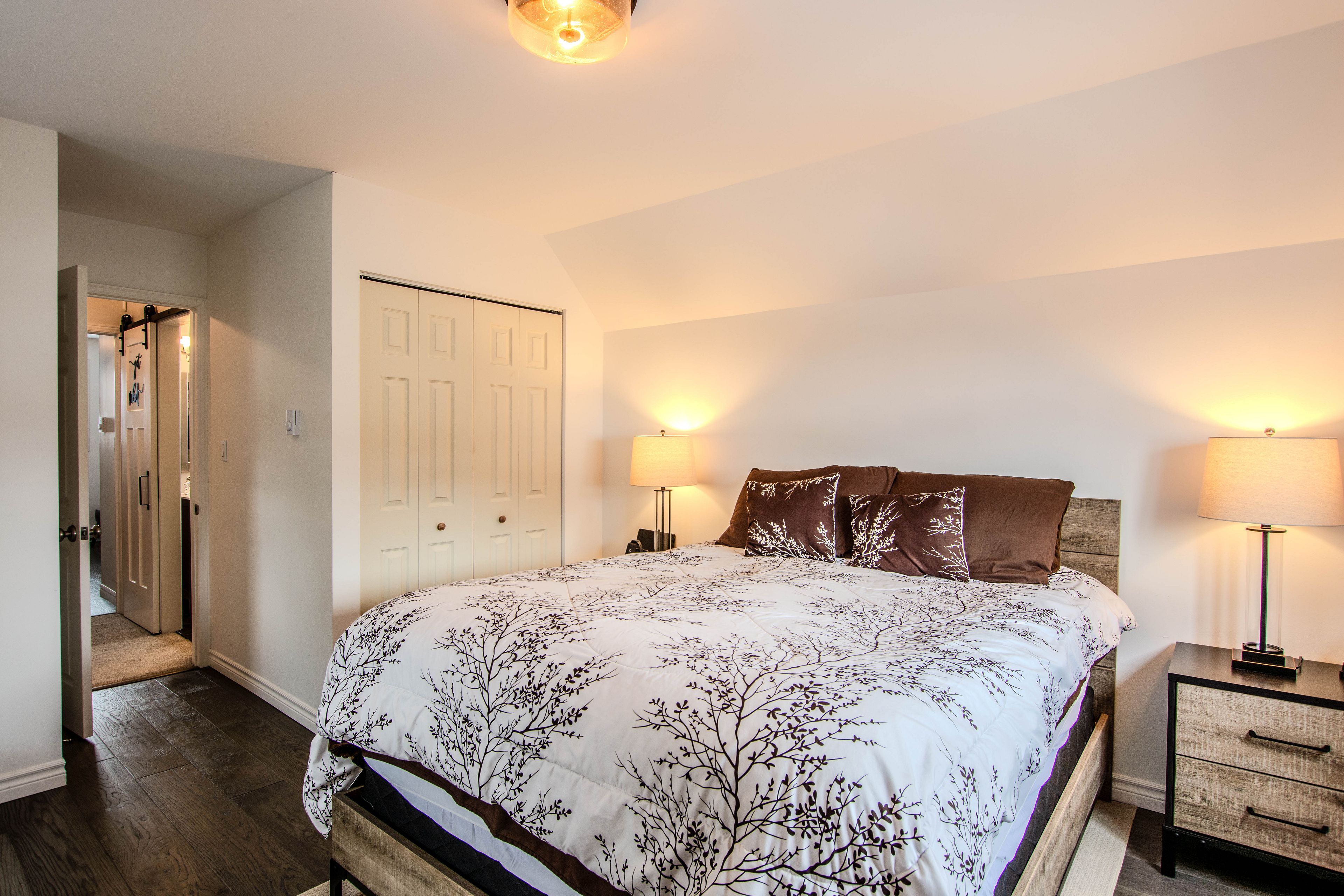 Welcome to this inviting family home in the sought-after north ward, ideally situated on a quiet cul-de-sac close to lightfoot trail, transit, and the lake. Fully updated, this home features an open-concept main floor with a custom kitchen complete with under-cabinet lighting, quartz countertops, and hardwood floors. Freshly painted main floor rooms create a bright, refreshed feel throughout. The cozy living room with fireplace overlooks the kitchen and dining area, making it perfect for everyday living and entertaining. A convenient main floor bedroom offers flexibility as a primary or guest suite, and each level of the home includes a full bathroom. The second floor features two spacious bedrooms and a beautifully renovated 3-piece bathroom. All upper windows have been recently replaced. The fully finished basement provides additional living space, while the beautifully landscaped yard offers a walkout deck with a 5-year-old 4-6 person hot tub-perfect for relaxing or entertaining. Truly move-in ready.