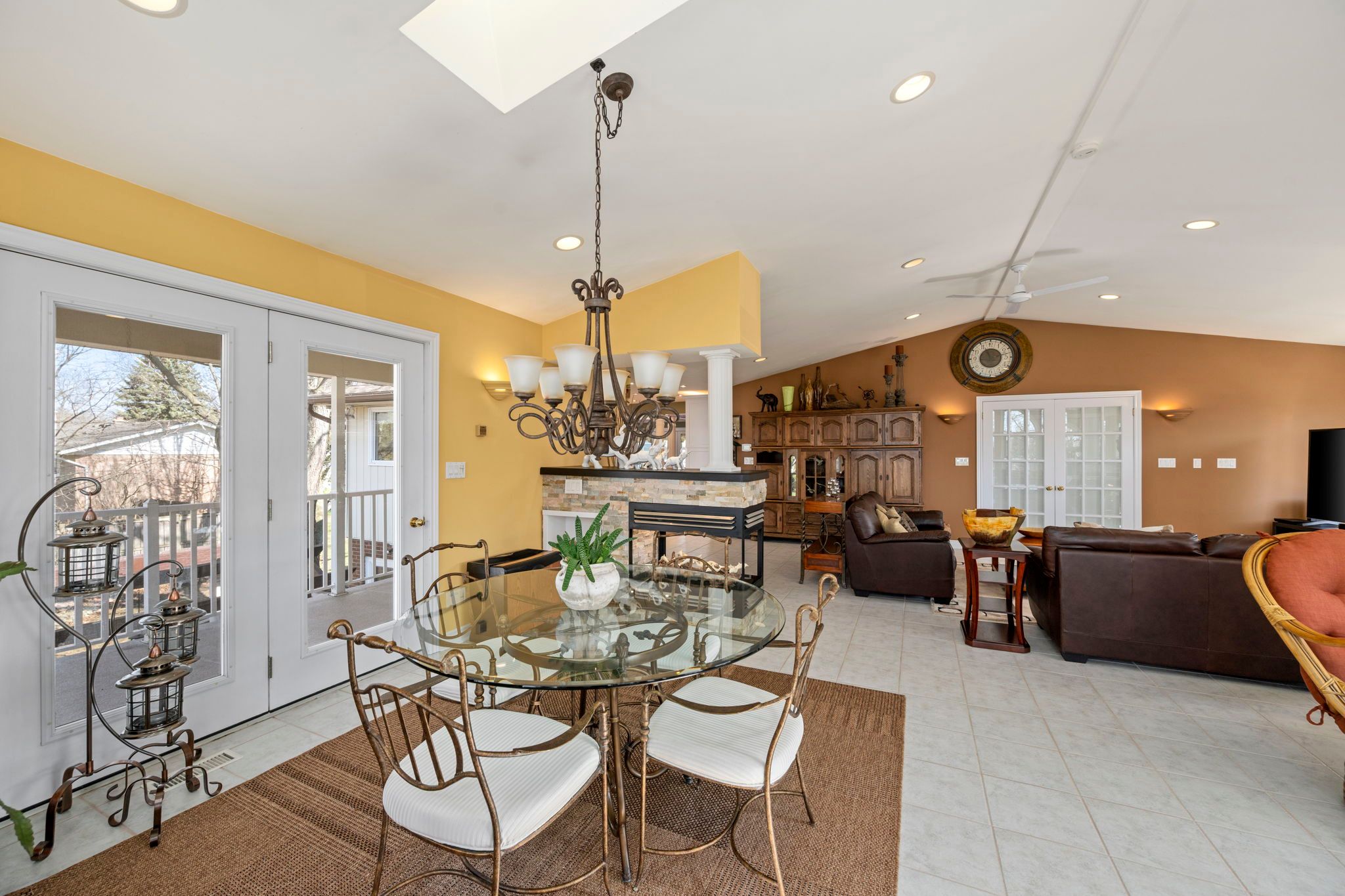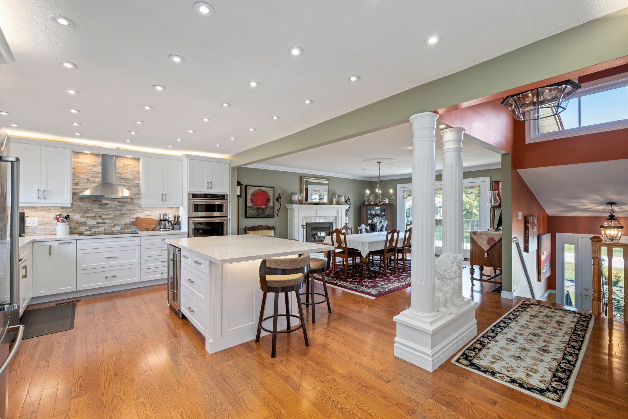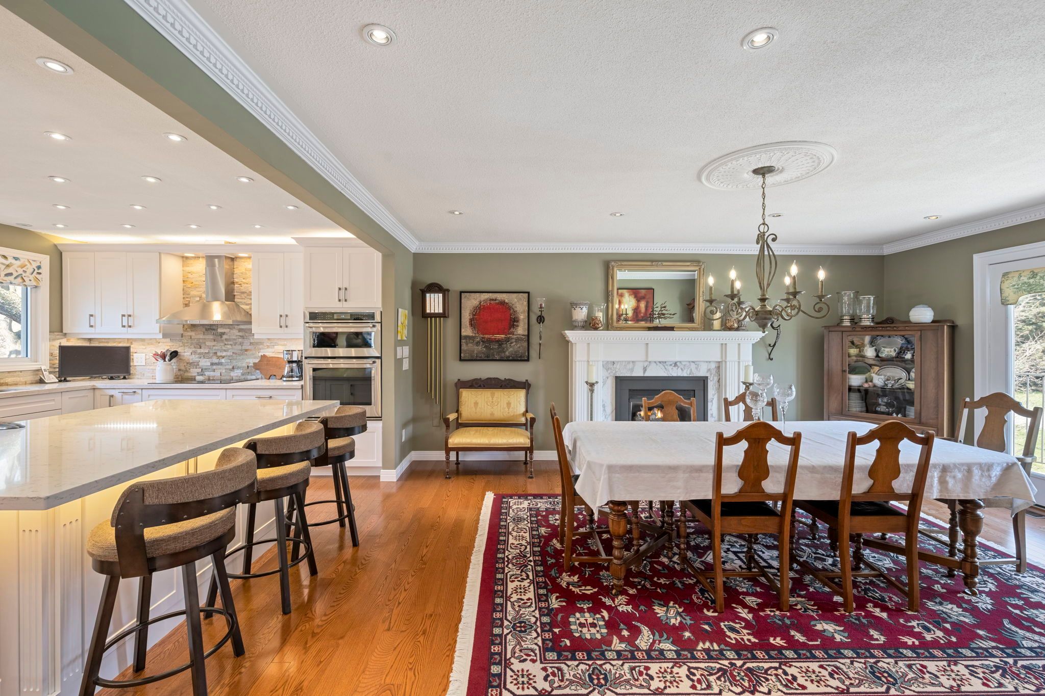 • Updated kitchen with a large island and cozy dining area featuring a gas fireplace.